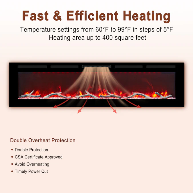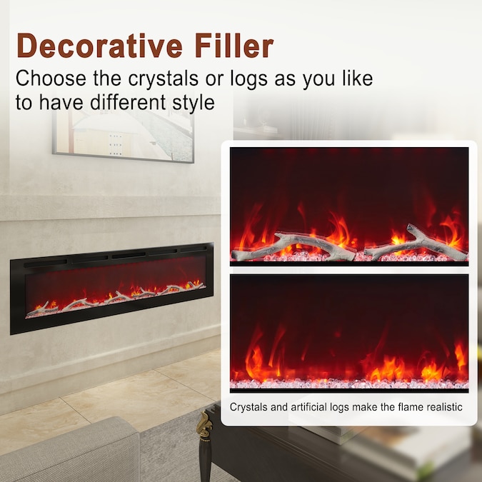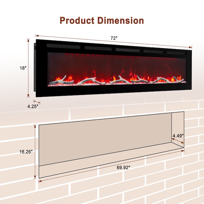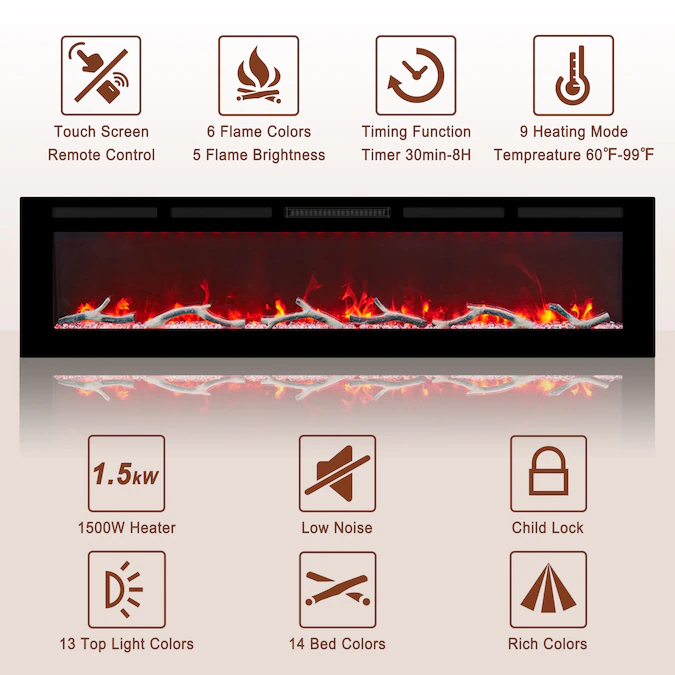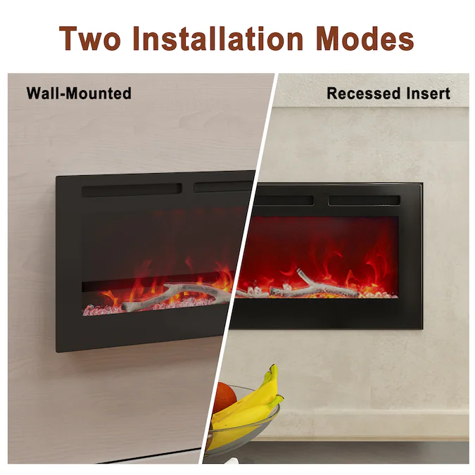 This electric fireplace is designed for wall-mounted/recessed in-wall mounting. Creating a cozy atmosphere of a traditional fireplace, this electronic fireplace has realistic flames with a real fire look. The mult flame settings radiate a soft ember glow up to an intense blaze. Control the heat and flame with the remote control or touch screen. A bit more homey and interesting to your room, it is the excellent choice, whether you want it for aesthetic or heat purposes.