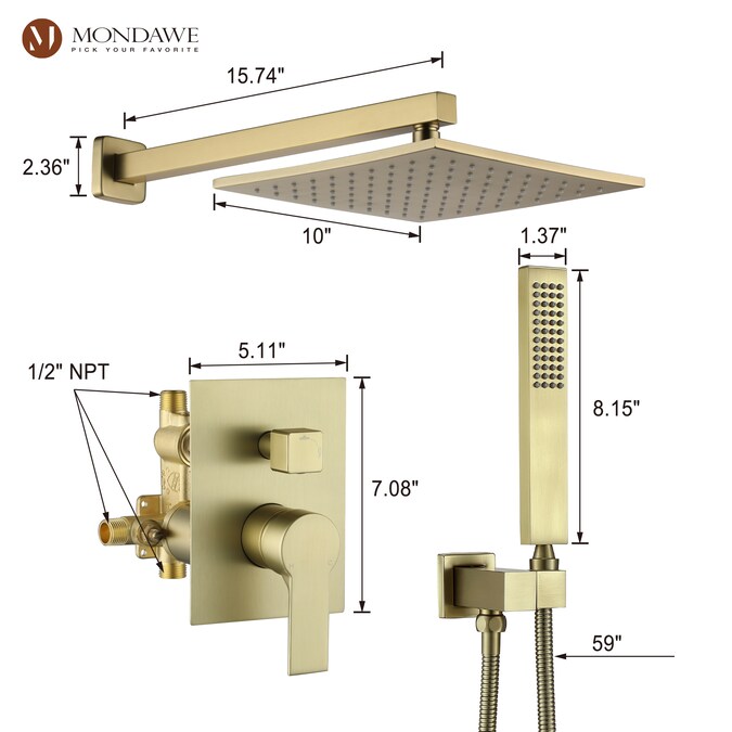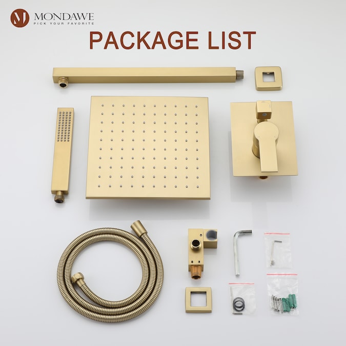 • 10 in square rain shower head brass, handheld shower head brass, 15.7 inshower arm brass, 1.5 M stainless steel shower hose, shower holder brass, shower mixer valve body brass and other necessary installation parts