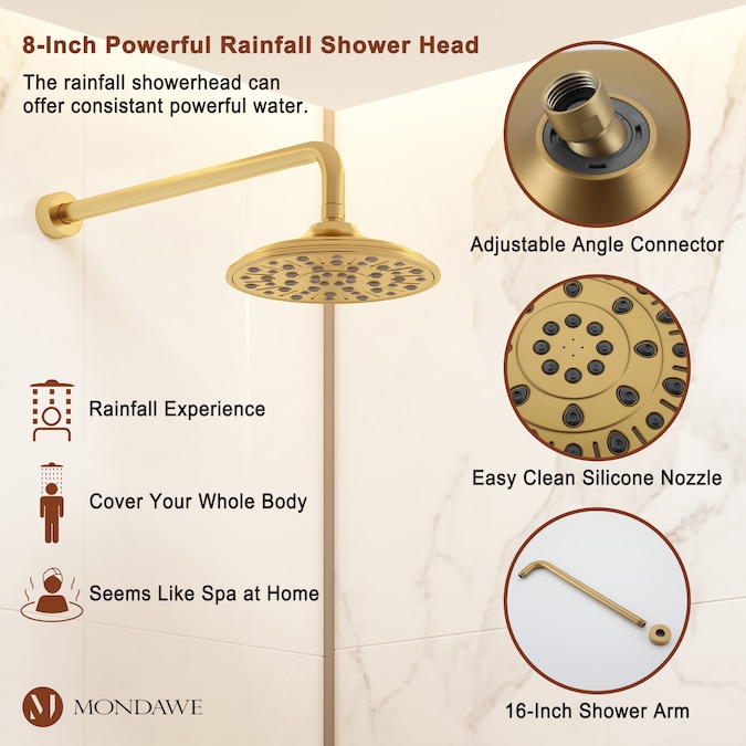 - Shower Head: 8 inches, ABS material, rain spray pattern, 2.5 GPM