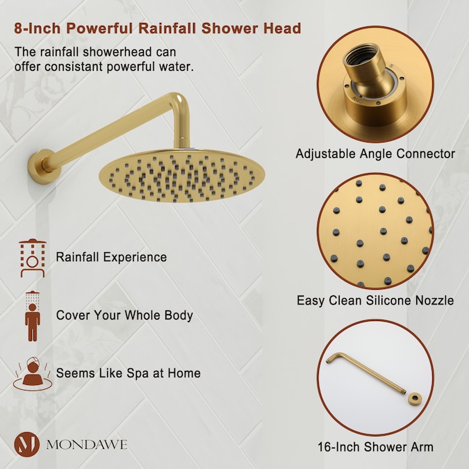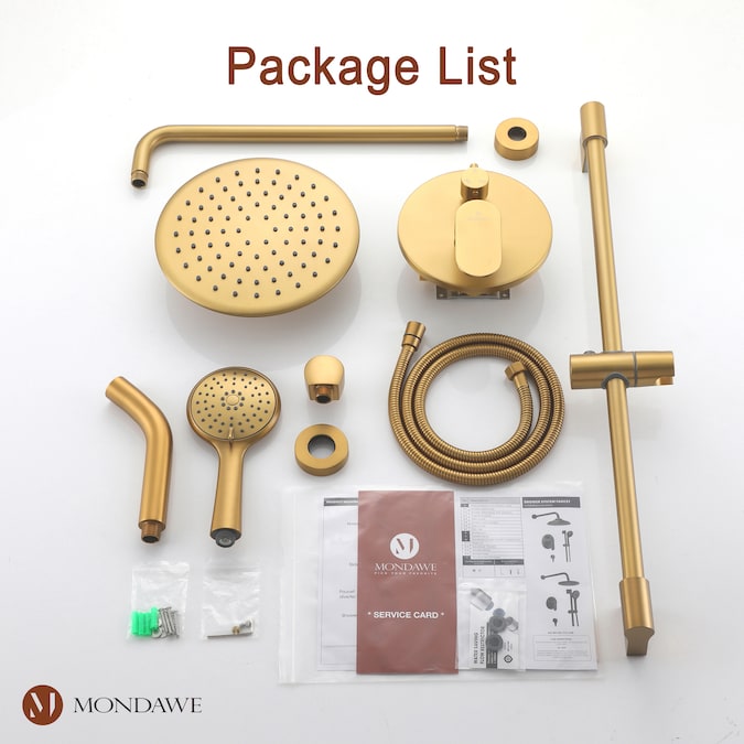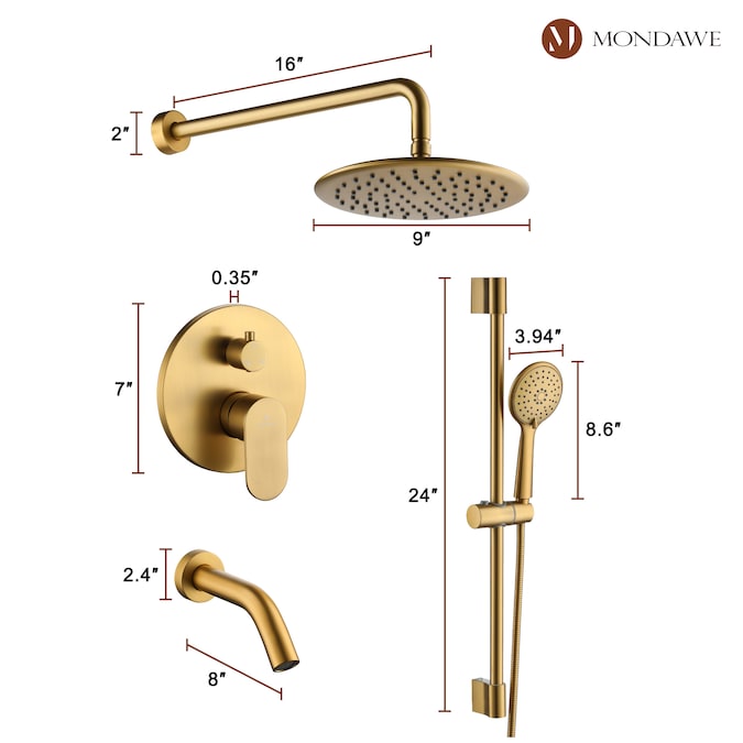 - Shower Head: 9 inches, ABS material, rain spray pattern, 2.5 GPM