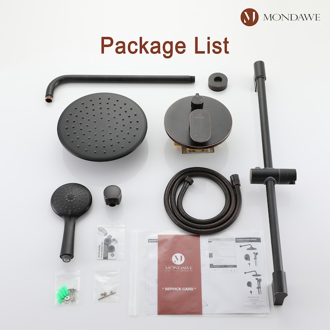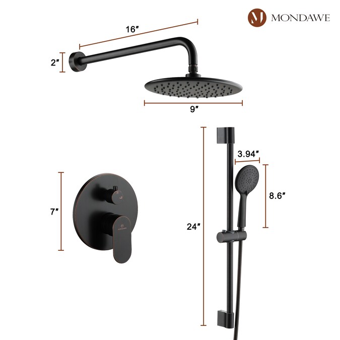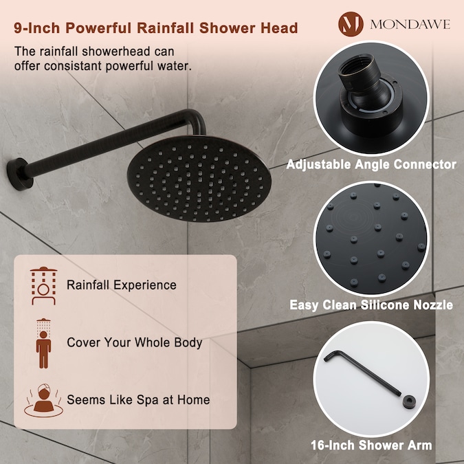 - Shower Head: 9 inches, ABS material, rain spray pattern, 2.5 GPM