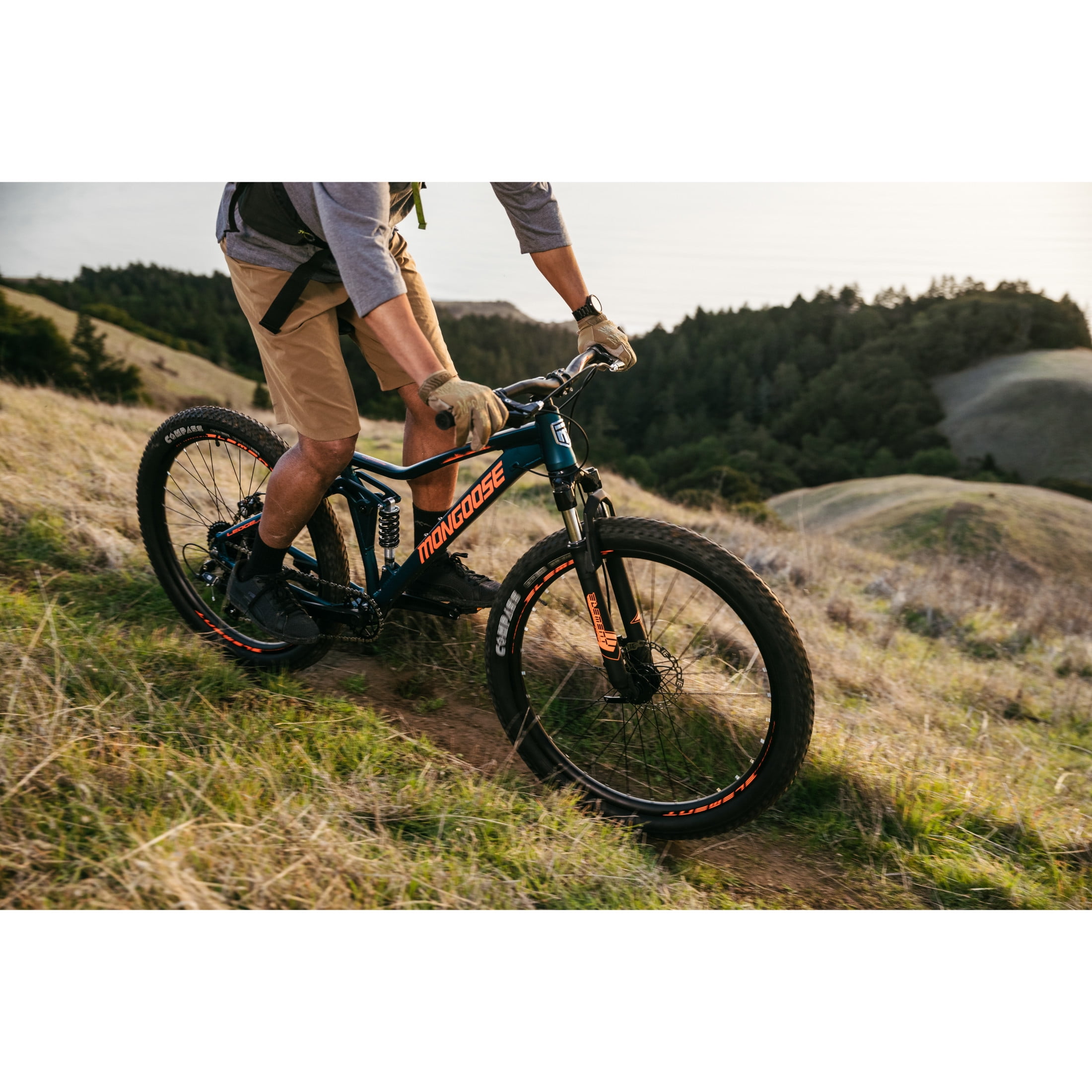 Aluminum full suspension frame and progressive trail bike geometry. 27.5-inch wheels fit riders 64 to 74 inches tall Pro Rush 1×7 wide range drivetrain, with a 14-38 freewheel and 30 tooth narrow/wide chainring Front and rear disc brakes deliver precise stopping power 27.5 x 2.60 wheels provide grip and stability out on the trail Aluminum double wall rims provide lightweight strength