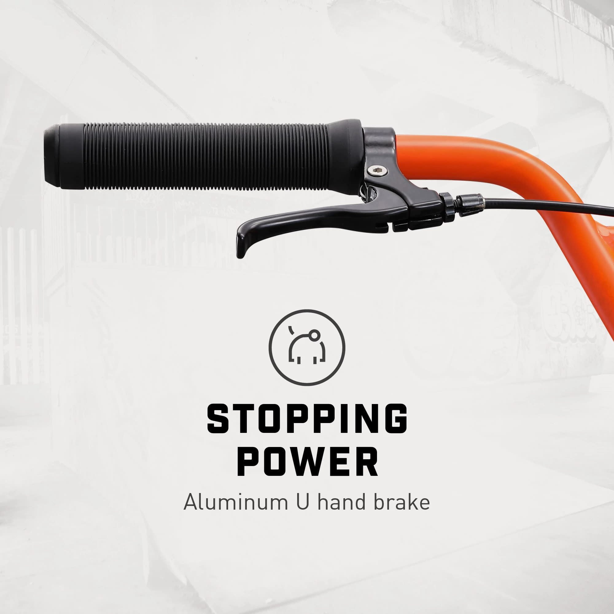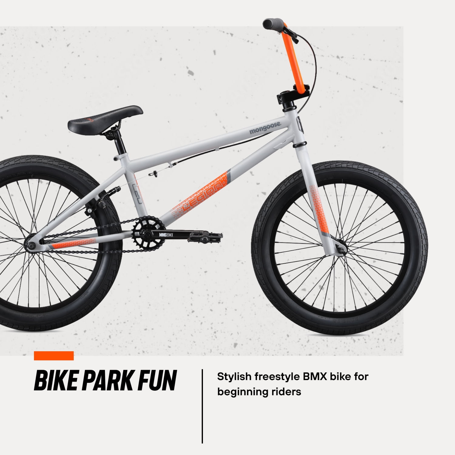 Mongoose Legion L20 Freestyle BMX Bike, 20″ Wheels, Ages 8 and up, Grey, Orange The Mongoose Legion L20 is the perfect BMX bike for kids ages 8 and up. Whether they’re riding at the park, on the street, or tackling dirt trails, this boys bike is designed to handle it all. With a durable Hi-Ten steel frame and 8” rise handlebars, it offers a great combination of strength and control, helping young riders build confidence and master new skills. The wide 2.3” BMX tires and aluminum rims provide excellent grip and durability, while the 25x9T gearing and chromoly cranks ensure smooth, reliable pedaling. The alloy U-brake and brake levers offer precise speed control, making it easy to stop and maneuver. The Hi-Ten steel BMX fork adds extra stability, maximizing performance. The Mongoose Legion L20 is the ideal kids bike for young BMX riders who are ready to take their riding to the next level! View more from us on our brand page.