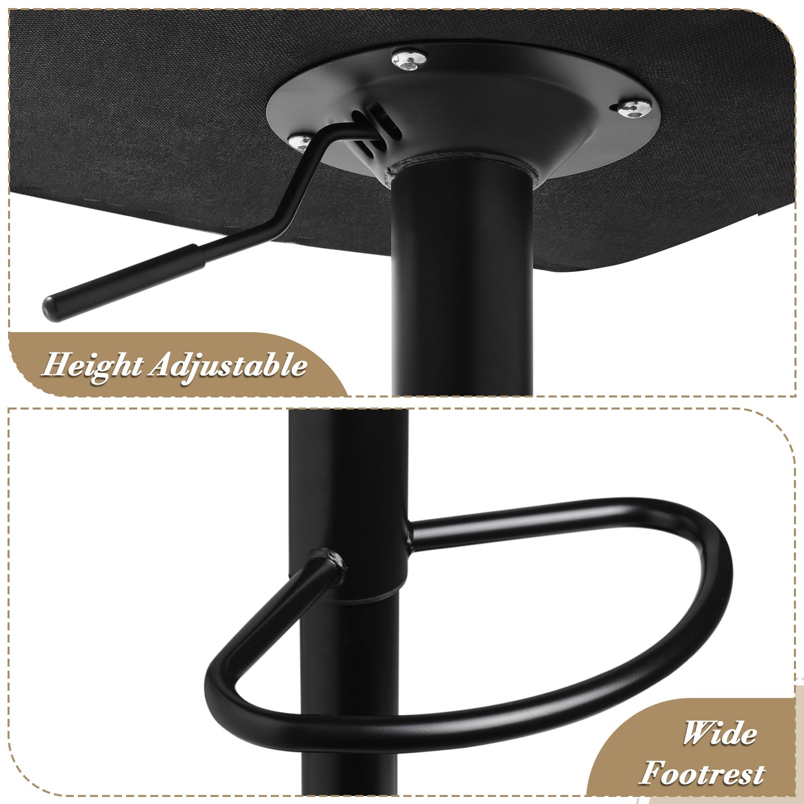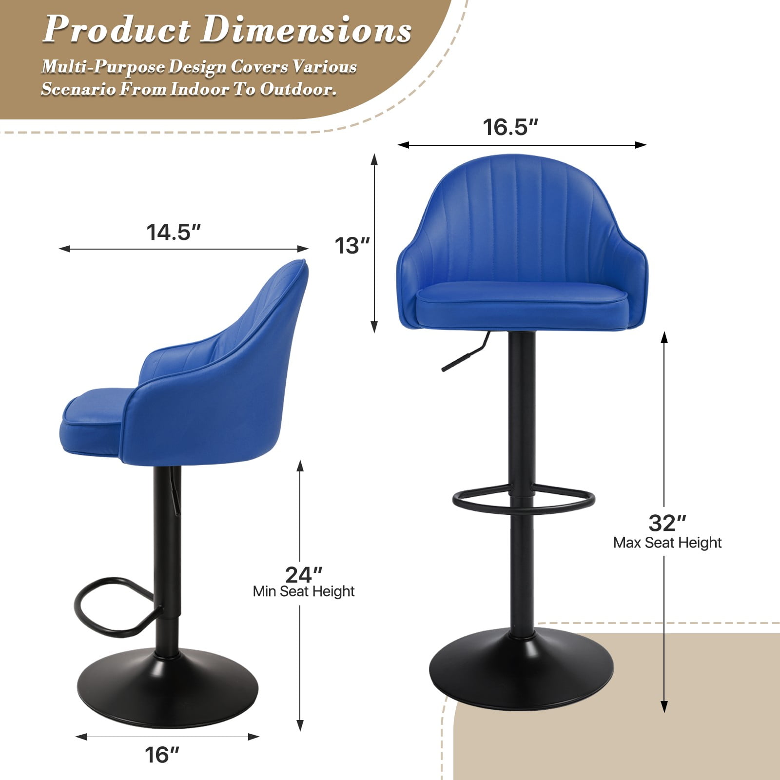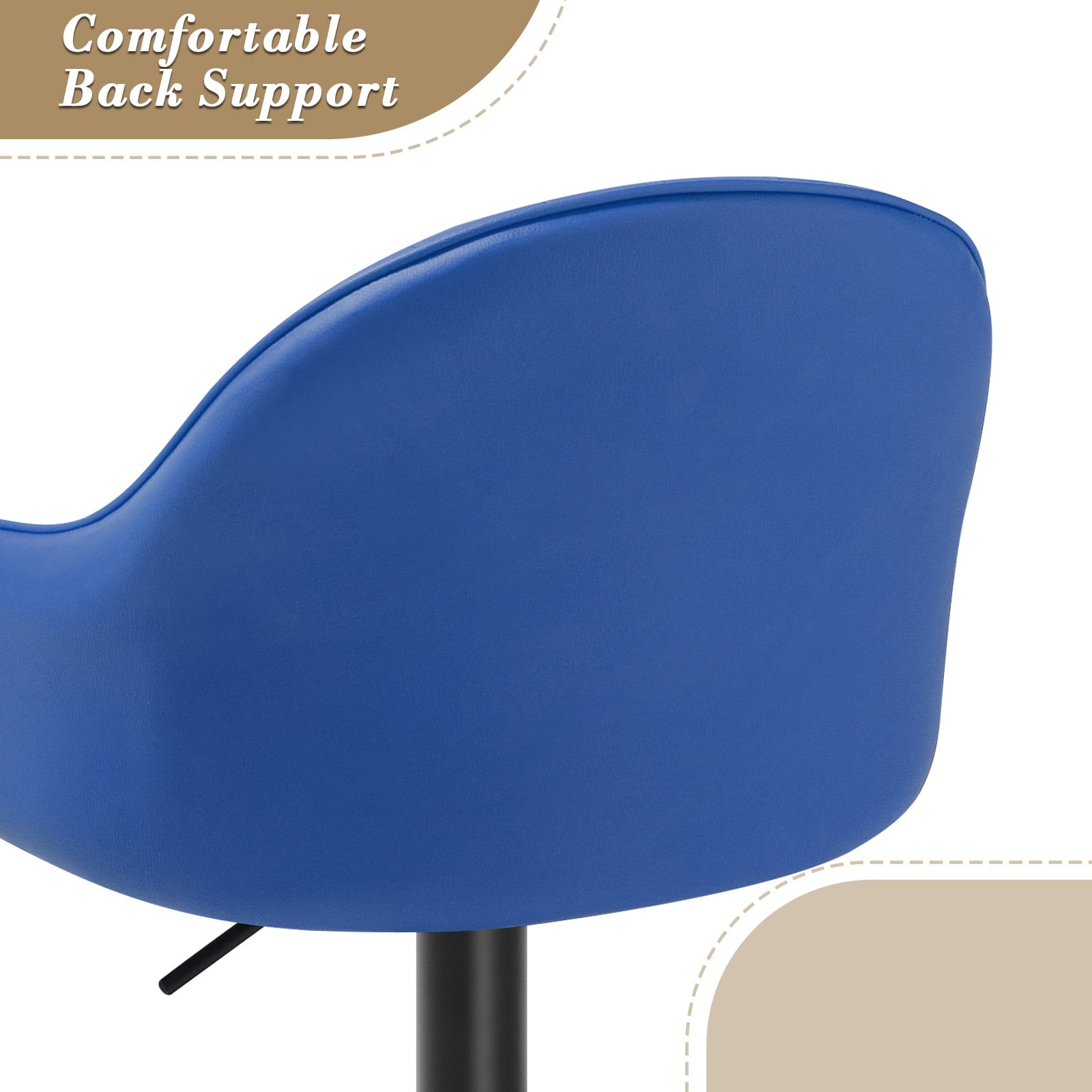 Brand: MoNiBloom Type: Bar Stool Seat Color: Blue Seat Material: Faux Leather Frame Material: Metal Overall Size: (L)19.5″ (W)18.5″ (H)36.0″ Seat Size: (L)16.5″ (W)14.5″ Seat Height – Floor to Seat: 24.0″ – 32.0″ Seat Back Height: 13.0″ Footrest Height – Footrest to Seat: 16.0″ Load Capacity: 250 lb Number of Chair: 2 360 Degrees Swivel Seat Swivel design and built-in footrest allow for effortless movement and comfort when seated. Gas-lift Mechanism Adjusts from counter to bar height, this barstool easily fits with any dining table, bar table or kitchen island. Longlasting Leather Although leather is an artificial product, aging brings out its natural patina, making it even more beautiful over time. Perfect Comfort and Support The upholstery foam is formulated to be medium-firm which is the optimal balance for that gentle, cradling feel. Engineered for even weight distribution and pressure relief. Quick Assembly All installation tools you need are included. Each barstool only needs 5 minutes to finish the assembly.