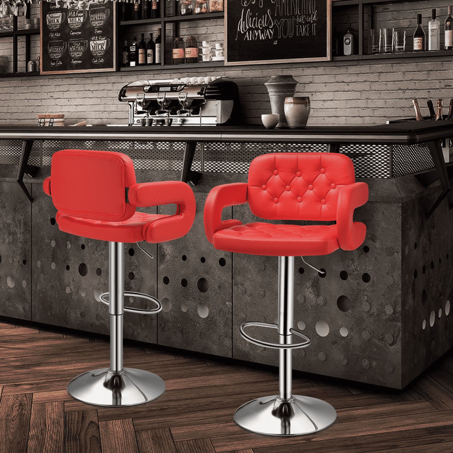 Brand: MoNiBloom Type: Bar Stool Seat Color: Red Seat Material: Faux Leather Frame Material: Metal Overall Size: (L)23.0″ (W)17.0″ (H)36.5″ Seat Size: (L)19.0″ (W)14.5″ Seat Height – Floor to Seat: 24.0″ – 32.5″ Seat Back Height: 15.5″ Footrest Height – Footrest to Seat: 16.5″ Load Capacity: 250 lb Number of Chair: 2 360 Degrees Swivel Seat Swivel design and built-in footrest allow for effortless movement and comfort when seated. Gas-lift Mechanism Adjusts from counter to bar height, this barstool easily fits with any dining table, bar table or kitchen island. Longlasting Leather Although leather is an artificial product, aging brings out its natural patina, making it even more beautiful over time. Perfect Comfort and Support The upholstery foam is formulated to be medium-firm which is the optimal balance for that gentle, cradling feel. Engineered for even weight distribution and pressure relief. Quick Assembly All installation tools you need are included. Each barstool only needs 5 minutes to finish the assembly.