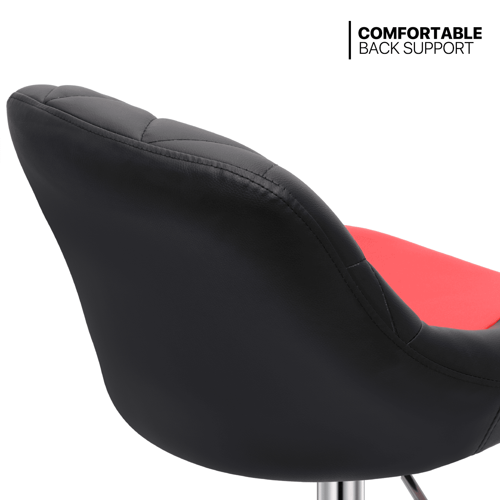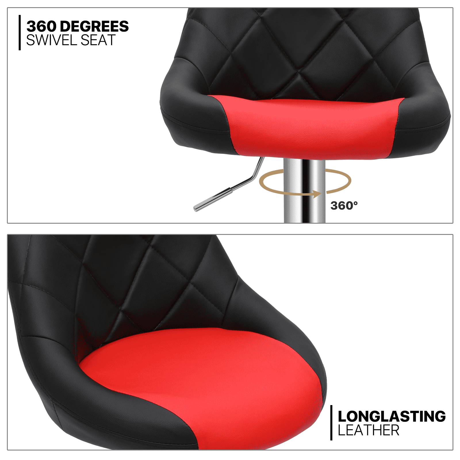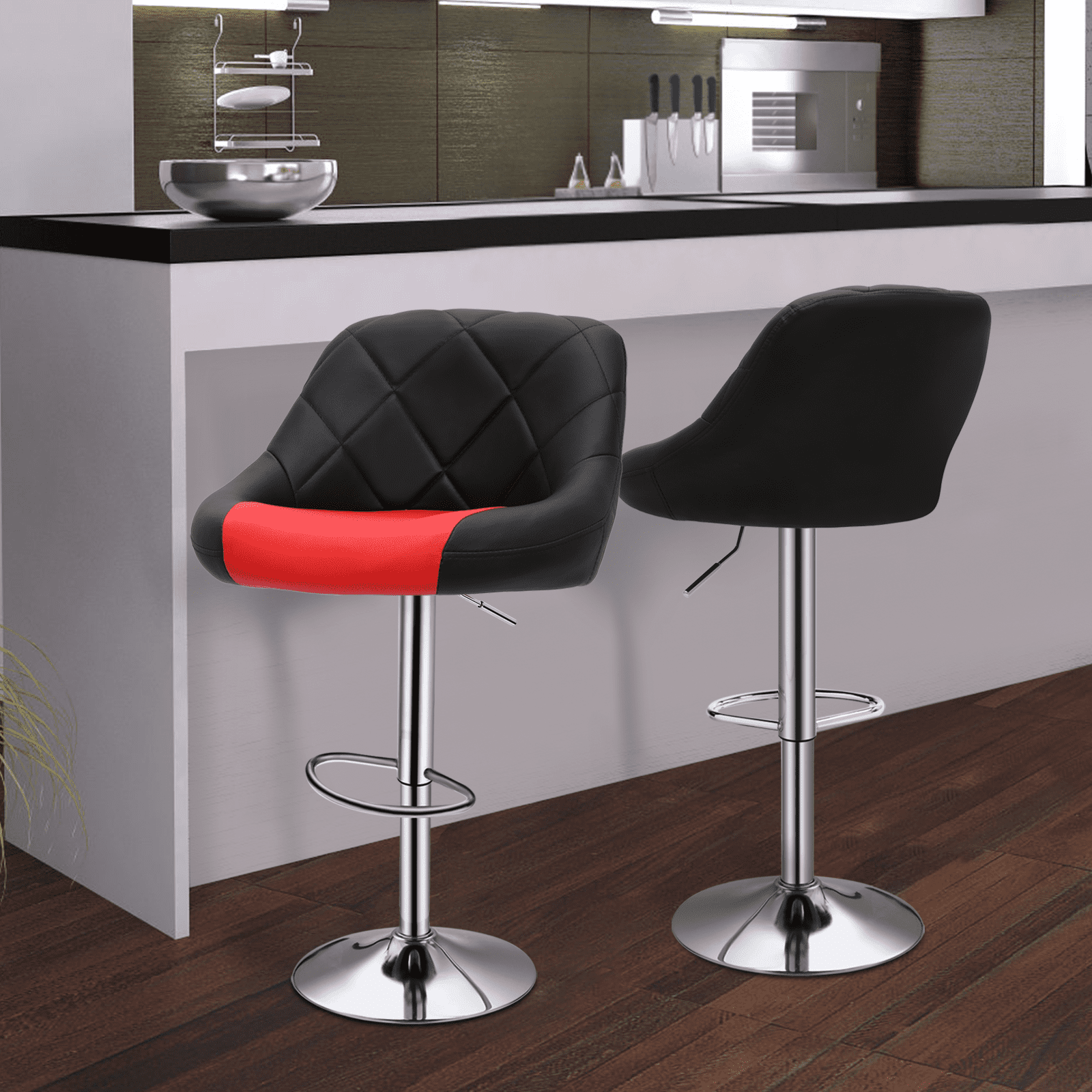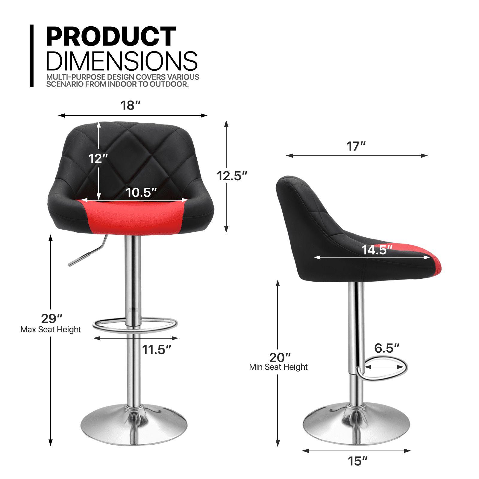 Brand: MoNiBloom Product Type: Bar Stool Color: Black (Seat); Red (Backrest) Material: Faux Leather; Chromed Steel Style: Contemporary Overall Size: (L)17.0″ (W)18.0″ (H)32.5″ Seat Size: (L)10.5″ (W)14.5″ Adjustable Seat Height: 20.0″-29.0″ Seat Back Height: 12.0″ Footrest Size: (L)11.5″ (W)6.5″ Base Diameter: 15.0″ Weight Capacity: 250 lbs Quantity: 2 Pcs Premium Materials Our bar stools are padded with high resilience sponge and covered with PU leather, the stools are ergonomically designed. This stool supports up to 250 lbs of evenly distributed weight. You can lean against the back of the stool and put your legs on the footrest for a better sitting position. Adjustable Height By raising the lever under the seat to adjust the heights easily. The lifting mechanisms works perfectly, you can adjust it to different heights and keep stable. Anti-skid and Protect Floors The sturdy round chromed steel base of our swivel bar stool has a rubber ring to prevent your floor from scratching. And rubber ring of our kitchen bar stools also prevent the harsh sound when moving the bar chairs. Longlasting Leather Although leather is an artificial product, aging brings out its natural patina, making it even more beautiful over time. Quick Assembly All installation tools you need are included. Each barstool only needs 5 minutes to finish the assembly.
