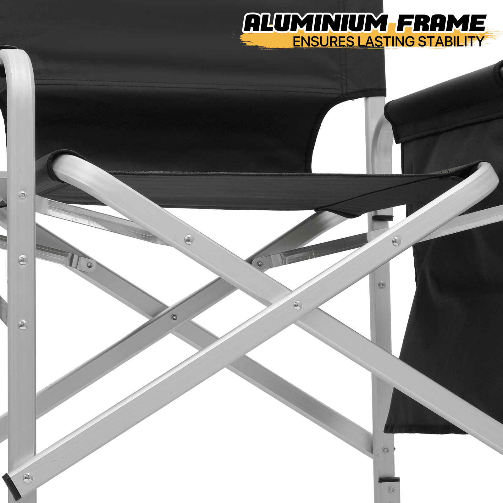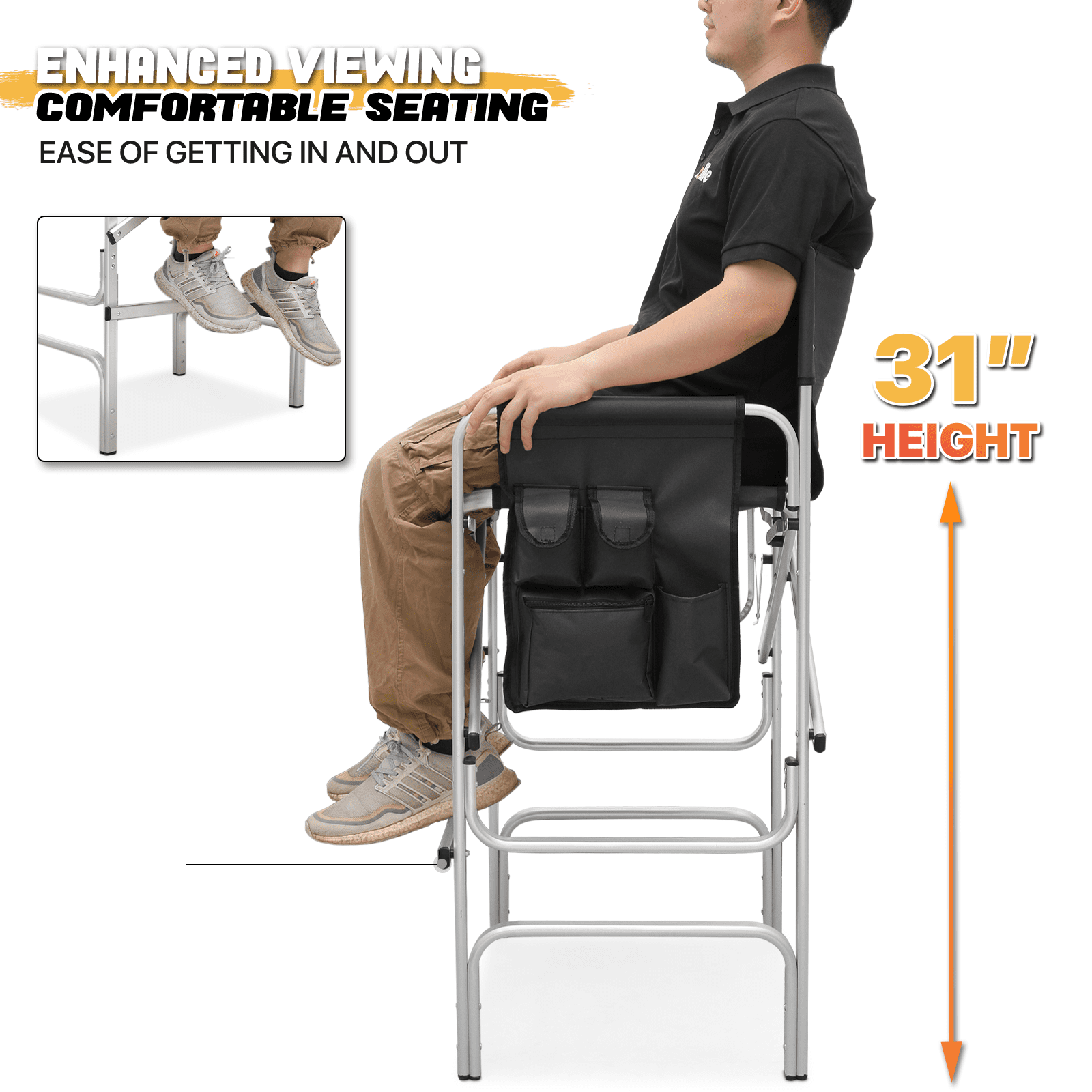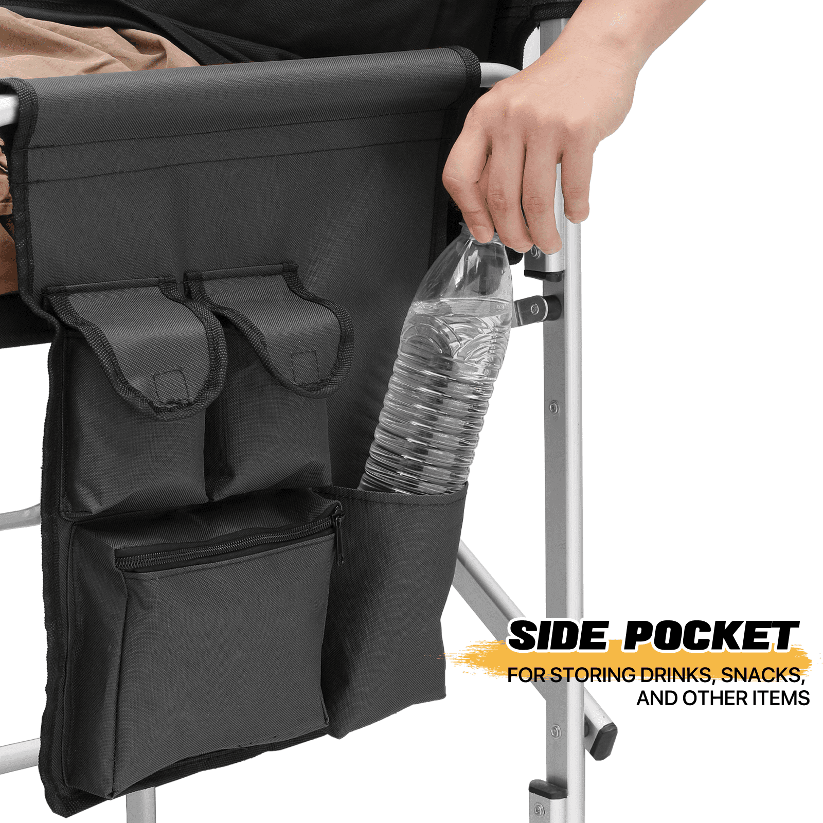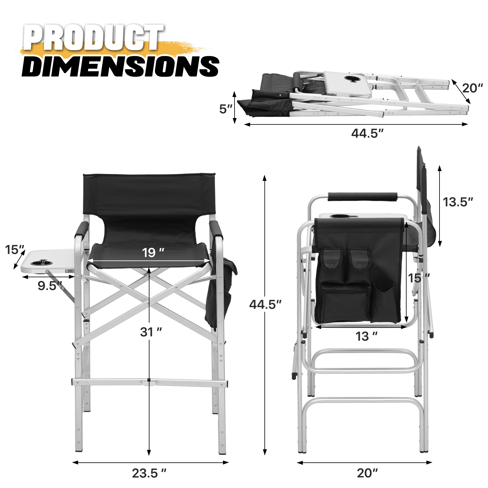Brand: MoNiBloom Type: Folding Camping Director Chair Color: Black Chair Material: 600D Oxford Frame Material: Aluminium Armrests Material: Tube with Oxford Cloth Overall Size: (L)33″ (W)17″ (H)44.5″ Folding Size: (L)20″ (W)5″ (H)44.5″ Cup Holder: Side Folding Table with Cup Holder Seat-to-floor Height: 31″ Storage Area: Multi-functional Side Pocket (Size: 13″×15″) Seat Size: (L)19″ (W)15.5″ Seat Back Height: 13.5″ Weight Capacity: 250lbs Built for Comfort and Durability Crafted with a high-strength aluminum tube frame and 600D Oxford Fabric, this chair supports up to 250 lbs. Its full back design and cushioned armrests provide the ultimate seating experience. Enjoy an extra-wide seat and high backrest for added comfort. Unmatched Comfort The chair offers foam-padded armrests for support and a steel footrest for relaxed lounging. The seat and back are designed as one full piece to maximize comfort, making standing and sitting an effortless task. Integrated Storage & Workspace Keep your essentials handy with the retractable side table, built-in cup holder, and mesh pockets. Whether you’re storing drinks, snacks, phones, or makeup tools, everything is within reach. Effortless Portability With its foldable design and an included carry bag, transporting this chair is a breeze. Set-up requires only the simple attachment of the chair’s footrest. Versatile Workspace This director’s chair serves as the ideal assistant for beauty makeup artists and professionals in the entertainment industry. Elevate your perspective to better oversee projects or audiences, while also improving your work efficiency. Professional-Grade Its elevated height and side table workspace make this chair not just an outdoor accessory, but also an ideal choice for trade shows, art and craft fairs, makeup booths, and more. Quick Setup & Takedown Setting up or packing this chair is as easy as a one-step process. Simply step on the bottom tube and pull up to fold, offering convenient storage and portability for all your outdoor activities.