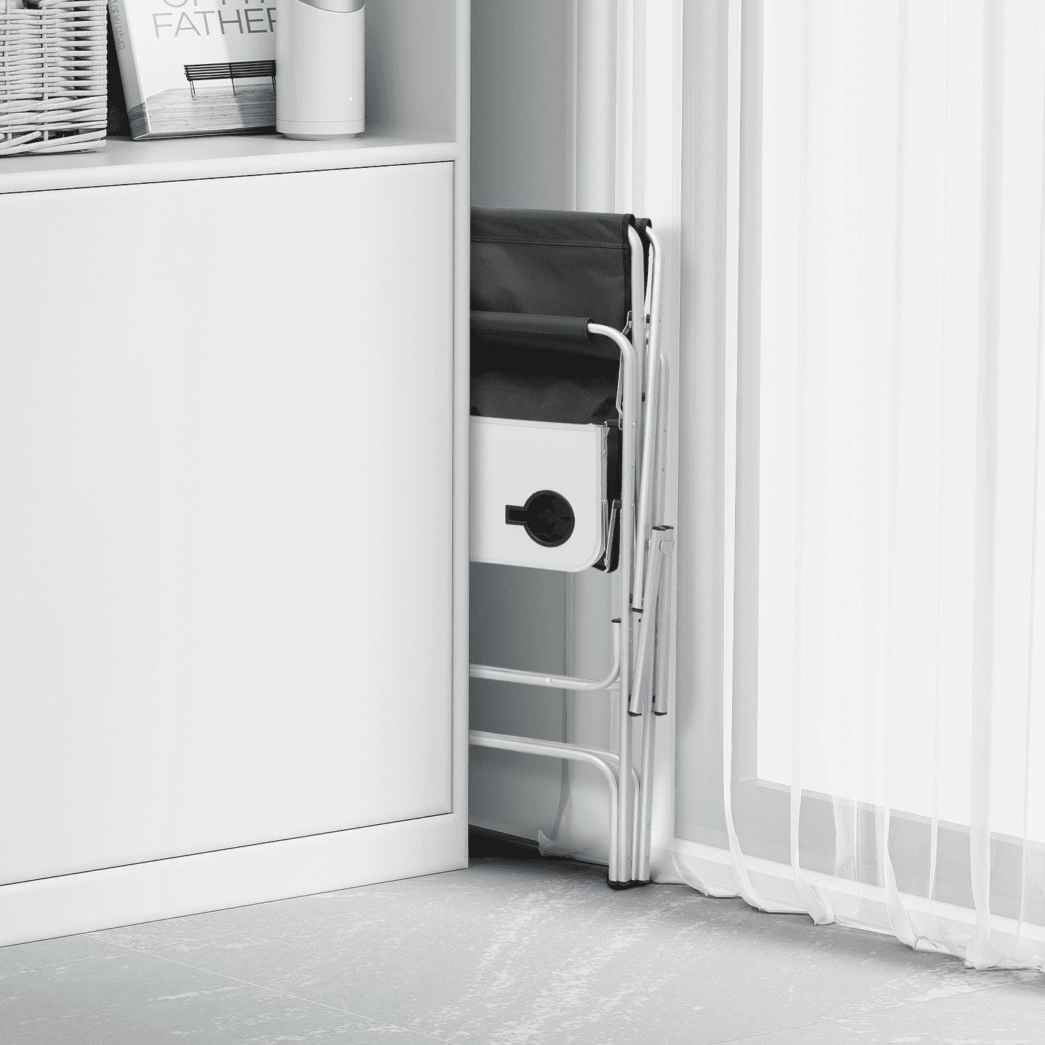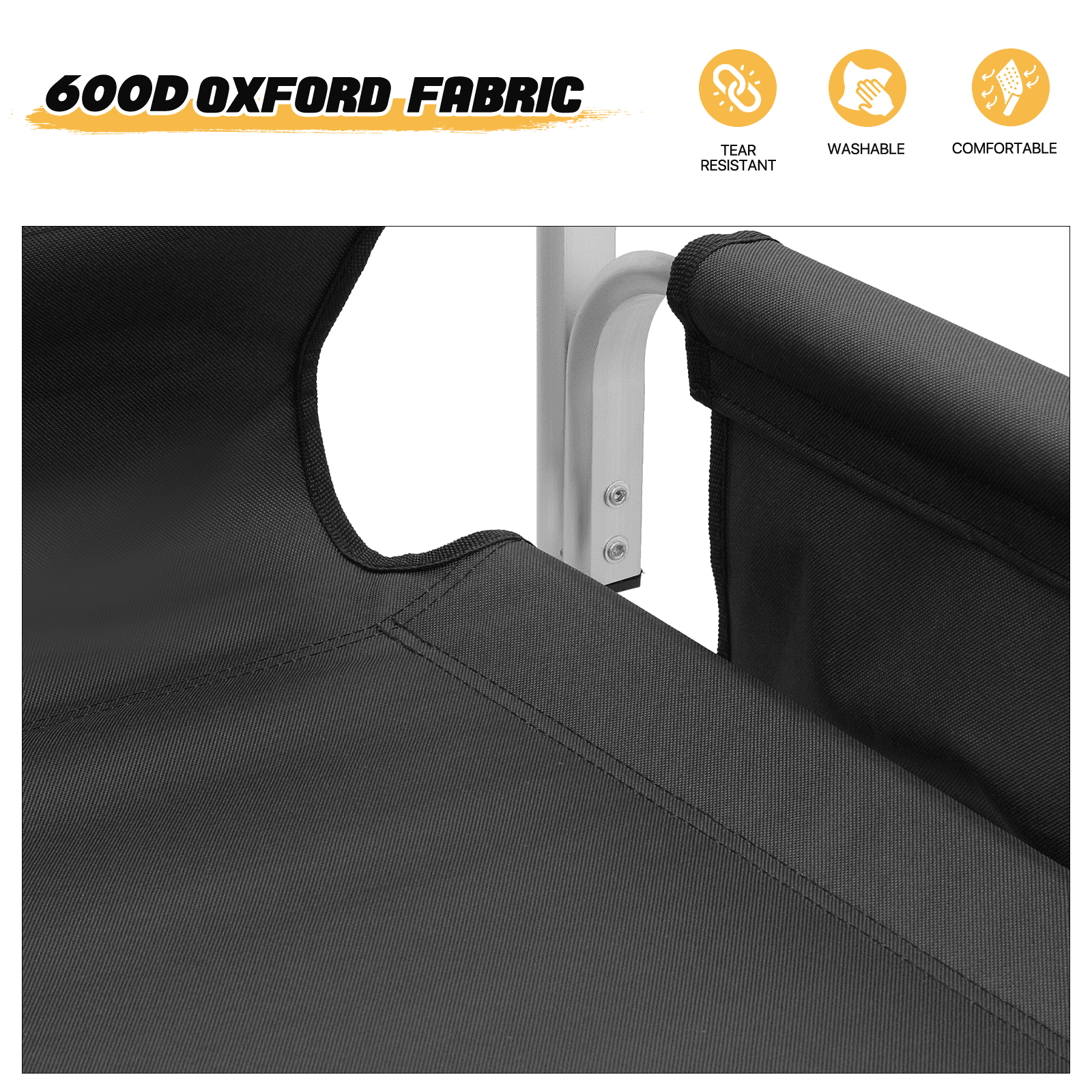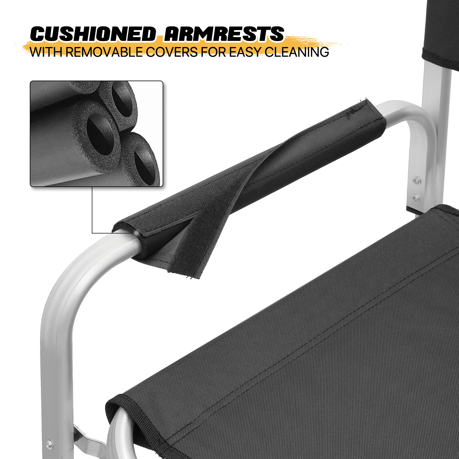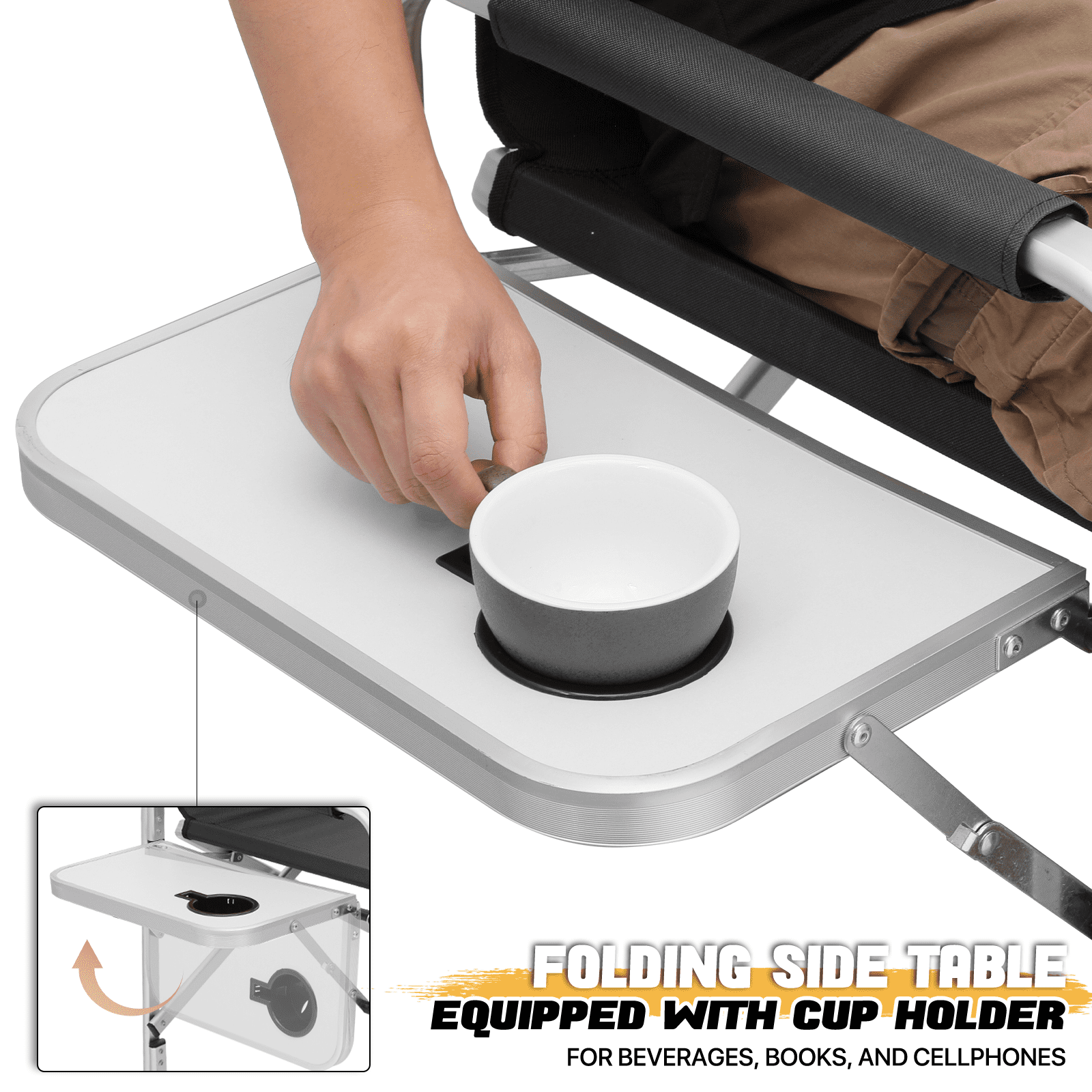 Brand: MoNiBloom Type: Folding Camping Director Chair Color: Black Chair Material: 600D Oxford Frame Material: Aluminium Armrests Material: Tube with Oxford Cloth Overall Size: (L)33″ (W)17″ (H)44.5″ Folding Size: (L)20″ (W)5″ (H)44.5″ Cup Holder: Side Folding Table with Cup Holder Seat-to-floor Height: 31″ Storage Area: Multi-functional Side Pocket (Size: 13″×15″) Seat Size: (L)19″ (W)15.5″ Seat Back Height: 13.5″ Weight Capacity: 250lbs Built for Comfort and Durability Crafted with a high-strength aluminum tube frame and 600D Oxford Fabric, this chair supports up to 250 lbs. Its full back design and cushioned armrests provide the ultimate seating experience. Enjoy an extra-wide seat and high backrest for added comfort. Unmatched Comfort The chair offers foam-padded armrests for support and a steel footrest for relaxed lounging. The seat and back are designed as one full piece to maximize comfort, making standing and sitting an effortless task. Integrated Storage & Workspace Keep your essentials handy with the retractable side table, built-in cup holder, and mesh pockets. Whether you’re storing drinks, snacks, phones, or makeup tools, everything is within reach. Effortless Portability With its foldable design and an included carry bag, transporting this chair is a breeze. Set-up requires only the simple attachment of the chair’s footrest. Versatile Workspace This director’s chair serves as the ideal assistant for beauty makeup artists and professionals in the entertainment industry. Elevate your perspective to better oversee projects or audiences, while also improving your work efficiency. Professional-Grade Its elevated height and side table workspace make this chair not just an outdoor accessory, but also an ideal choice for trade shows, art and craft fairs, makeup booths, and more. Quick Setup & Takedown Setting up or packing this chair is as easy as a one-step process. Simply step on the bottom tube and pull up to fold, offering convenient storage and portability for all your outdoor activities.