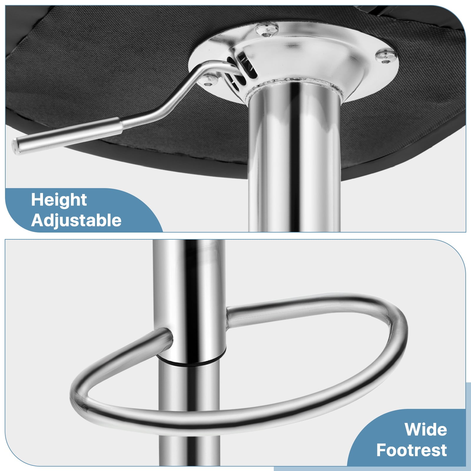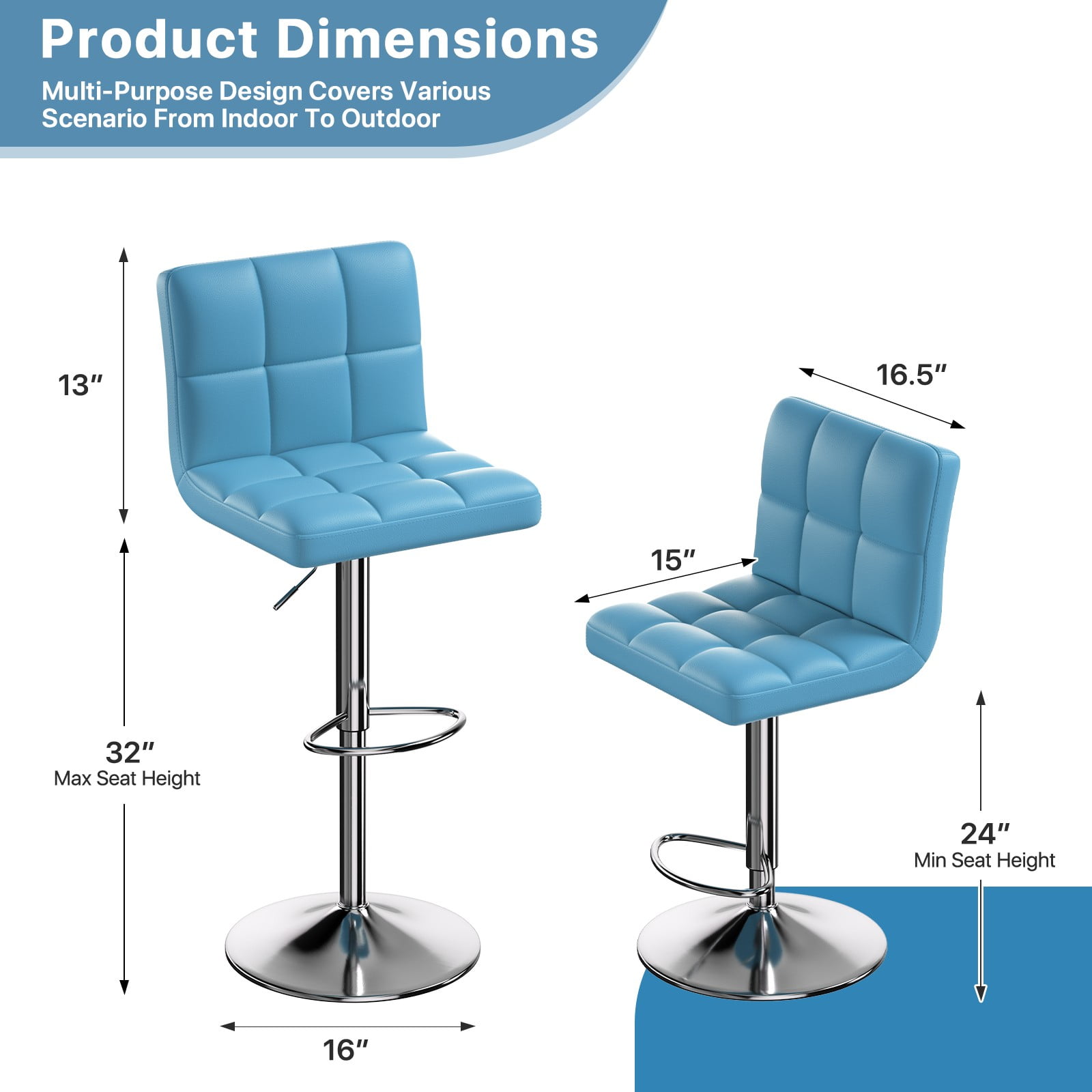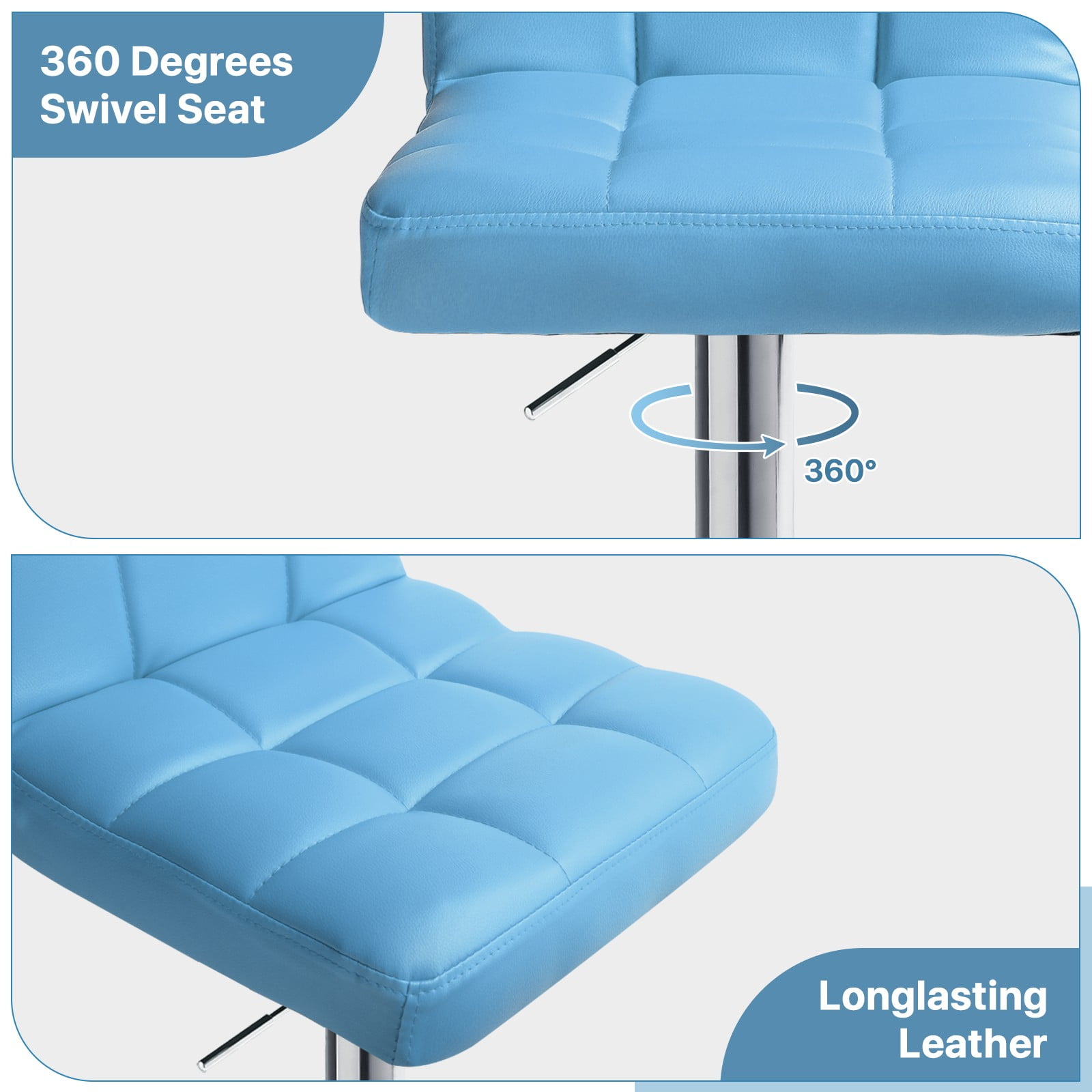 Brand: MoNiBloom Type: Bar Stool Seat Color: Blue Seat Material: Faux Leather Frame Material: Metal Overall Size: (L)20.5″ (W)17.0″ (H)37.0″ Seat Size: (L)16.5″ (W)15.0″ Seat Height – Floor to Seat: 24.0″ – 32.0″ Seat Back Height: 13.0″ Footrest Height – Footrest to Seat: 16.5″ Load Capacity: 250 lb Number of Chair: 2 360 Degrees Swivel Seat Swivel design and built-in footrest allow for effortless movement and comfort when seated. Gas-lift Mechanism Adjusts from counter to bar height, this barstool easily fits with any dining table, bar table or kitchen island. Longlasting Leather Although leather is an artificial product, aging brings out its natural patina, making it even more beautiful over time. Perfect Comfort and Support The upholstery foam is formulated to be medium-firm which is the optimal balance for that gentle, cradling feel. Engineered for even weight distribution and pressure relief. Quick Assembly All installation tools you need are included. Each barstool only needs 5 minutes to finish the assembly.