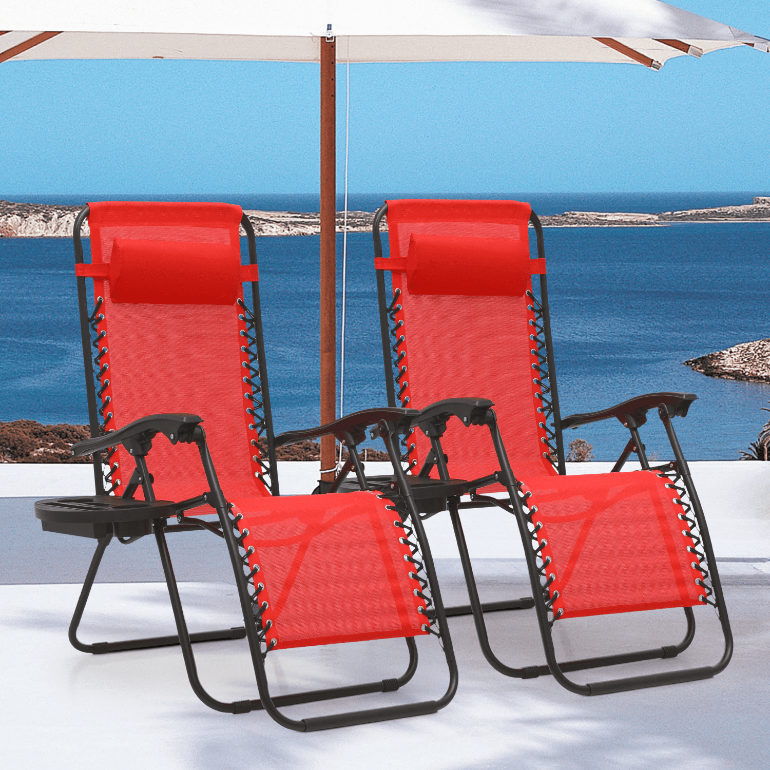 MoNiBloom Patio Zero Gravity Chair Set of 2, Folding Adjustable Reclining Beach Lawn Lounger with Pillow and Cup Holder, Red