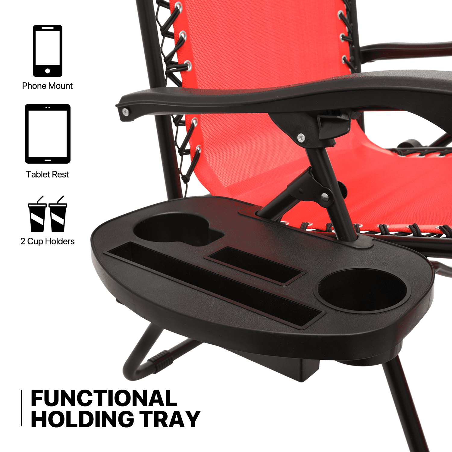 Brand: MoNiBloom Type: Zero Gravity Chair Chair Fabric Material: Textile Mesh Frame Material: Iron Color: Red Frame Durability: Water Resistant Headrest: Adjustable Detachable Pillow Chair Folding Size: (L)37.0″ (W)5.0″ (H)25.0″ Chair Overall Size: (L)25.0″ (W)26.0″ (H)43.5″ Weight Capacity: 330 lbs Package: Includes 2 chairs Premium Materials Made of high-quality textile mesh on a durable iron frame to provide optimal support and a uniquely comfortable sitting experience. Strong double bungee rope is durable for using a long time. Breathable fabric offer a cool experience in a hot summer day. Adjustable Locking System Our zero-gravity lounge chair has an adjustable design that can be adjusted from 95 to 140 degree angle. This amazing feature helps you select the optimal angle that brings you to a comfortable, relaxing position. This outdoor recliner features easy-to-use twist knobs effortlessly locks to chair in any position. Firmly and securely fixed in the gear. Detachable Tray These zero gravity chairs are equipped with durable plastic accessory tray providing perfect place to set drinks, magazines, phones/tablet’s, or other small items for convenient accessibility. Adjustable Headrest These recliners are designed according to ergonomics to reduce muscle tension and stress. The removable headrest could relieve the pressure of cervical vertebra or use as a support of lumbar. You will feel comfortable when you lying down. Easy to Store The zero gravity chair is compact and versatile. Lightweight and folding design for easy transportation and storage, makes these an easy addition to your next trip to the park, beach, or your child’s next sporting event. No Assemble Needed The zero gravity chairs come fully assembled and folded of the zero gravity recliner. The only thing you need to do is getting them out of the boxes. Then you can use them and will have a nice nap. Wide Range of Application Widely used in beach, pool, courtyard, balcony, lawn and other scenes.