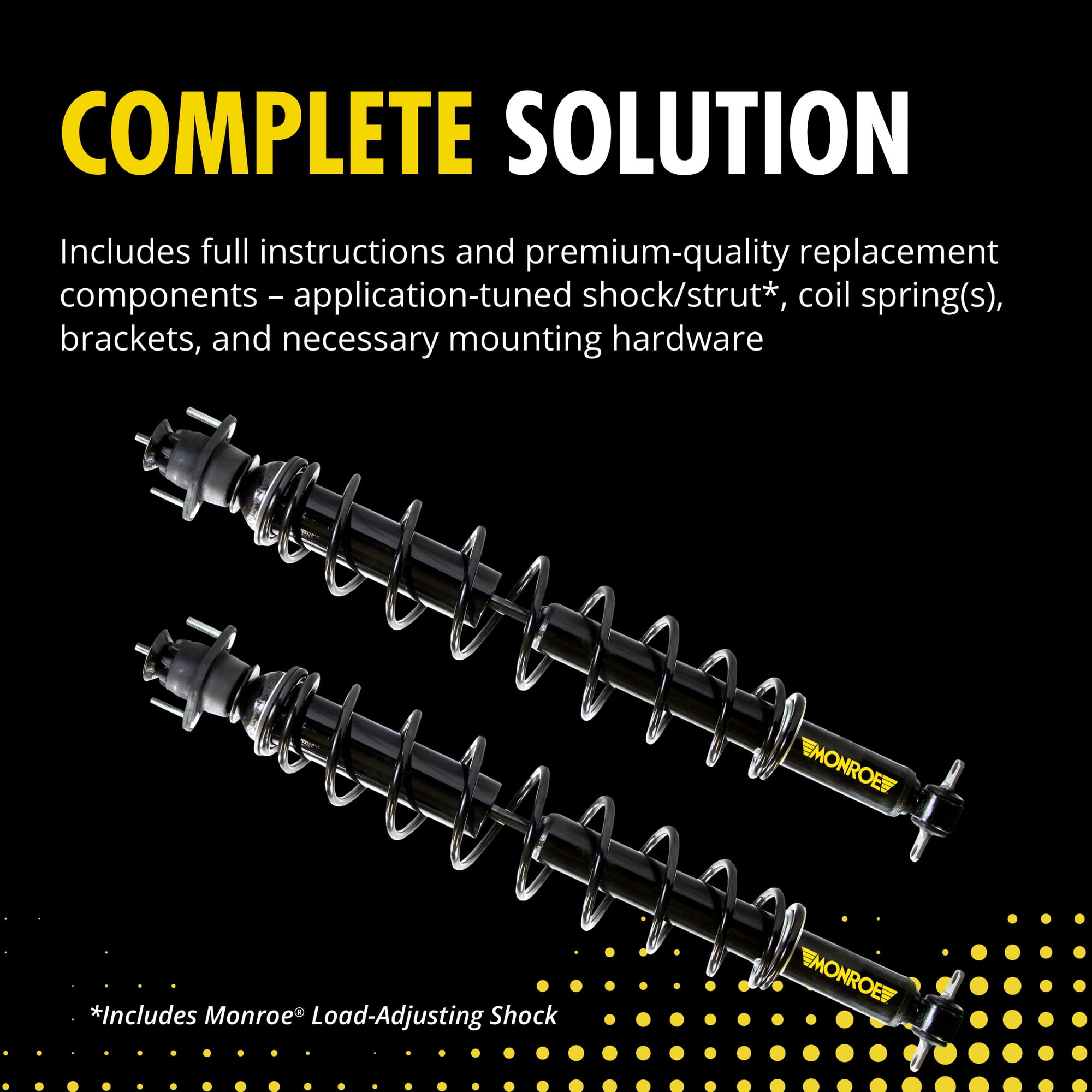 CONVERT YOUR RIDE — A cost-effective alternative to replacing the OE system, this conversion kit converts a factory air to a conventional suspension COMPLETE SOLUTION — Includes full instructions and premium-quality replacement components – application-tuned shock/strut, coil spring(s), brackets, and necessary mounting hardware EASY TO INSTALL — Engineered for superior fit and trouble-free bolt-on installation KEEPS AIR SUSPENSION LIGHT OFF — A complete solution to keep the air suspension light off IMPROVED RIDE AND HANDLING — Provides application specific tuning for added control while heavy gauge calibrated coil spring provides maximum performance without an increase in ride harshness INCLUDES MONROE® LOAD-ADJUSTING SHOCK — Assists in maintaining ride height when loaded with additional weight of up to 1,2 lbs (capacity is limited by vehicle suspension, tires, and transmission – see vehicle owner’s manual for details)