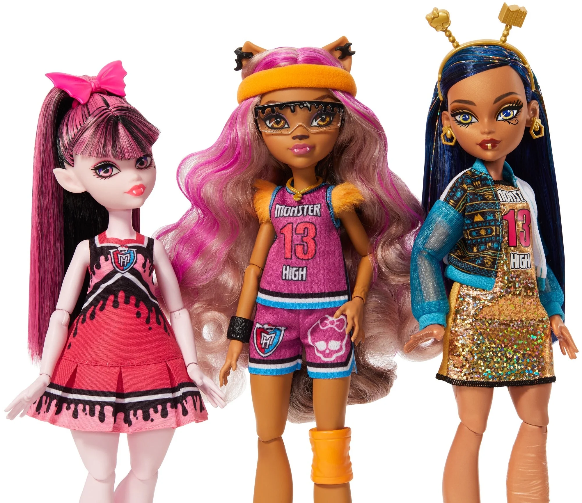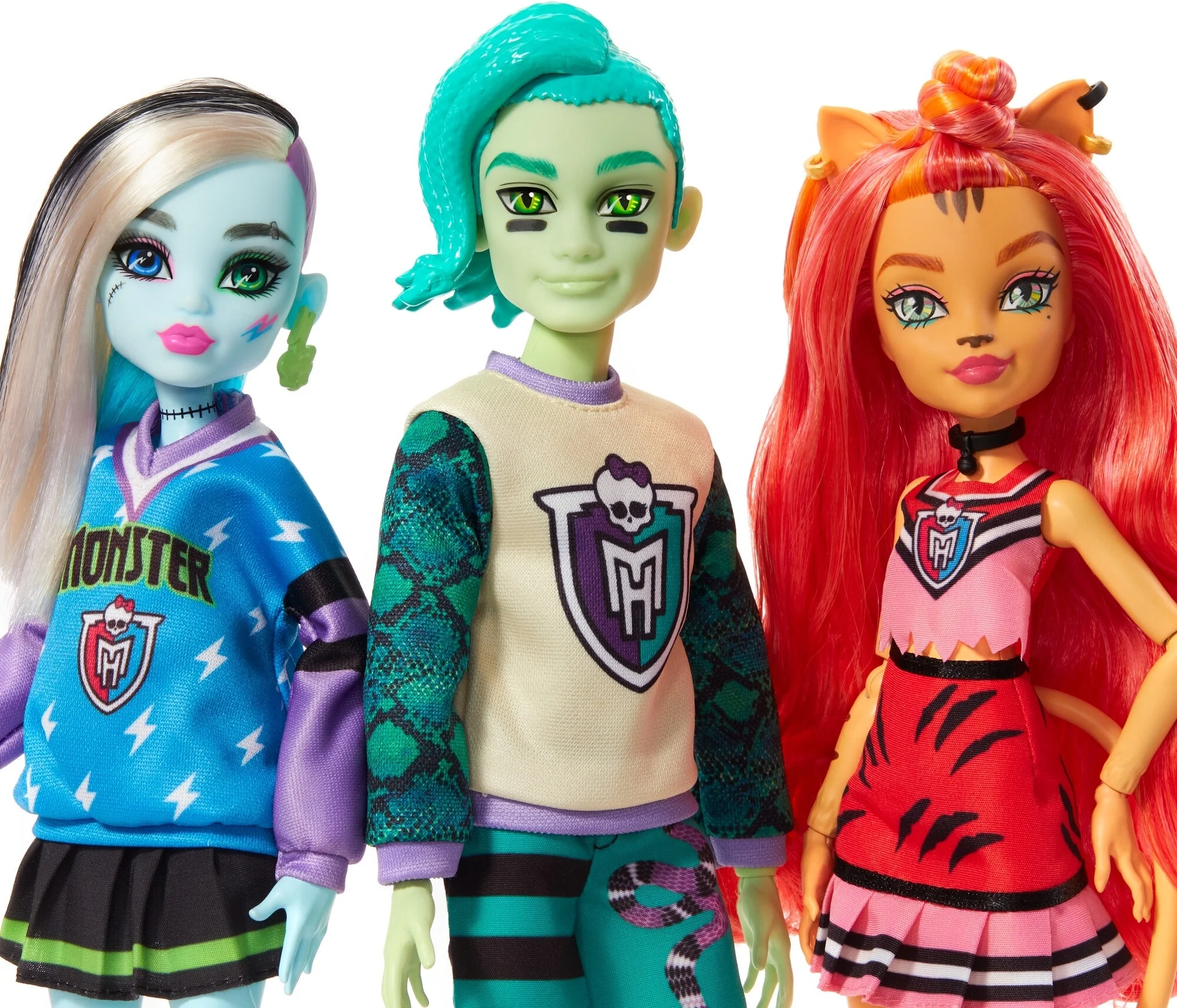 Let’s scream for the Monster High casketball team! Clawdeen Wolf, Draculaura, Frankie Stein, Cleo De Nile, Deuce Gorgon, and Toralei Stripe flaunt scaretastic spirit Head fearleader Draculaura doll vamps up the crowd’s enthusiasm with pom poms, while her fiercely fashionable feline squad mate Toralei Stripe doll screams into a megaphone With an orange headband holding back her gore-geous curls, Clawdeen Wolf doll leaps across the gym in a purple blur and scores another point for the casketball team! Frankie Stein doll cheers for their werewolf bestie with a foam claw and their new stompin’ boots! They sport an electrifying asymmetric haircut and a doodled-on bionic leg Cleo De Nile doll wears a glittering jersey dress, varsity jacket, and gold antennae that match her strappy sandals. Not to be outdone by anyone in spirit, she waves a Monster High flag overhead! Deuce Gorgon doll rocks a colorblock sweatshirt and creeperific joggers. Proudly holding a skullette prop, he can’t wait to hit up his favorite haunts with the crew after the game We’ve got ghoul spirit how ‘bout you?! This fab-boo-lous Ghoul Spirit set offers fans the chance to collect six Monster High dolls in drop dead, never-before seen fashions