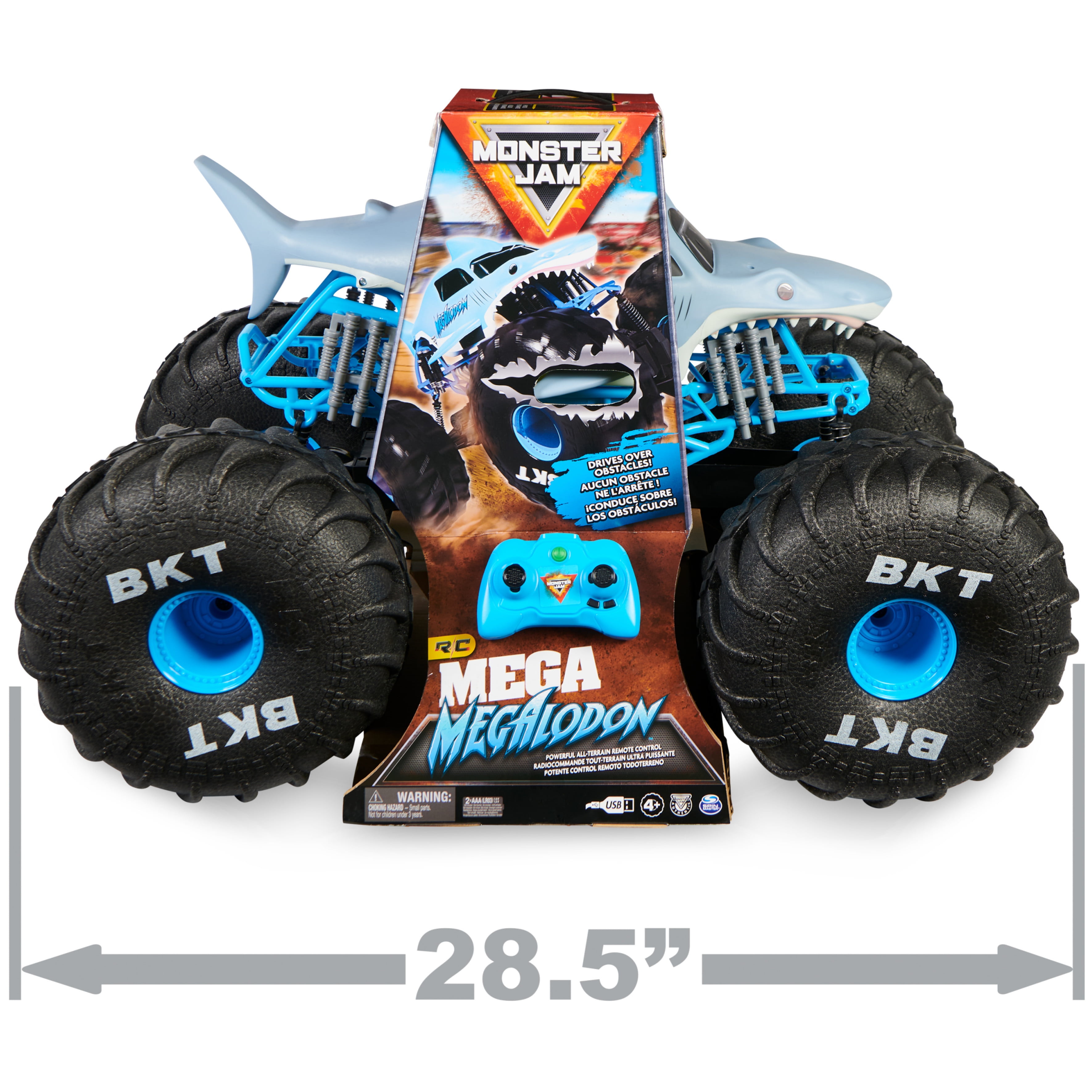 BIGGEST MEGA MEGALODON RC: Over 2-feet long, the Mega Megalodon RC in 1:6 scale lives up to its name! Larger, faster and more powerful than any other Megalodon RC! POWERFUL ALL-TERRAIN CONTROL: Use the control it from up to 150 feet away with the 2.4GHz frequency dual joystick controller and drive in any direction! DRIVE OVER ANY OBSTACLE: Overcome any obstacle on and off road – Mega Megalodon is unstoppable! With its rubber treads, mega-sized shocks and suspension, this RC monster truck can tackle anything! OFFICIAL MONSTER JAM REPLICA: With authentic graphics, oversized BKT Tires and working lights, it’s like driving the real thing! Featuring a built-in USB charging cable, power up and keep on rolling. TOYS FOR 4 YEAR OLD BOYS AND GIRLS: Monster Jam monster trucks for boys and girls are for ages 4 and up. Monster Jam toys, playsets, toy cars and RC trucks make the perfect holiday or birthday gift. Includes: 1 Mega Megalodon RC, 1 Remote Control, 1 Instruction Guide WARNING: CHOKING HAZARD – Small parts. Not for children under 3 years. Covered by the Spin Master Care Commitment. If you have a problem with a Spin Master product that you purchased from an authorized seller, we’ll resolve it! Because Spin Master is unable to control the quality of products sold by unauthorized sellers, unless otherwise prohibited by law, the Care Commitment is not available for products purchased from unauthorized sellers. The Care Commitment is limited to the original end-user purchaser. You may also be required to provide proof of purchase and/or a picture of your product to Spin Master to verify eligibility. Spin Master reserves the right to verify information, require a valid proof of purchase, and to deny request in its discretion