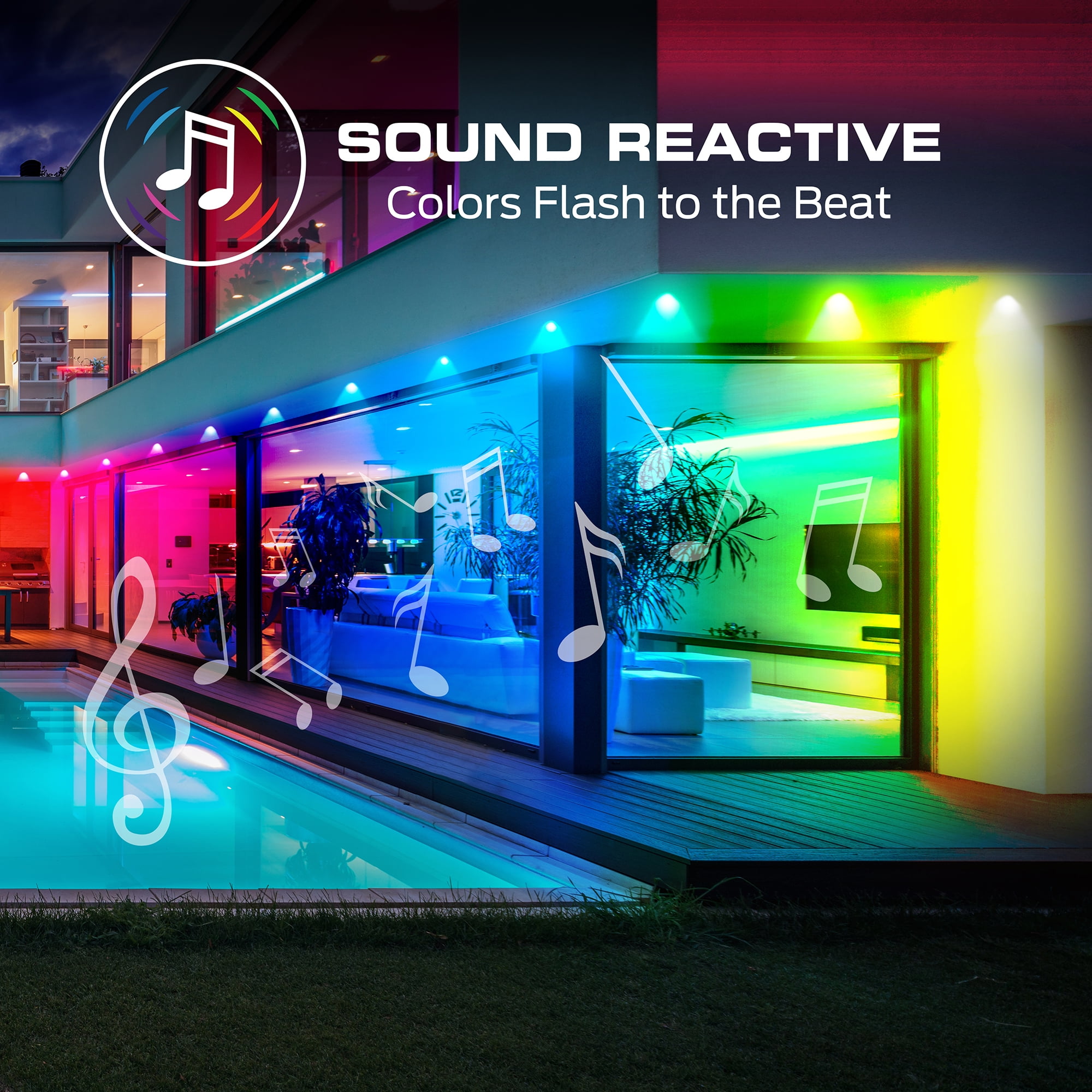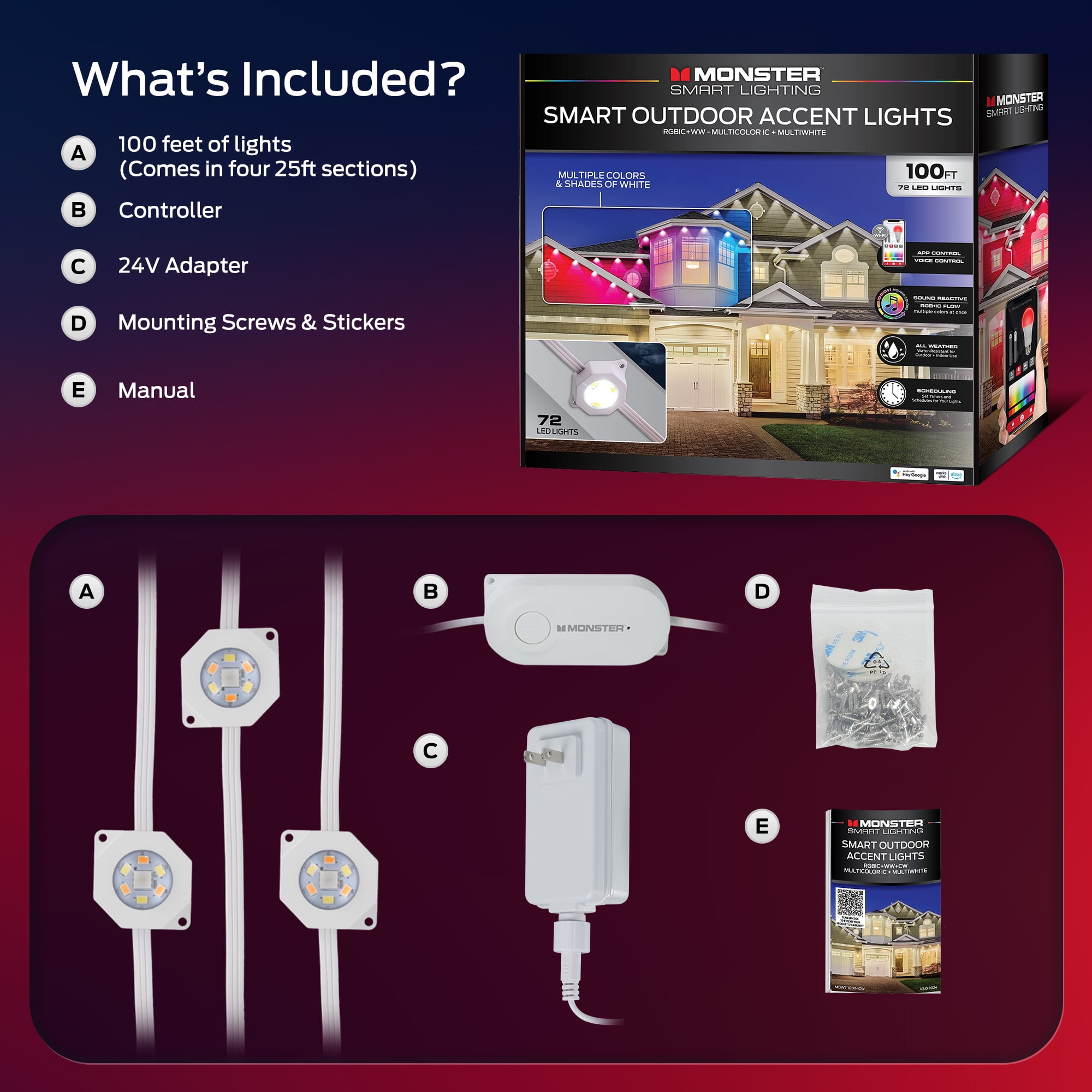 Vibrant RGBIC+ Multiwhite Technology: Enjoy dazzling displays with multiple colors and warm whites lighting up simultaneously, perfect for creating festive and dynamic lighting effects. Extended 100ft Length with 72 LEDs: Brighten large outdoor areas or add colorful lighting to indoor spaces with this long string of high-quality LED lights. 72 LEDs provide extensive coverage for large areas. Simultaneously display vibrant colors and warm whites. Syncs to music and media for dynamic effects. IP67-rated for reliable use in all weather conditions. Use the Monster Smart app, voice commands (Hey Google, Alexa, Siri), or PC with Razer Chroma RGB. Automate lighting with custom schedules and timers. Includes a 24V power adapter, mounting screws, and extra 3M mounting stickers.