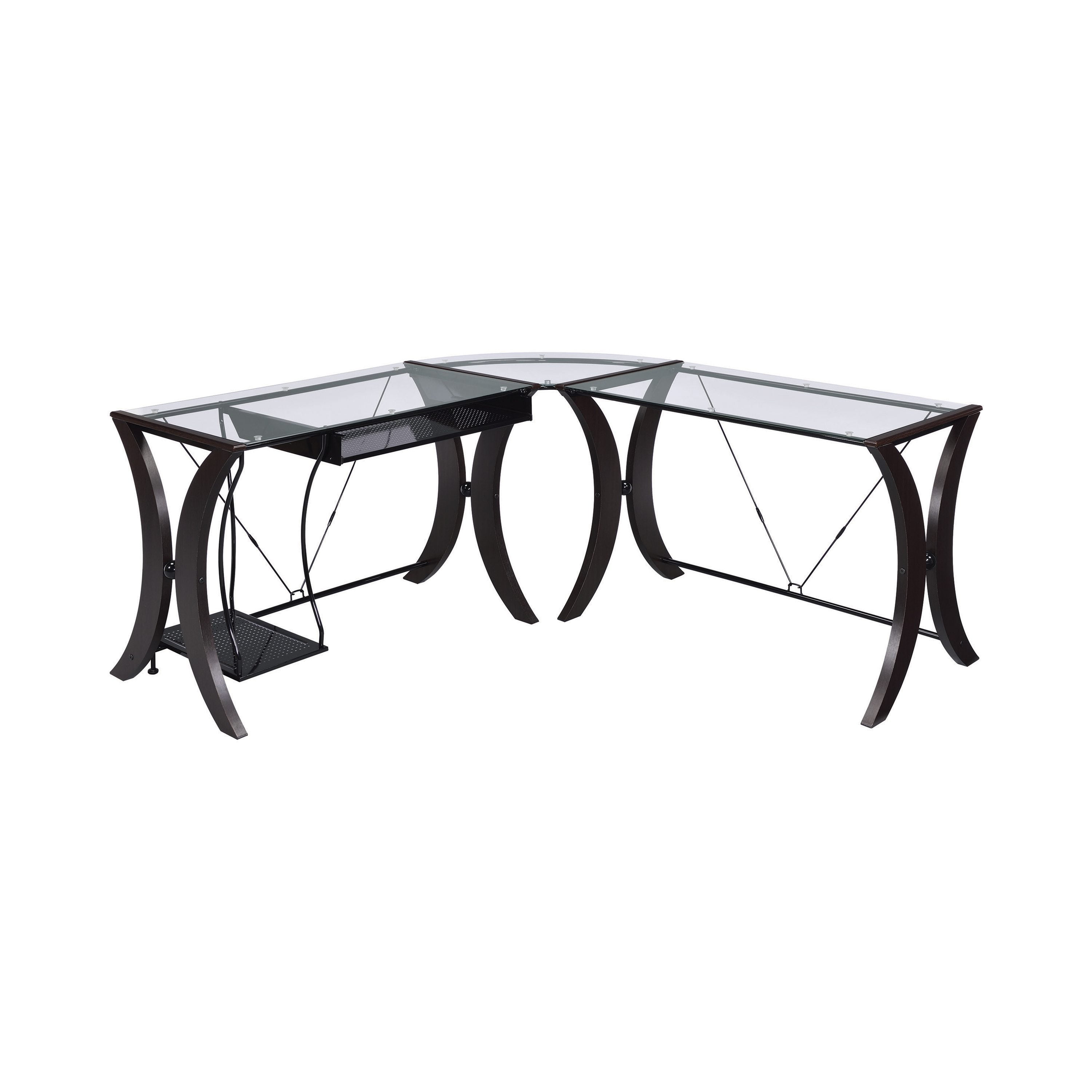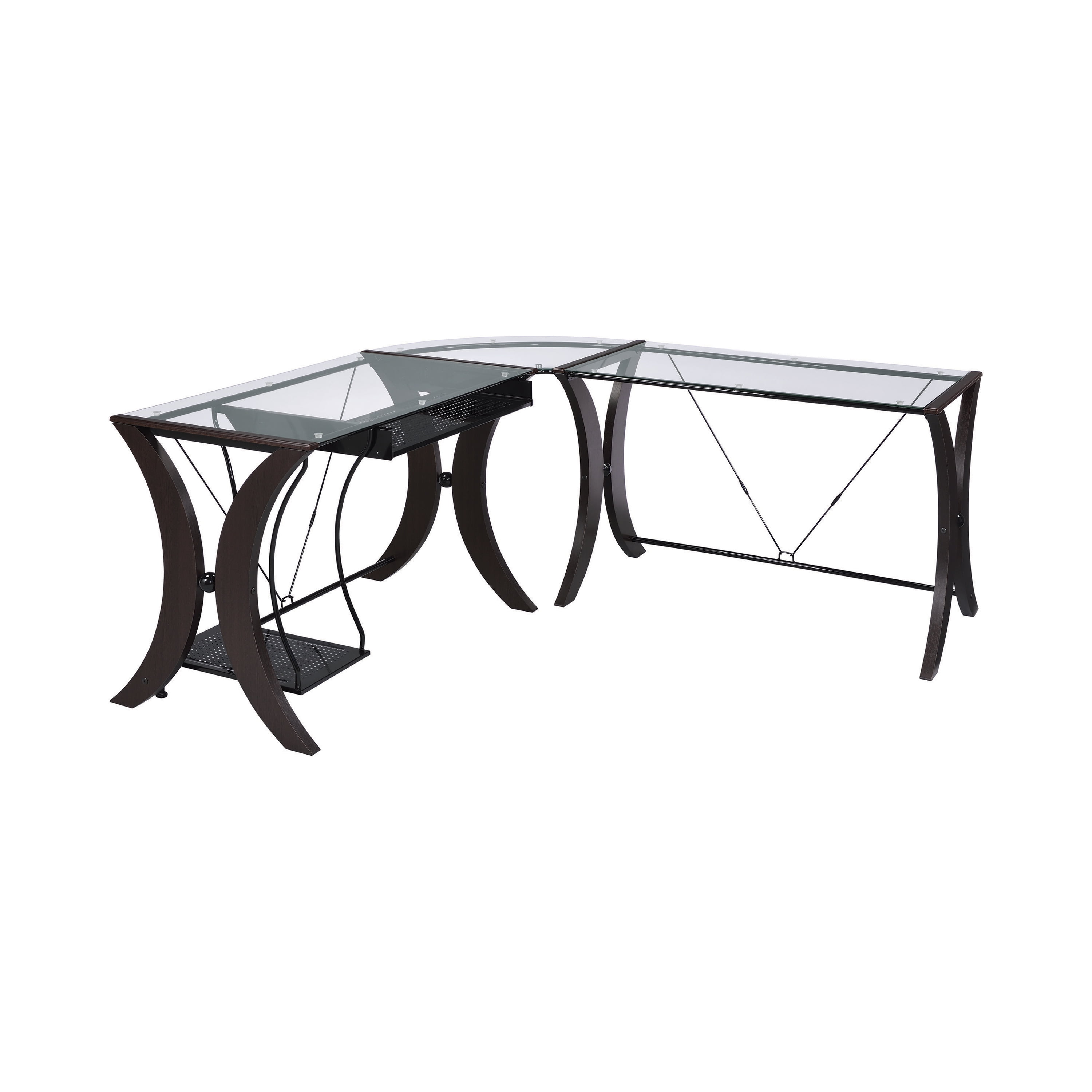 Style and luxury meet in contemporary L-shape three-piece computer desk Modern curved frame finished in cappuccino with a sturdy steel frame powder coated in black Clear tempered glass top highlights sleek look Keyboard tray, and a built-in computer stand round out functional features MDF, particle board, steel, glass and engineered laminate construction Wood finish: Cappuccino Metal finish: Black Desk dimensions: 43.25″W x 24″D x 30″H Return dimensions: 43.25″W x 24″D x 30″H Corner dimensions: 24″W x 24″D x 30″H Assembly required: Yes