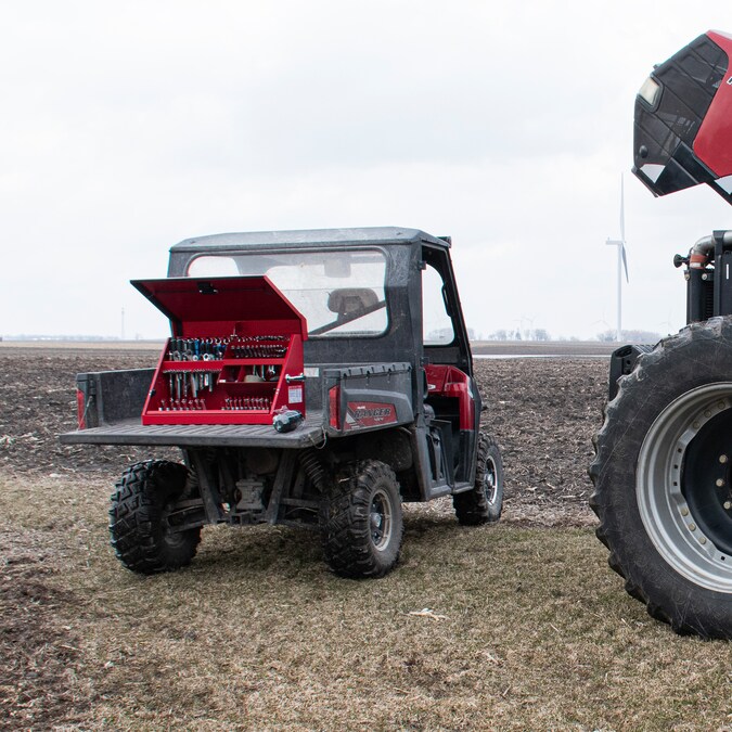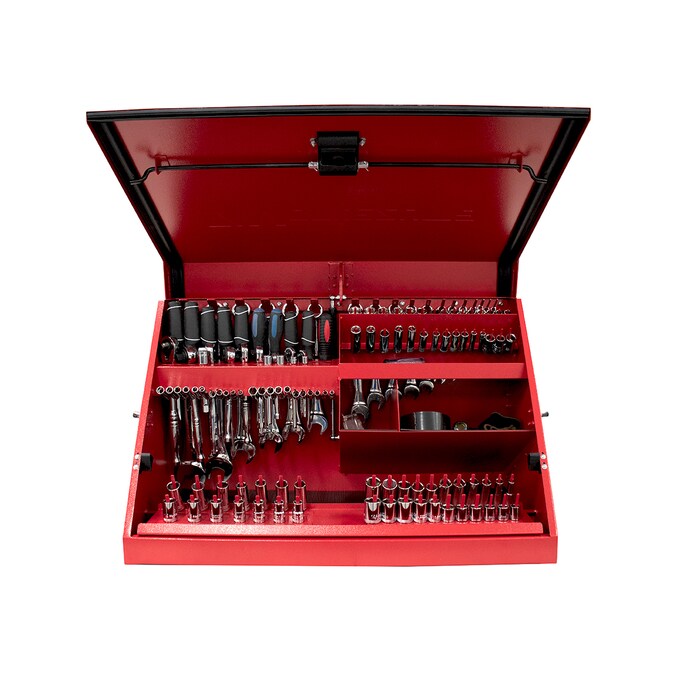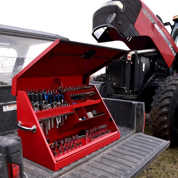 The Montezuma 30-in x 15-in lockable Triangle Toolbox cleverly engineered with a unique triangular shape and multi-tier tool storage helps organize and protect more than 141 of your tools and accessories, allowing you see all your tools at a glance, so you don’t have to dig and try to find what you’re looking for. Constructed from a high quality 16-gauge steel, this 30-in wide x 15-in deep toolbox is built to last. A protective, weather-resistant seal on the lid protects your tools against dust and moisture while the exterior has a tough red powder-coat paint finish to help prevent fading in extensive outdoor use. Designed with portability in mind, the easy to transport toolbox can be used in a stationery workspace or mounted to your work or recreational vehicle. This innovative toolbox features heavy duty steel pegs that hold sockets and wrenches in place, and for maximum security and protection, the unique lid design locks your tools in place when the lid is closed so your tools stay secure, even when they’re under bumpy, off-road conditions. In addition to the interior tool locking system, the storage box also features a locking device to help prevent the theft of your stored tools and hardware when you’re not around. With a total weight capacity of 500-lbs, you can store more of your commonly used tools, like screwdrivers, wrenches, sockets and more. The Montezuma Triangle Toolbox is designed to hold and carry SAE or Metric tools and is perfect for home workshops as well as auto, welders, and mechanic shops. The compact toolbox measures 30-3/4-in W x 15-1/4-in D x 18-1/4-in H and includes a 5-year warranty from the date of purchase.