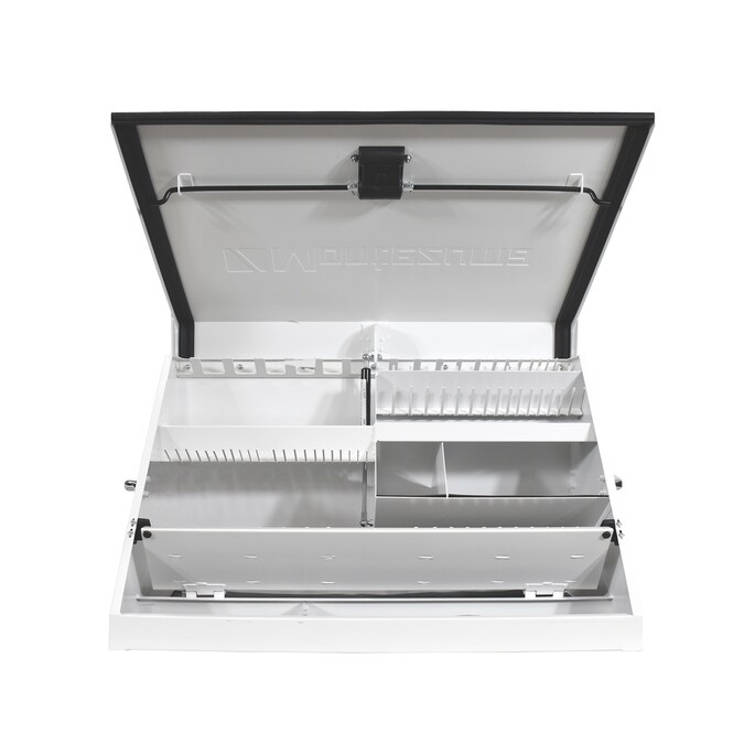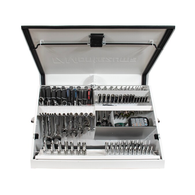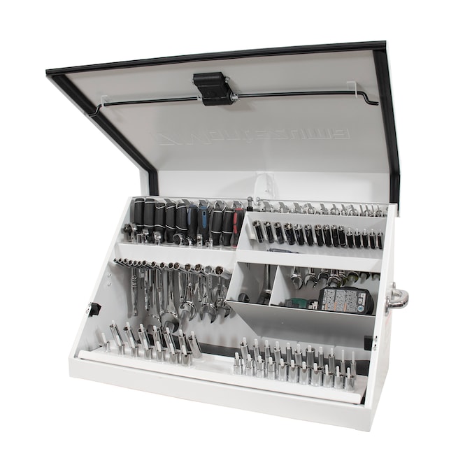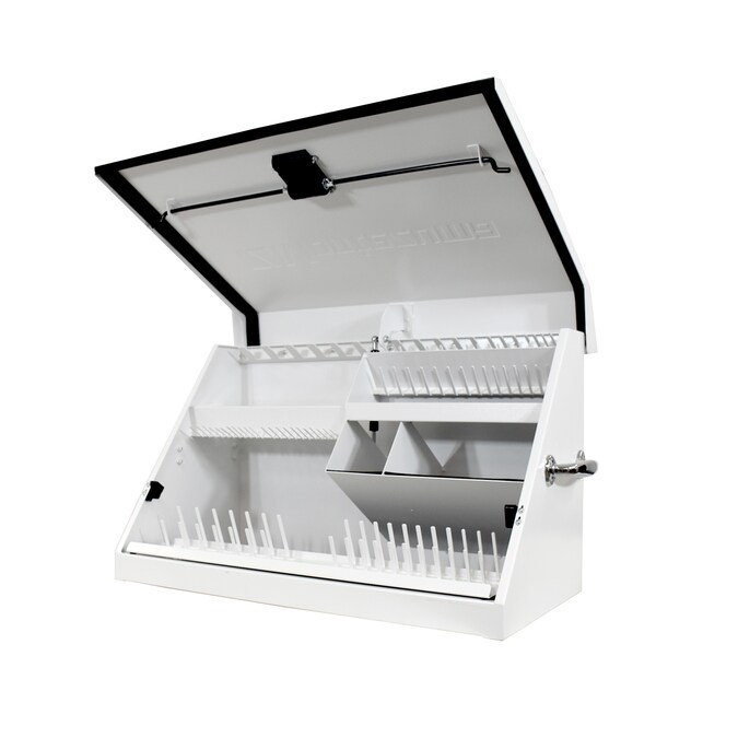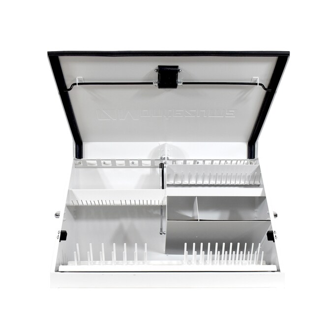 The Montezuma 30-in x 15-in lockable Triangle Toolbox cleverly engineered with a unique triangular shape and multi-tier tool storage helps organize and protect more than 141 of your tools and accessories, allowing you see all your tools at a glance, so you don’t have to dig and try to find what you’re looking for. Constructed from a high quality 16-gauge steel, this 30-in wide x 15-in deep toolbox is built to last. A protective, weather-resistant seal on the lid protects your tools against dust and moisture while the exterior has a tough white powder-coat paint finish to help prevent fading in extensive outdoor use. Designed with portability in mind, the easy to transport toolbox can be used in a stationery workspace or mounted to your work or recreational vehicle. This innovative toolbox features heavy duty steel pegs that hold sockets and wrenches in place, and for maximum security and protection, the unique lid design locks your tools in place when the lid is closed so your tools stay secure, even when they’re under bumpy, off-road conditions. In addition to the interior tool locking system, the storage box also features a locking device to help prevent the theft of your stored tools and hardware when you’re not around. With a total weight capacity of 500-lbs, you can store more of your commonly used tools, like screwdrivers, wrenches, sockets and more. The Montezuma Triangle Toolbox is designed to hold and carry SAE or Metric tools and is perfect for home workshops as well as auto, welders, and mechanic shops. The compact toolbox measures 30-3/4-in W x 15-1/4-in D x 18-1/4-in H and includes a 5-year warranty from the date of purchase.