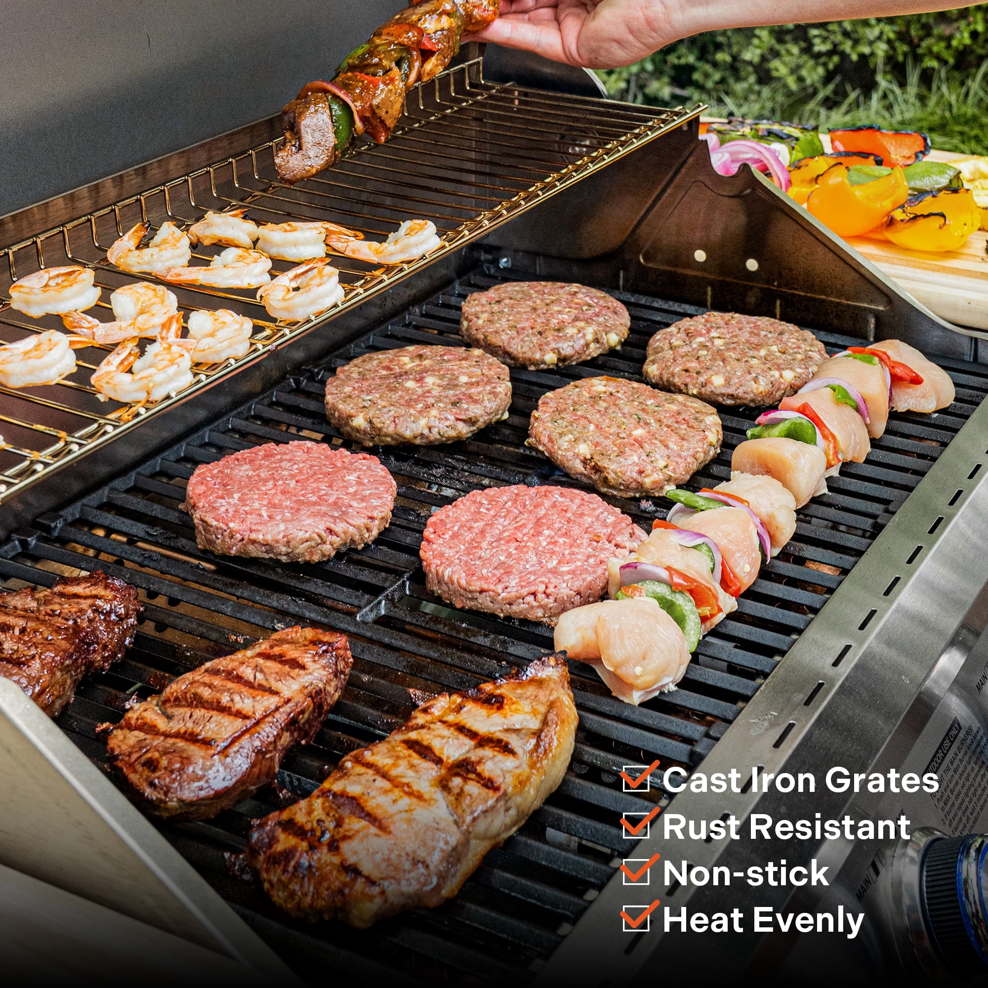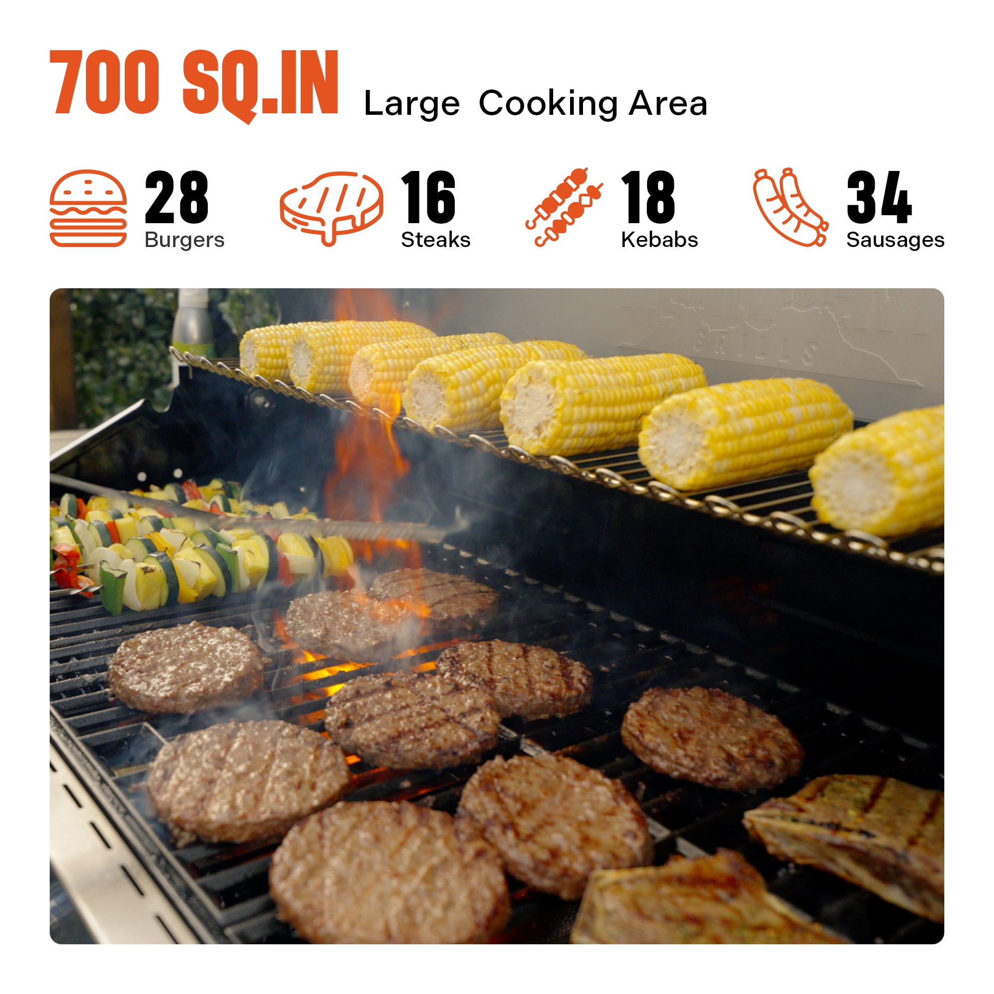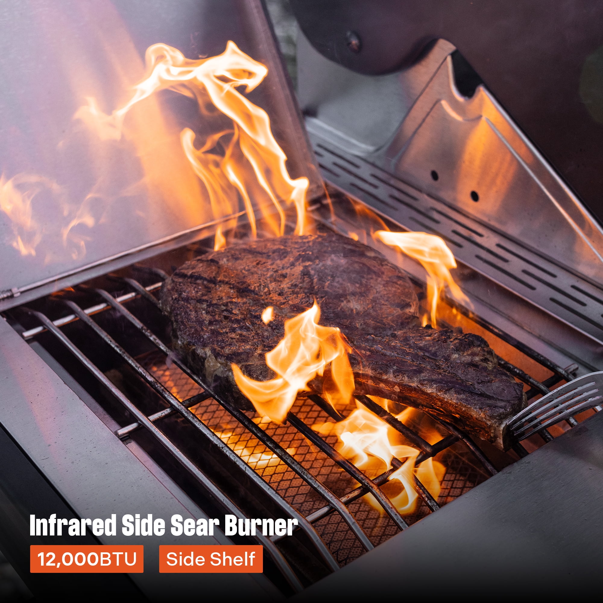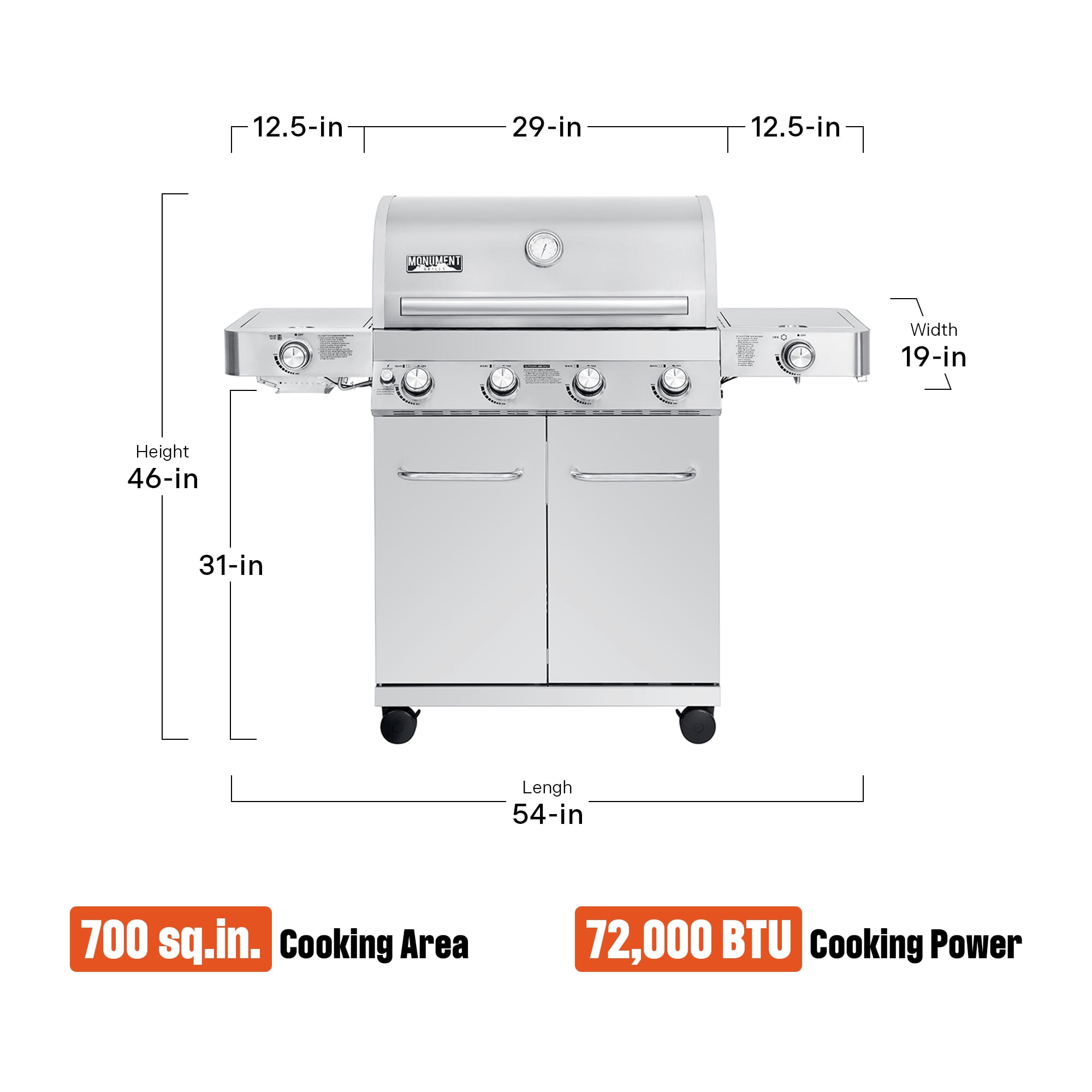 Stainless Steel lid with aluminum side caps, Doors, flame tamers and Side shelves Ceramic Side Sear burner – Perfect for steaks and side burner LED lit control knobs for night grilling Fast and even heat for superior cooking performances 4 long lasting stainless steel burners Cast iron porcelain coated cooking grid Porcelain coated enamel firebox 430 Stainless lid+, door+, & side shelves Silver Powder coated side, back, and base panels 513.3 sq. in primary cooking area + 210 sq. in warming rack cooking Easy to clean stainless steel grease tray Removable catch pan Tool hooks Pilotless ignition 4 Locking nylon wheels 304 Stainless Steel Burners 29 inch firebox