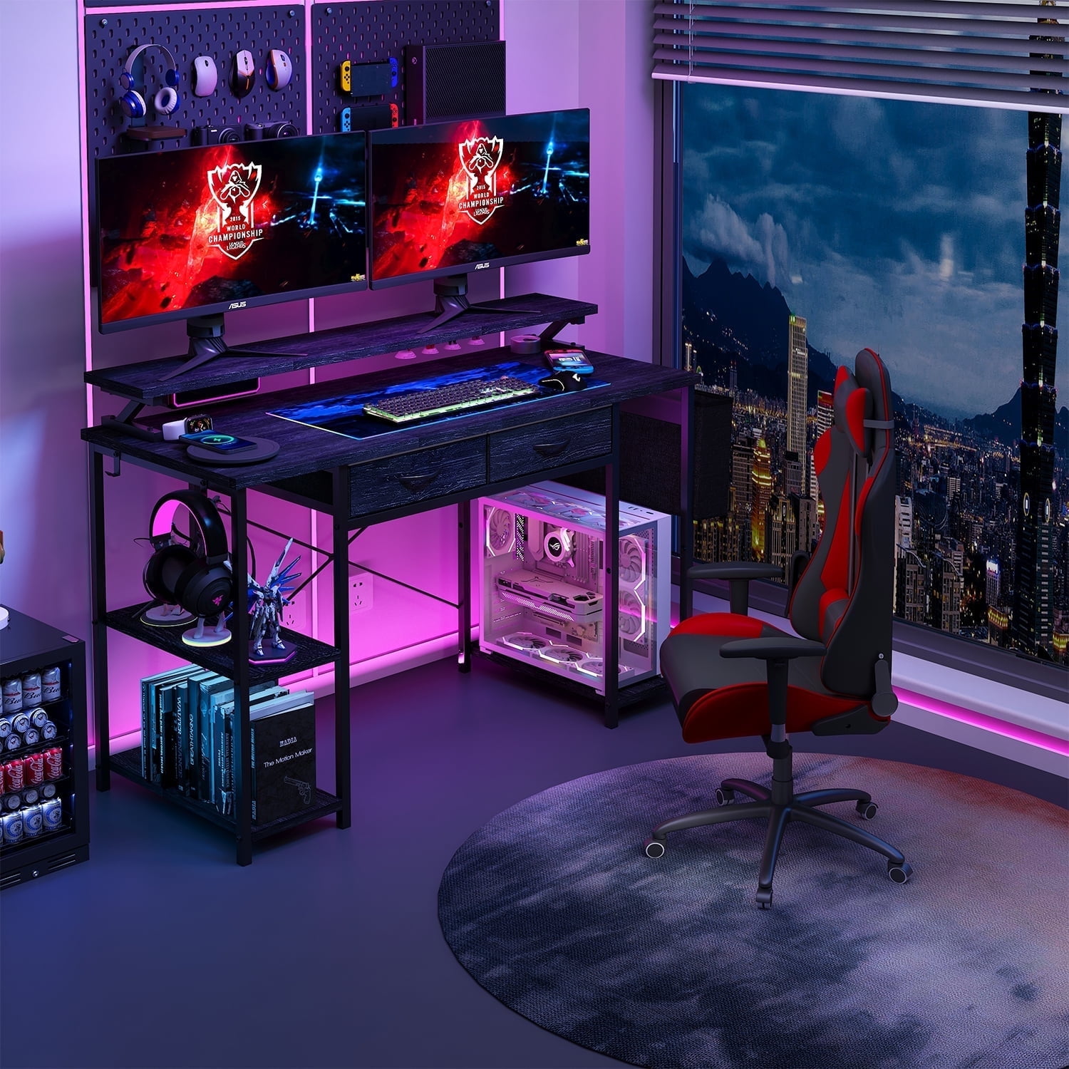 This versatile gaming desk from MONVANE is designed to meet all your workspace needs. With its sturdy metal frame, adjustable feet, and waterproof wooden top, it provides a stable and durable surface for your computer, office supplies, and more. The desk features two convenient fabric drawers and a spacious storage bag, allowing you to keep your essentials organized and within reach. Measuring 47.2″ in length, 19.7″ in width, and 32″ in height, this desk is the perfect addition to your home office, study room, or bedroom, offering ample space for productivity and comfort.