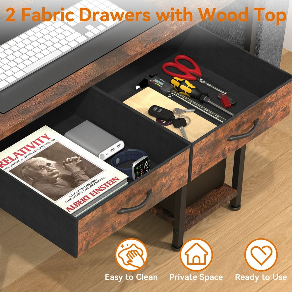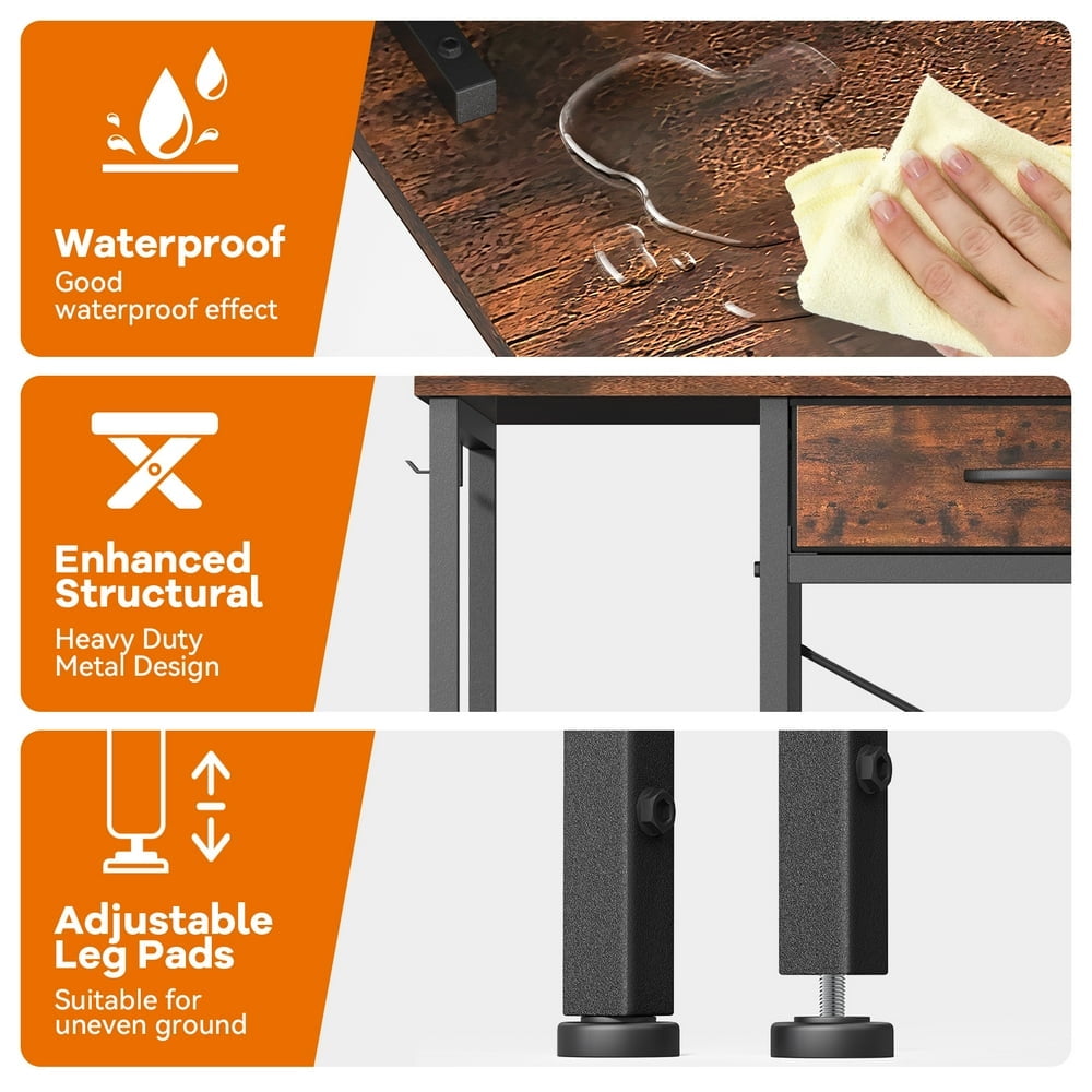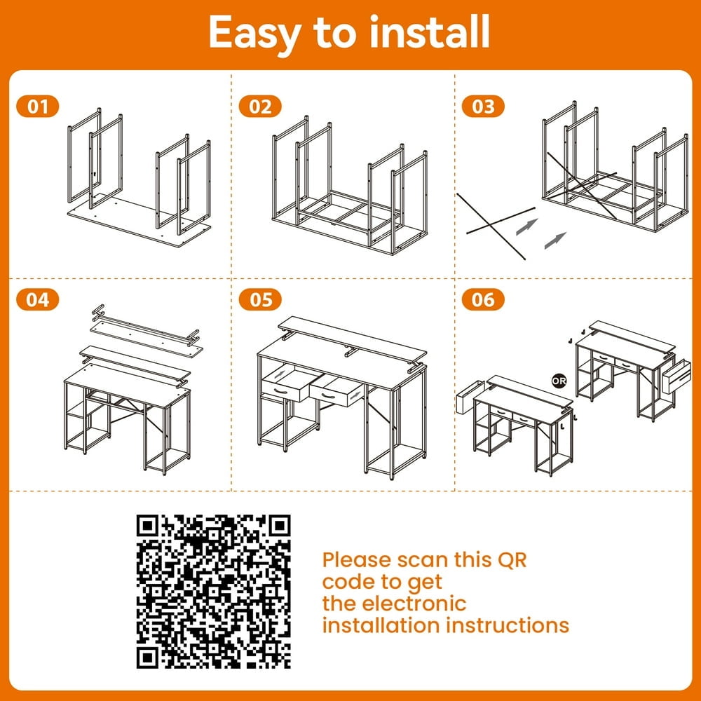 Versatile design suitable for home office, study room, bedroom, or living room Solid metal frame and triangle strut construction for exceptional stability Includes a clear and well-organized installation guide for easy setup Desk dimensions: 47.2″L x 19.7″W x 32″H (including monitor shelf) Drawer dimensions: 13.5″L x 18.7″W x 4.1″H for ample storage space Packaging dimensions: 53.15″L x 21.65″W x 7.87″H, weighing 22 kg Convenient storage bag included to keep your essentials organized 2 metal hooks for hanging headphones, small items, and more 2 fabric drawers for storing books, printers, files, and other items 8 adjustable feet to protect your floor and ensure stability on uneven surfaces Waterproof top board for easy cleaning and protection against scratches