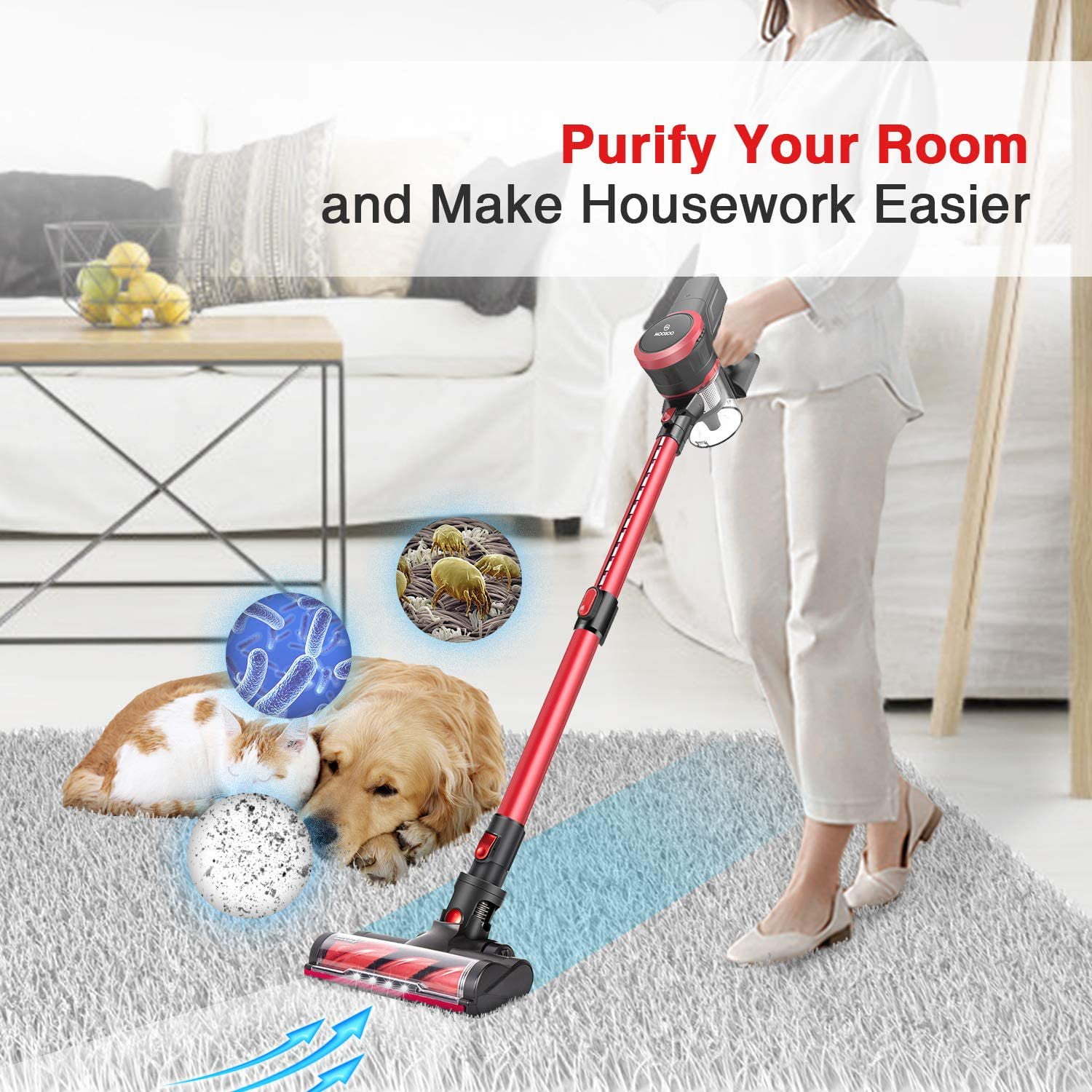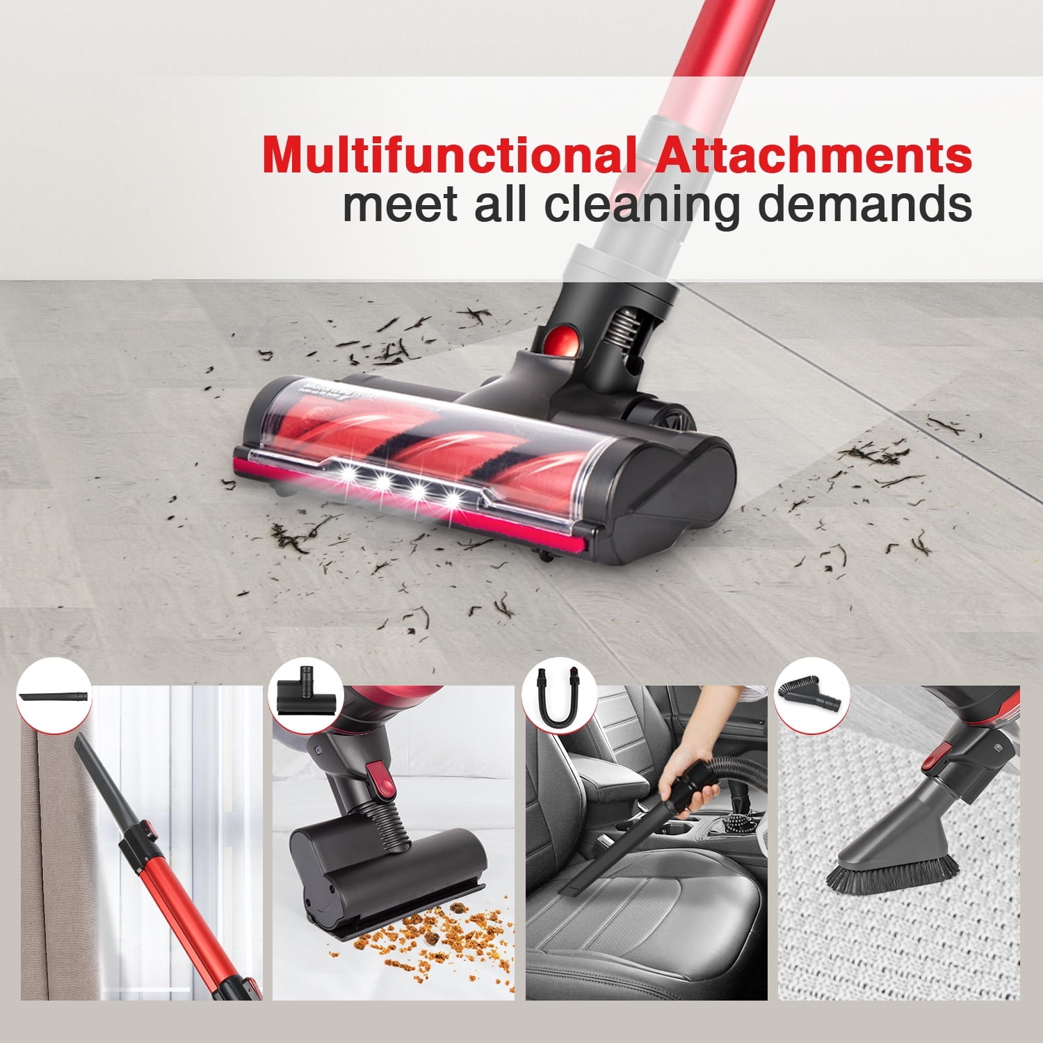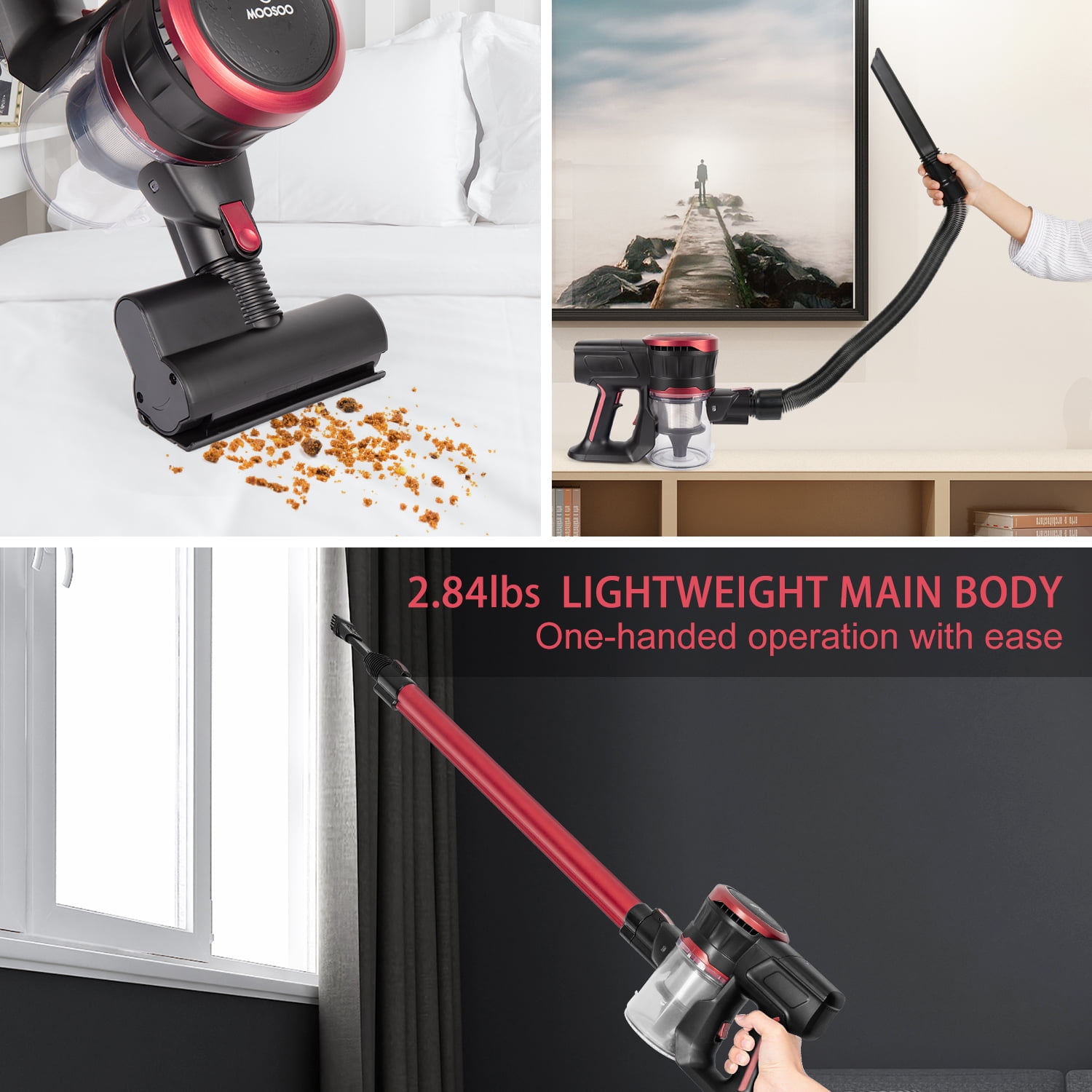 Moosoo 2.84lbs Lightweight Stick Vacuum Cleaner, Cordless Vacuum Up to 30 Mins Runtime, Excellent for Hardwood Floor Carpet Pet Hair Car 2.84lbs Lightweight Cordless Stick Vacuum Cleaner Rich Handheld Vaccum Accessories 4 Stages High-Efficiency Filtration System Up to 30mins Long-Lasting Time in Low Modes, Remove Dust from 130 m2 Easily 200W High-Powered Motor for 2 Adjustable Speed Modes Auto Recharge Wall Mount Base & Storage, Easy to Store and Charge 4 LED Lights & Ultra-Wide Motorized Ground Brush, For Pet Hair and Carpet 180° Left and Right Rotation, 90° Up and Down Rotation, All-round Cleaning without Blind Spots Product Information: Product Dimensions: 17.32 x 12.99 x 7.37 Inches Item Weight: 2.84 pounds Manufacturer: MOOSOO Color: Black & Red Specific Uses For Product: Hard floor, Carpet, Car Two Suction: 11/23KPa Applicable Area: 130 square meters Use Way: Dry Use Filtering Mode: 4 Stage Multi-Stage Cyclone Form Factor: Stick, Cordless, Handheld Led Lights: 4 Led MAX Run Time: 30 Mins What You Get: 1 x Cordless Vacuum 1 x HEPA Filter 1 x Charger Wall Mount Base 1 x Electric Floor Brush 1 x Crevice Flat Nozzle 1 x Crevice Brush 1 x Sofa Brush 1 x 46cm Telescopic Hose 1 x Manual Instructions