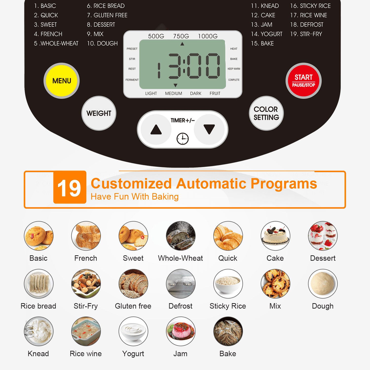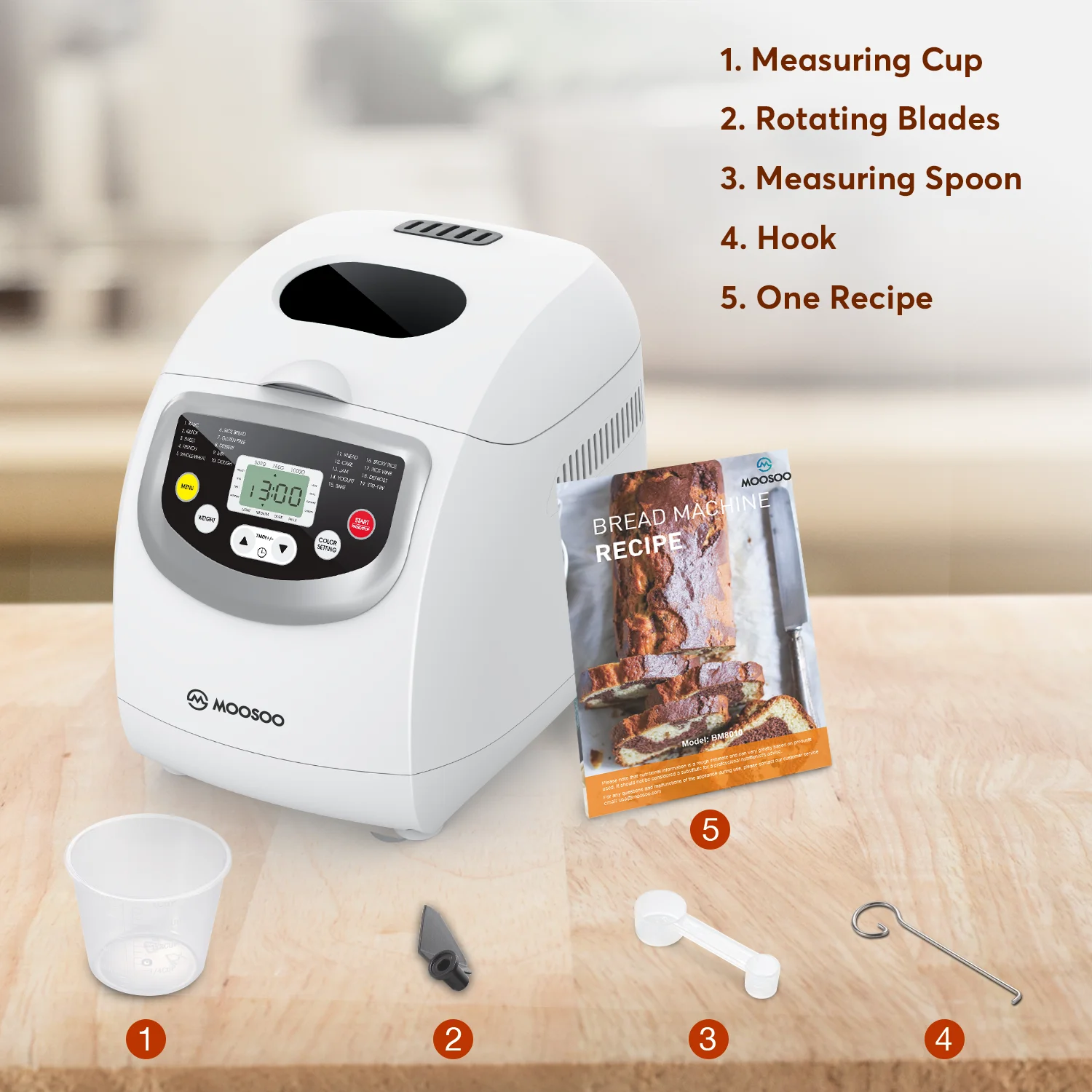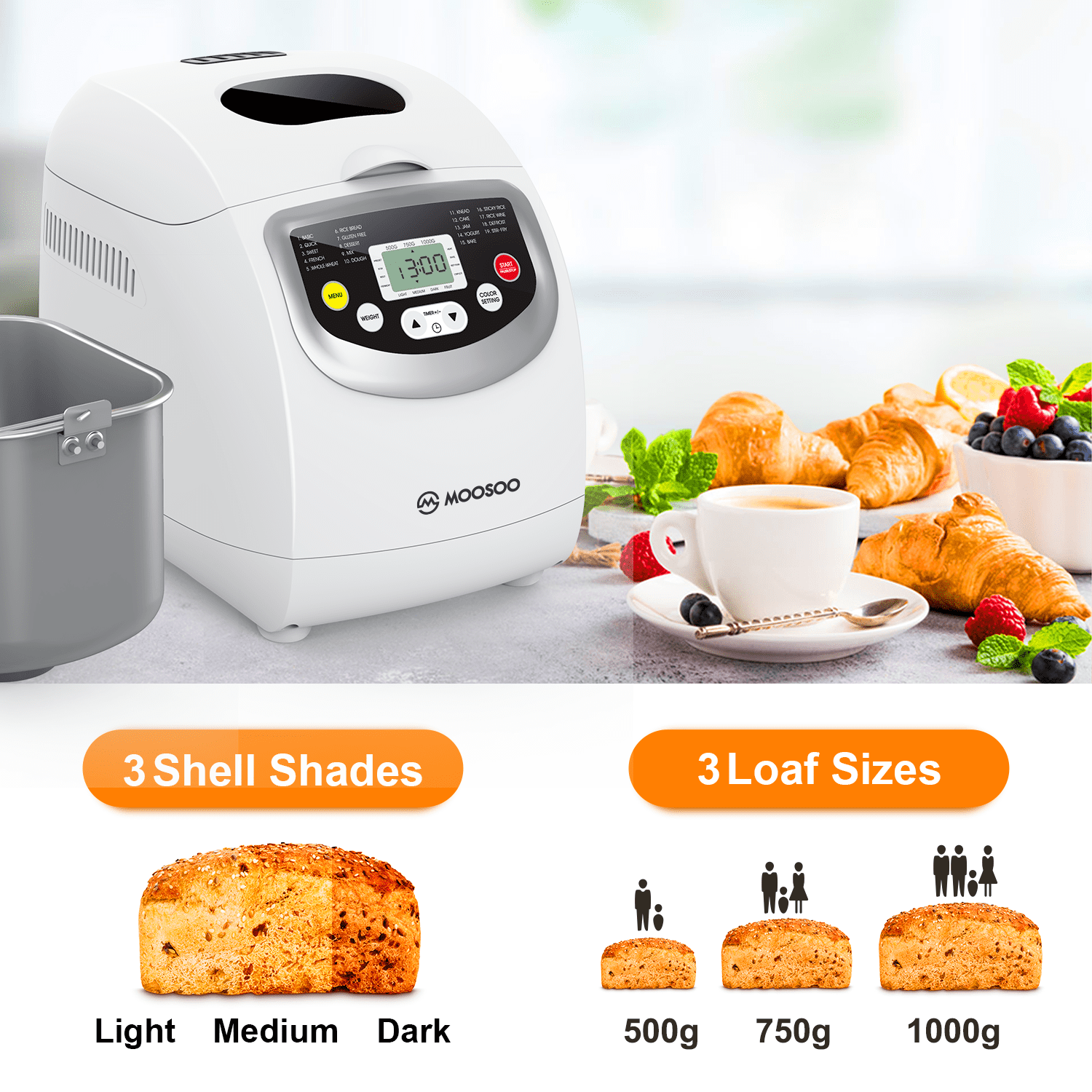 MOOSOO New BM8010 Bread Maker Benefit: 650W Bread Maker Machine, Fasting Cook Bread 19 Smart Preset Programs, Custom HOMEMADE Program 3 Bread Crust Colors: Light, Medium and Dark. Heat Proof Design Plastic Cover and Body 2lbs. Bread Bucket (with non-stick coating) LED Digital Screen, Glass Visible Window, Key Control 15 Hours Timer Delay & 60 Mins Automatic Warm-keeping Function 10-minute Power Outage Recovery Function Accessories Included Measuring Cup, Measuring Spoon, Hook Fork, 1 Mix Paddles, Bread Machine Recipes