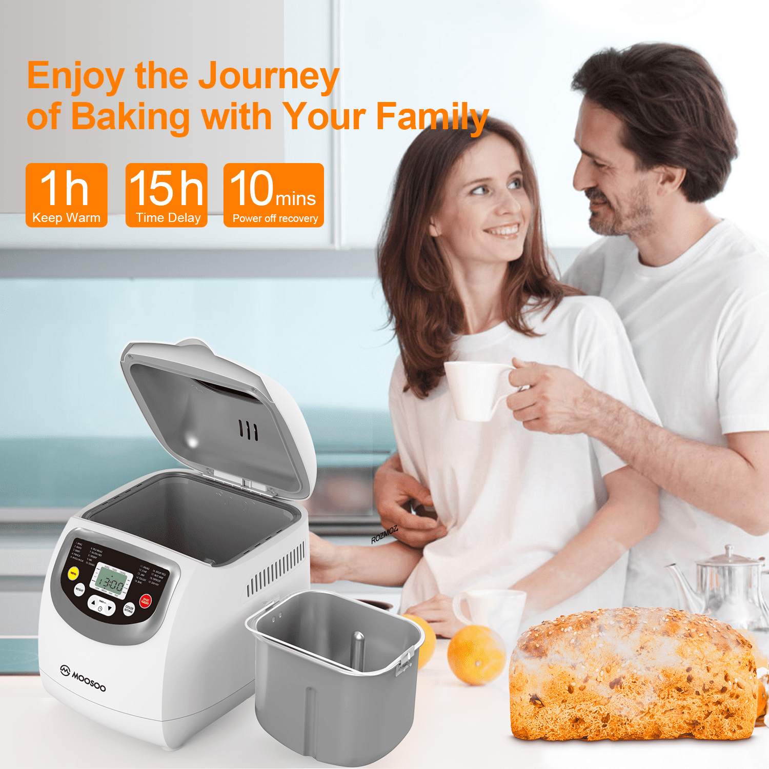 MOOSOO 2lbs. Bread Maker Machine with 19 Preset Setting, LED Display, 15 Hours Timer Delay, White