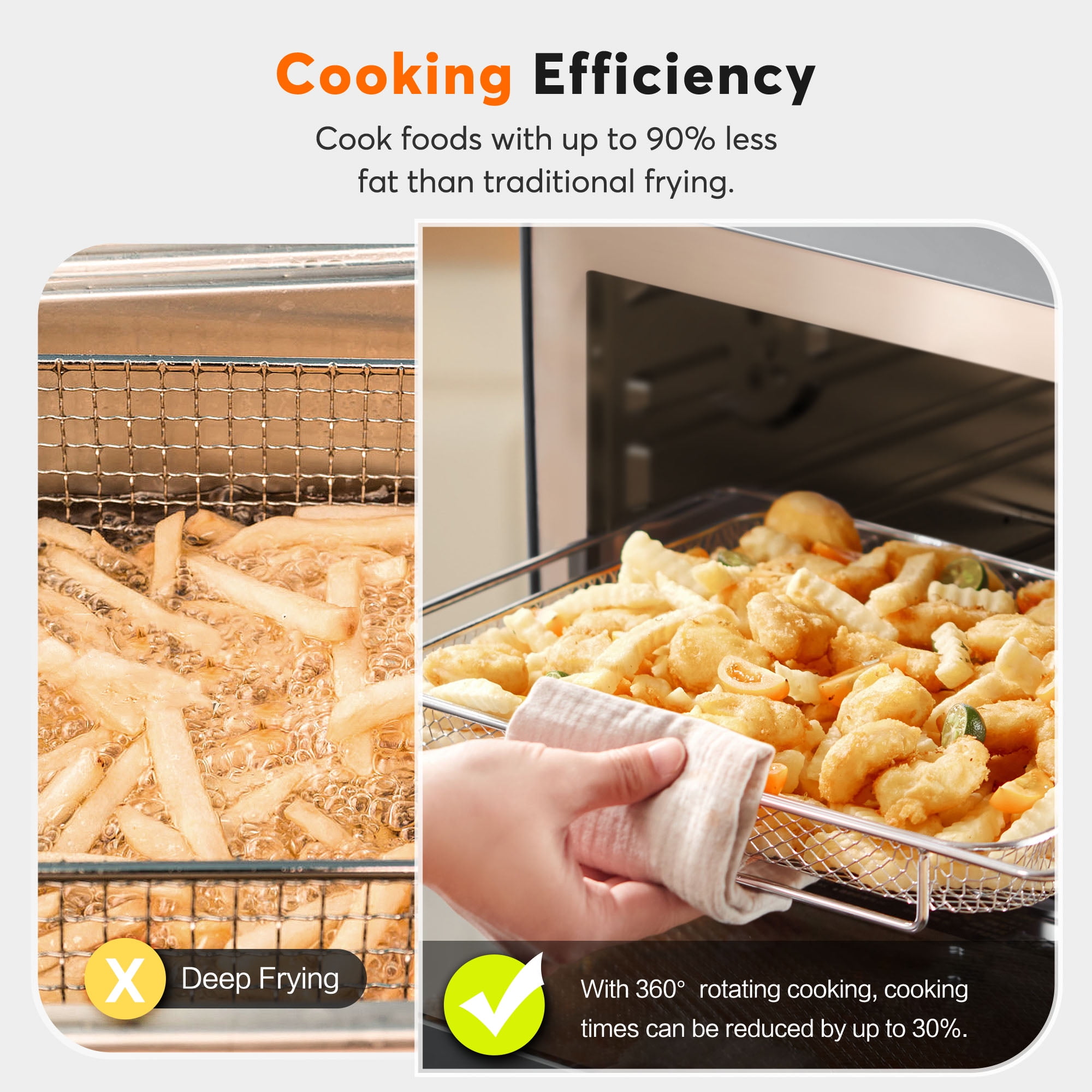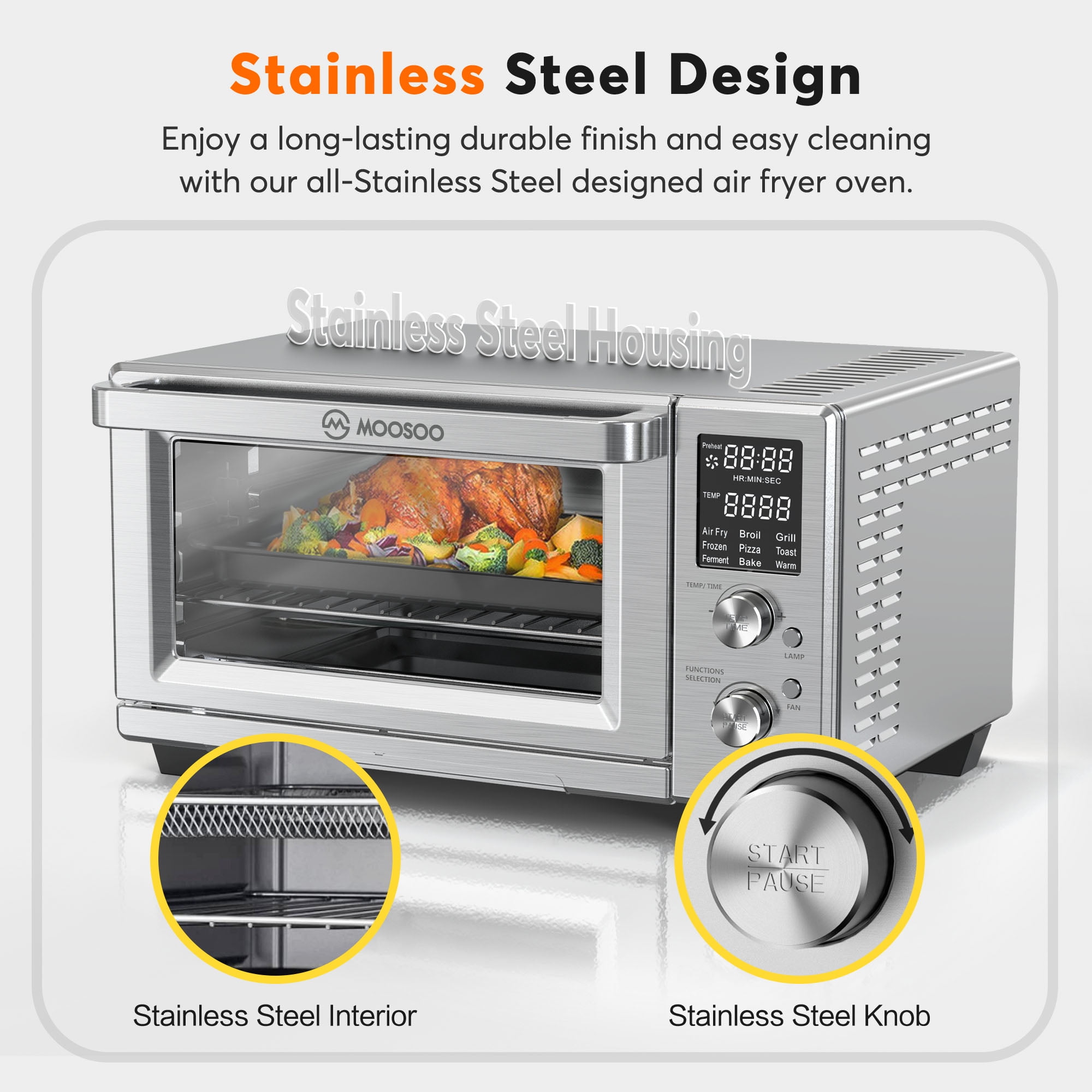 MOOSOO 30Qt Air Fryer Oven, Stainless Steel Air Fryer Toaster Oven Combo 8 preset air fry cooking modes and the digital screen display Easy to adjust by the digital screen display & control panel One minute preheating, the knob accurately controls the temperature to 5°C All-stainless steel air fryer oven looks stylish enough to match your modern kitchen 360-degree rapid hot air circulation cooks food in all directions, keeping food evenly heated and crispy without oil Auto shut-off and overheat protection to ensure your safety Air fryer comes with cookbook included 100 recipes providing different experiences for you every day. Technical Specifications: Material: Stainless Steel Rated Voltage: 120 V/ 60 Hz Rated Power: 1700 W Timer Range: 0-60 Mins Temperature Range:150-450°F Power Cord Length: 1.2 m Safety Certificate: ETL