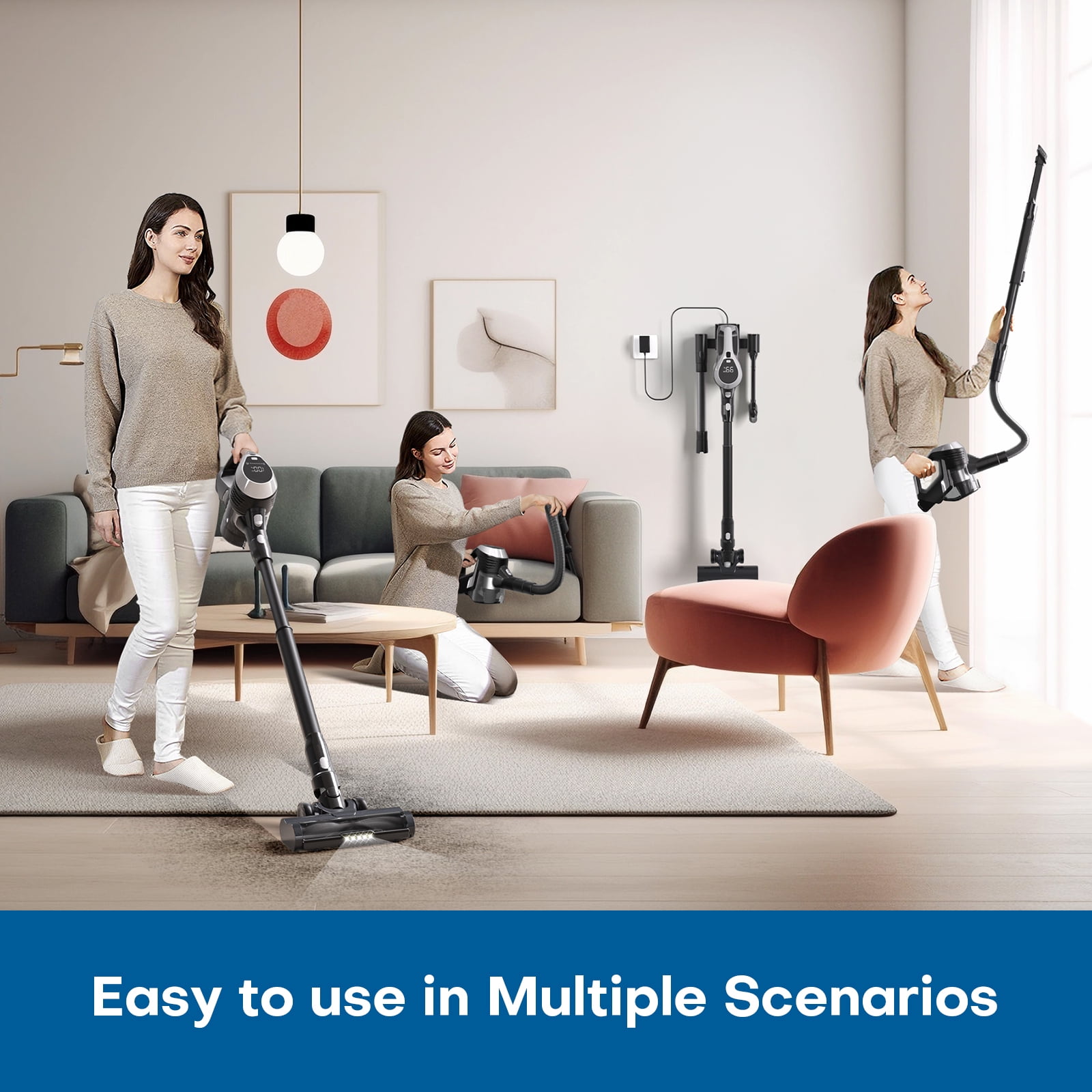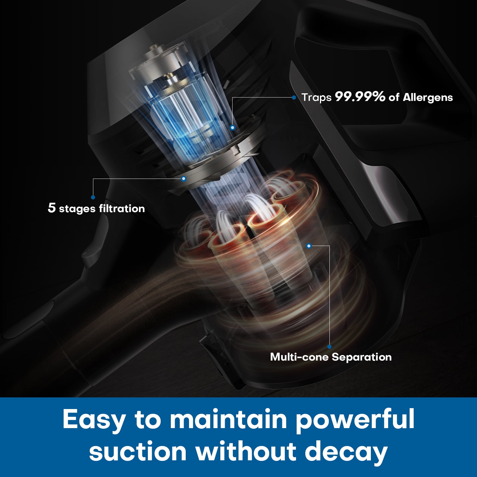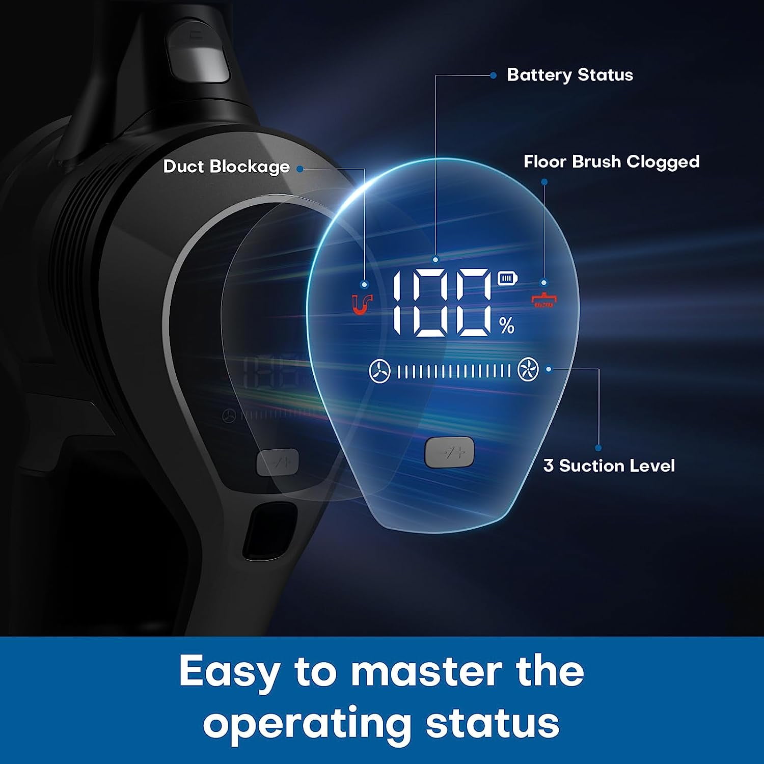 Powerful Suction for Tough Cleaning This cordless stick vacuum provides an impressive suction strength of up to 20Kpa, effortlessly lifting stubborn dirt off any surface. With three distinct suction modes, you’re always in control of your cleaning session. Innovative 3-Colors Curved LED Display Vacuum cleaner features a unique space-capsule-shaped display, delivering a nearly 180-degree viewing angle. The 3-color breathing light on the display changes corresponding to the suction mode you’re using. Built-In Lighting Function The vacuum’s advanced green detection headlight sees hidden dust. Built-in lights effectively reveal tiny particles that would otherwise go unnoticed, ensuring a thorough clean in dark every time. Non-Fading Suction and HEPA Filter Enjoy consistent, lossless suction powered by our proprietary iCyclone technology. This cordless vacuum cleaner with HEPA traps an impressive 99.999% of dust and particles as tiny as 0.3 microns, making it ideal for those with allergies or pet owners. Lightweight Design with Smooth Linking The cordless vacuum weighs just 3.13 pounds, ensuring a fatigue-free cleaning experience. Plus, its well-designed linking interface and adjustable telescopic rod allow for smooth installation and removal for optimum convenience.