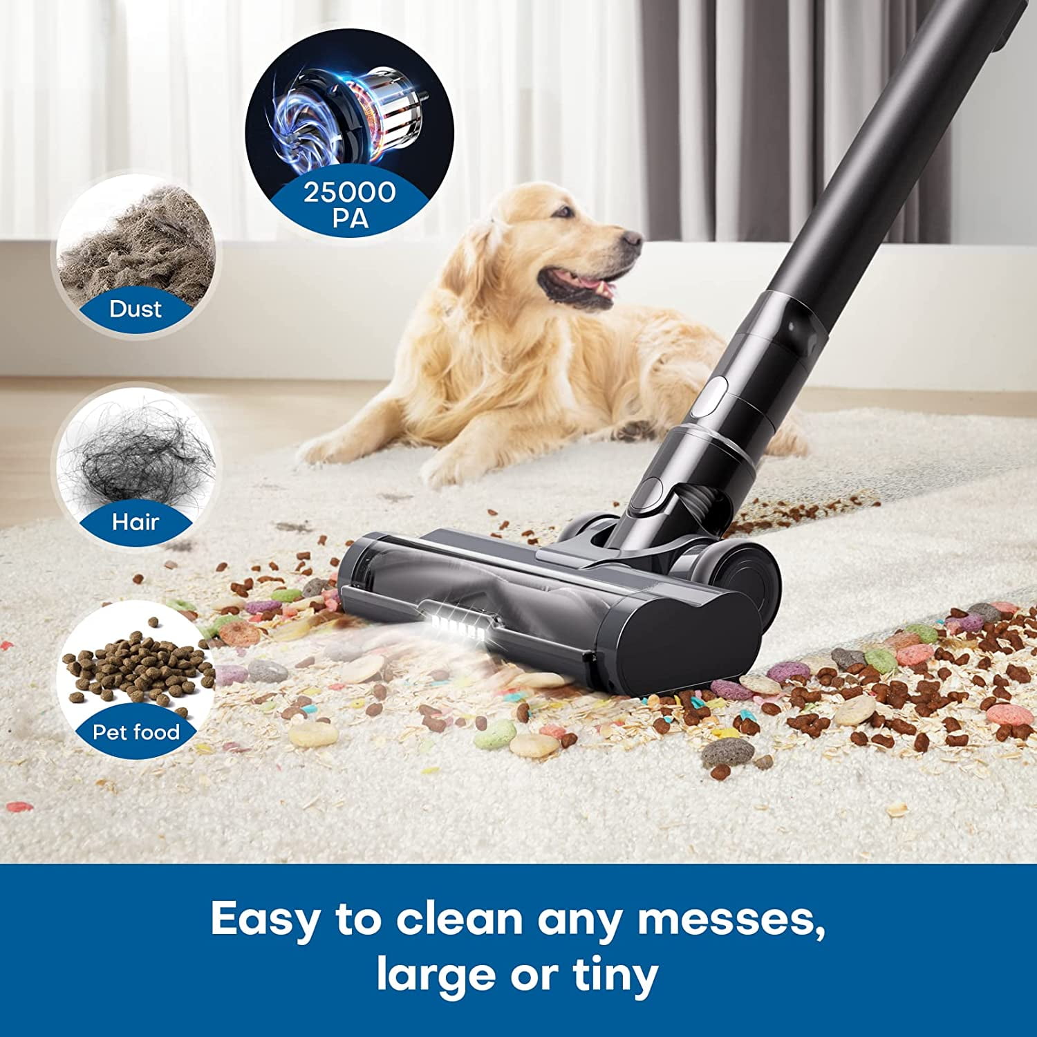 MOOSOO Cordless Stick Vacuum Cleaner with LED Display, for Home Pet Hair Hard Floor Carpet 180° anti-tangle LED motorized brush deep cleans carpets and pulls in pet hair 110,000 rpm brushless motor maintains strong suction Space capsule LED display with 3-color breathing light Green highlight and built-in light reveal hidden dust Ultra-lightweight vacuum cleaner at only 3.13 lbs Multiple cyclones capture 99.99% of fine particles Quiet 65dB operation is pet-friendly Up to 40 minutes of run time gives you plenty of cleaning time 800ml Dust cup and One-key dumping function Docking station makes charging and storage easy
