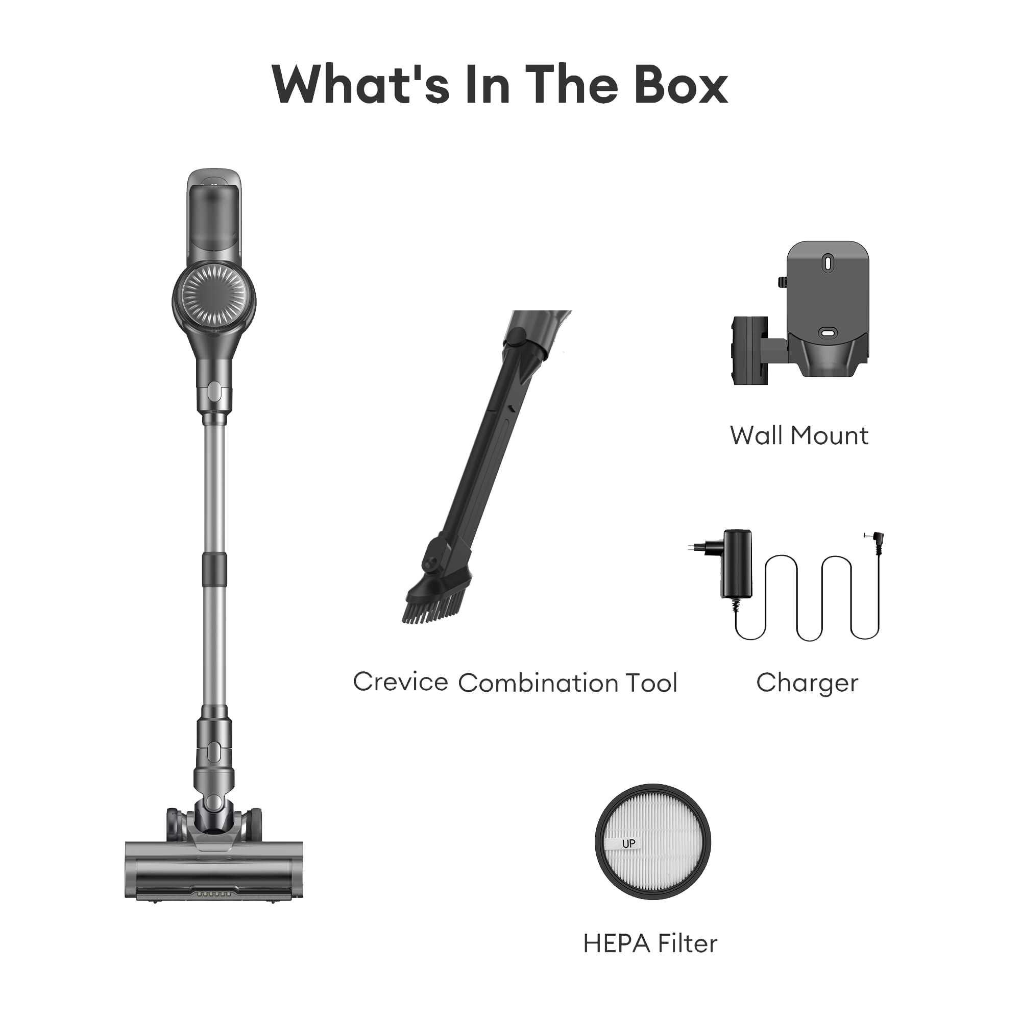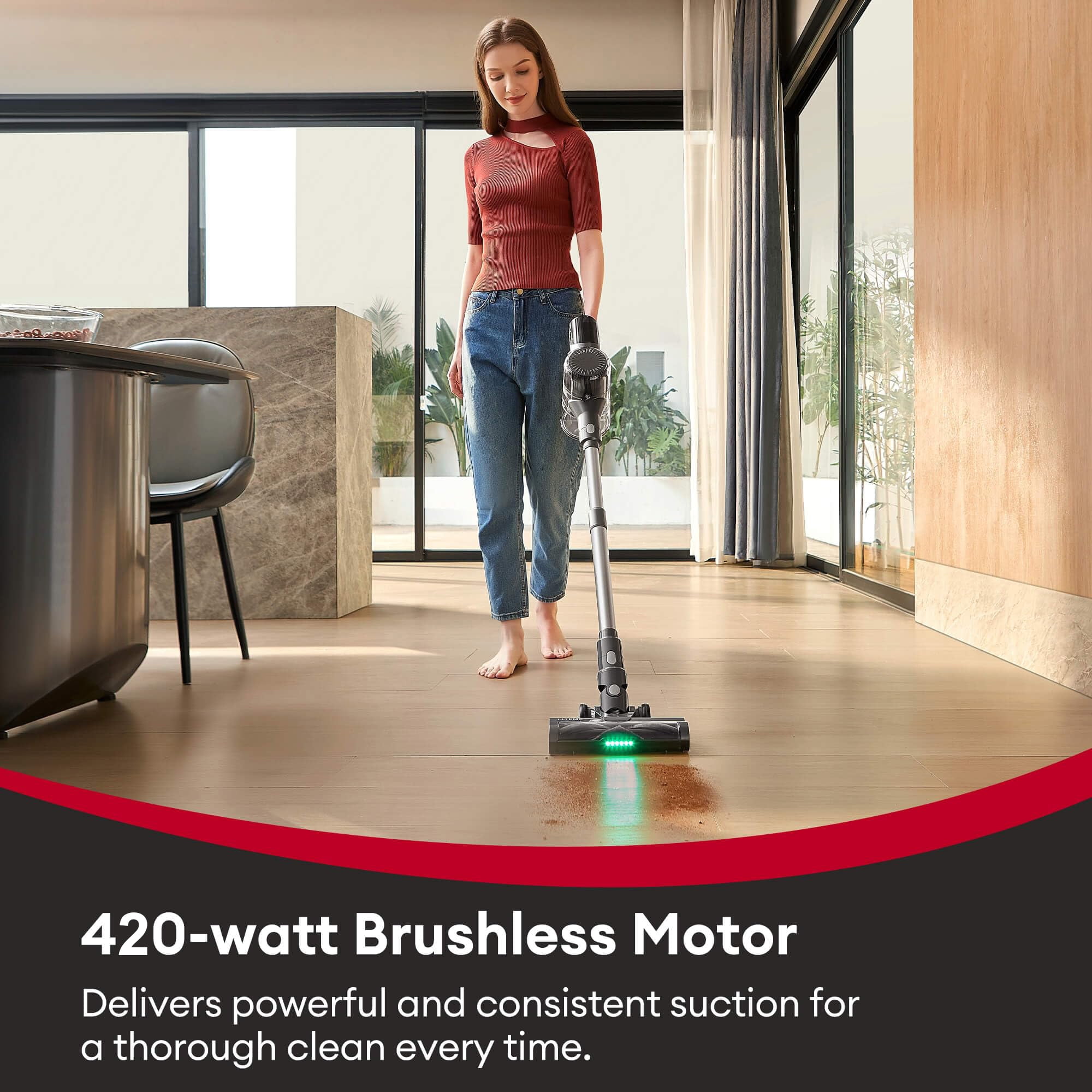 MOOSOO Stick Vacuum Cleaner is a powerful cordless vacuum with innovative features to keep your home clean: A 420W brushless motor provides up to 33Kpa of suction power You can choose from 3 suction levels to clean, the Auto-Gear is up to 33Kpa. An 800ml dust cup capacity means fewer trips to empty the vacuum. The multi-cone separation system maintains powerful suction and prevents filter blockages. Intuitive LED display shows cleaning mode, battery level, and alerts. Rechargeable and removable large lithium-ion battery provides up to 40 minutes of run time per charge. 2-in-1 brush tool cleans narrow gaps, corners and upholstery. The green light floor brush illuminates debris on hard floors and carpets. Wall-mounted charging stand for convenient storage. One-click dust removal for easy disposal of dirt and debris. Cordless design offers maximum mobility and reach without the hassle of cords. Weighs only 3.2 lbs. for easy carrying and handling. Advanced HEPA filter captures 99.99% of particles, allergens and dust for a cleaner home environment.