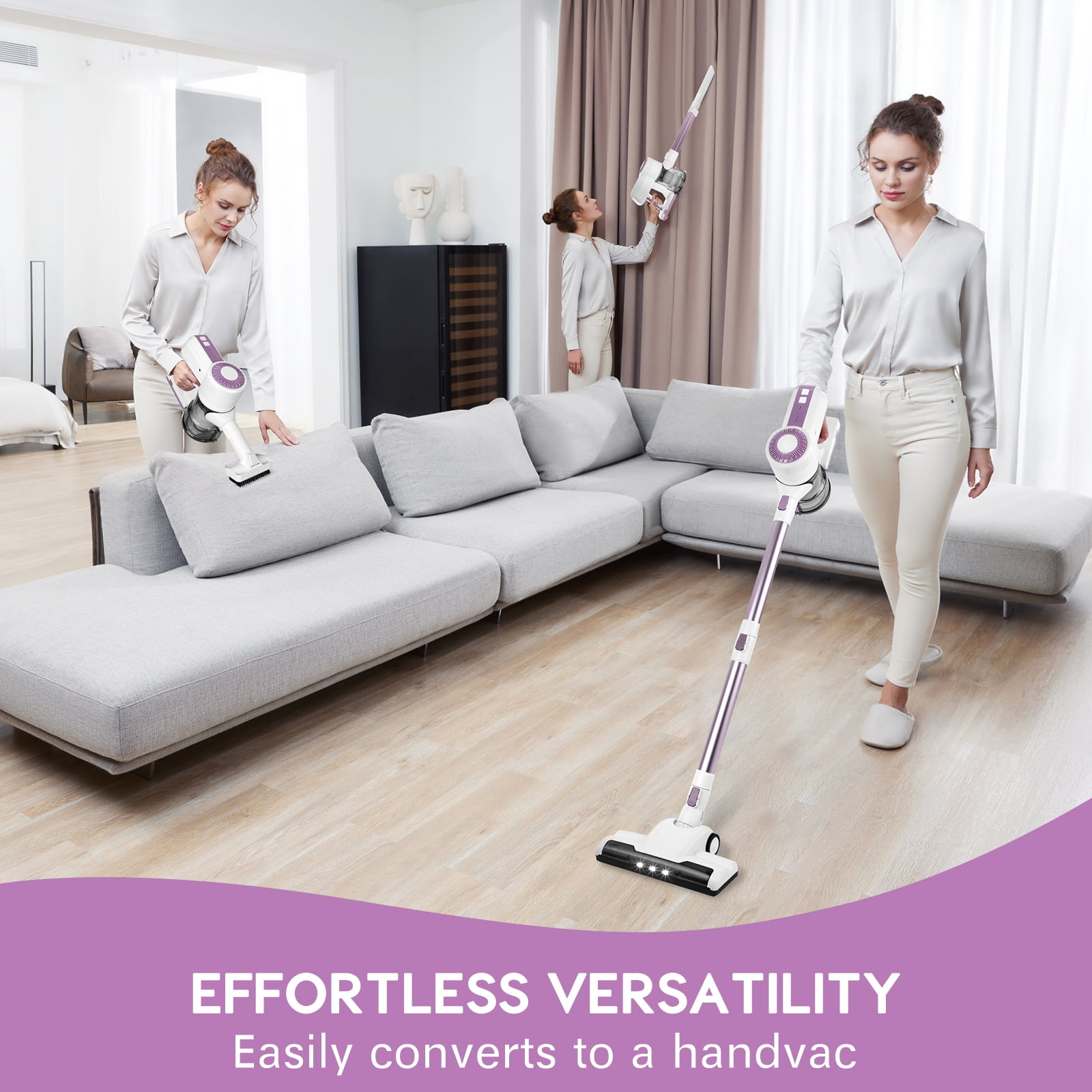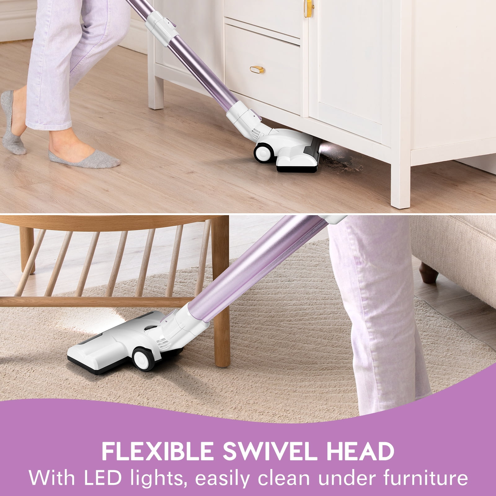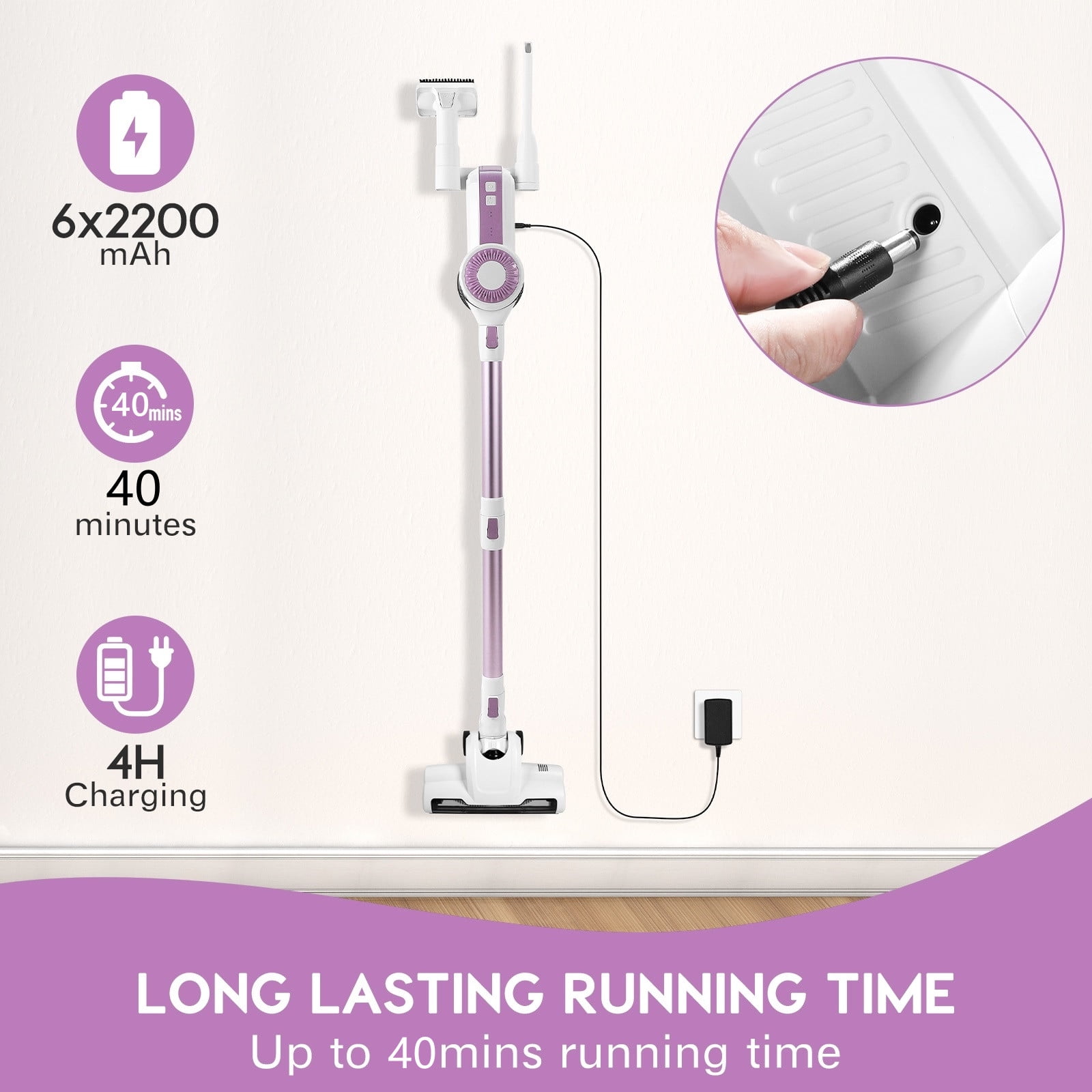 Ultra-Lightweight Cordless Vacuum Cleaner 28KPa Powerful Suction 2200mAh Battery Up to 40 mins runtime 2 Speed Modes 6-Stage Filtration Ultra-Light (2.8 lbs) 1.3L Dust Cup 2 Attachments. Crevice brush and sofa brush Floor Brush with 4 LED Lights Quiet Operation: ≤60dB Roller for Hardfloor & Carpet Long-lasting Rechargeable