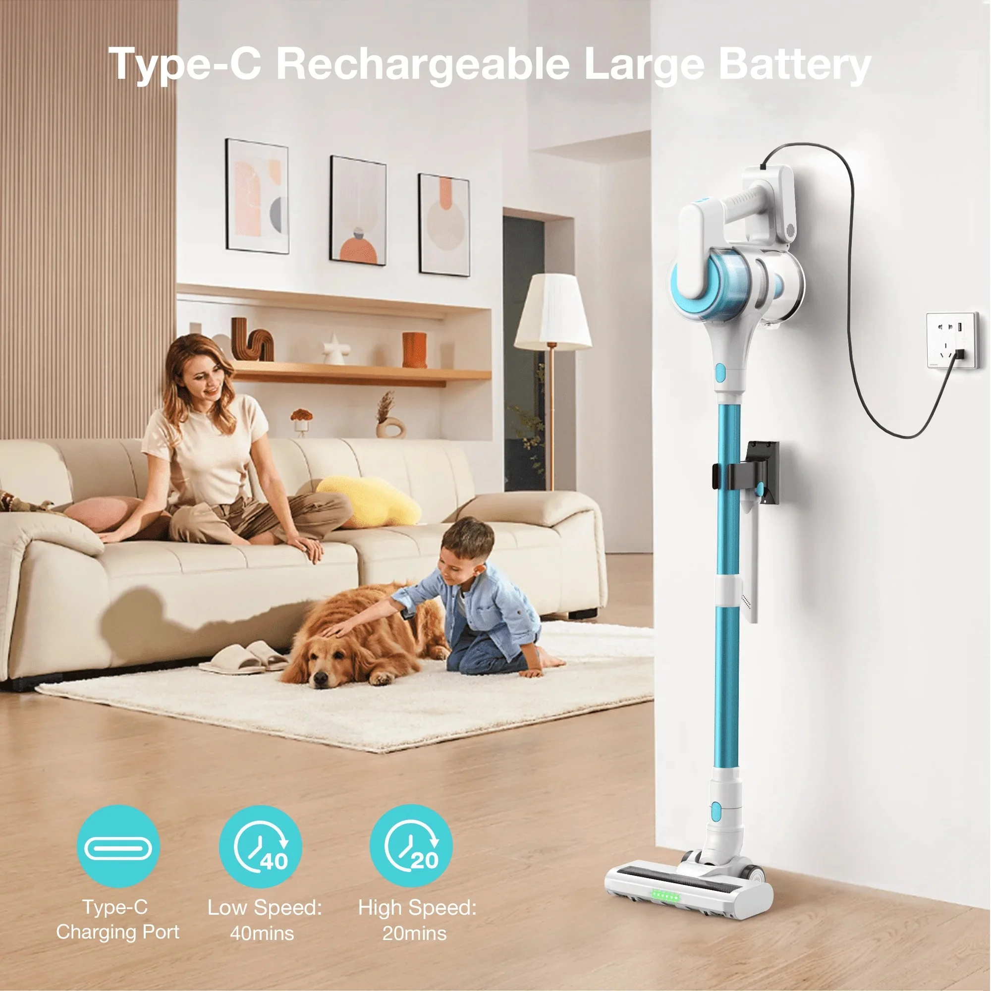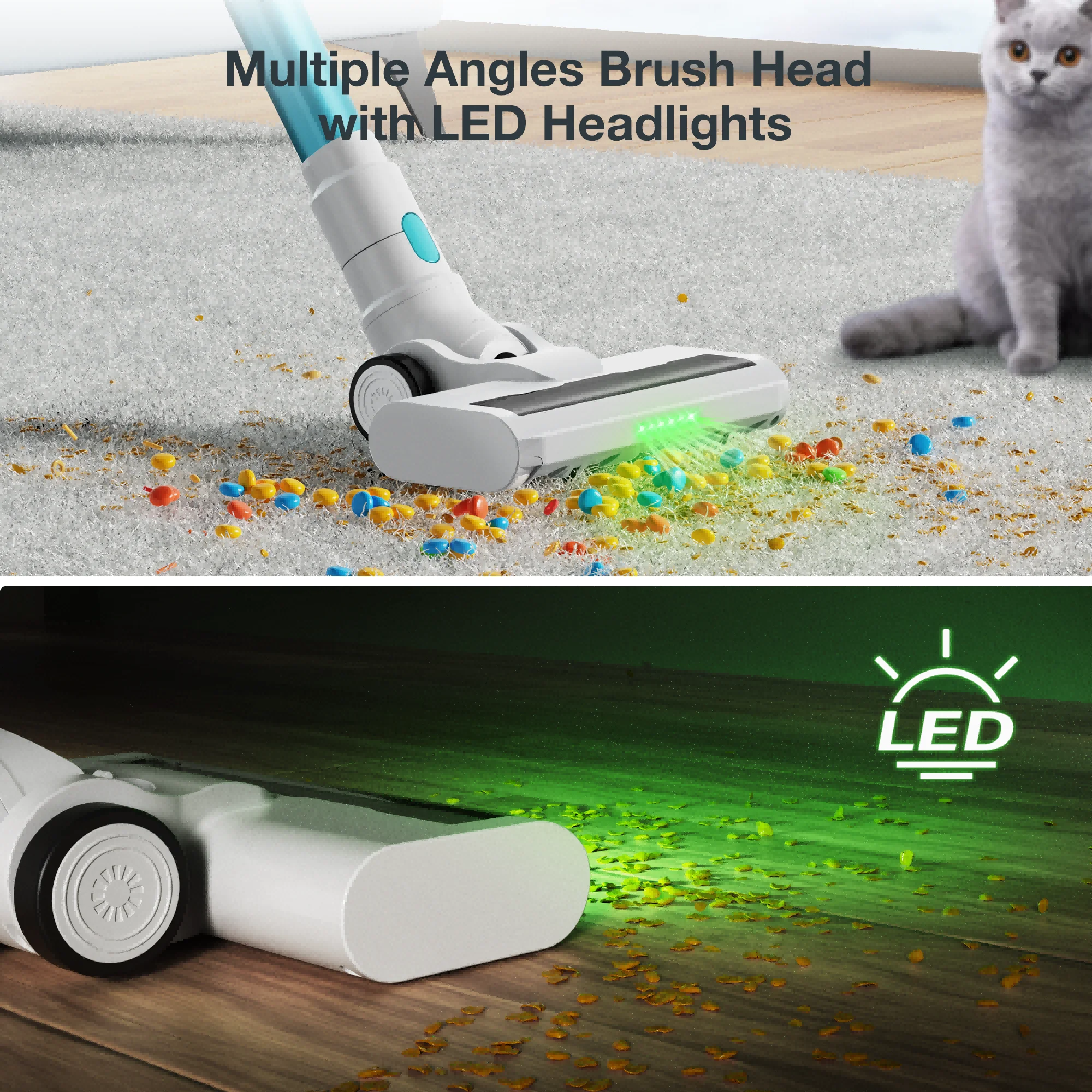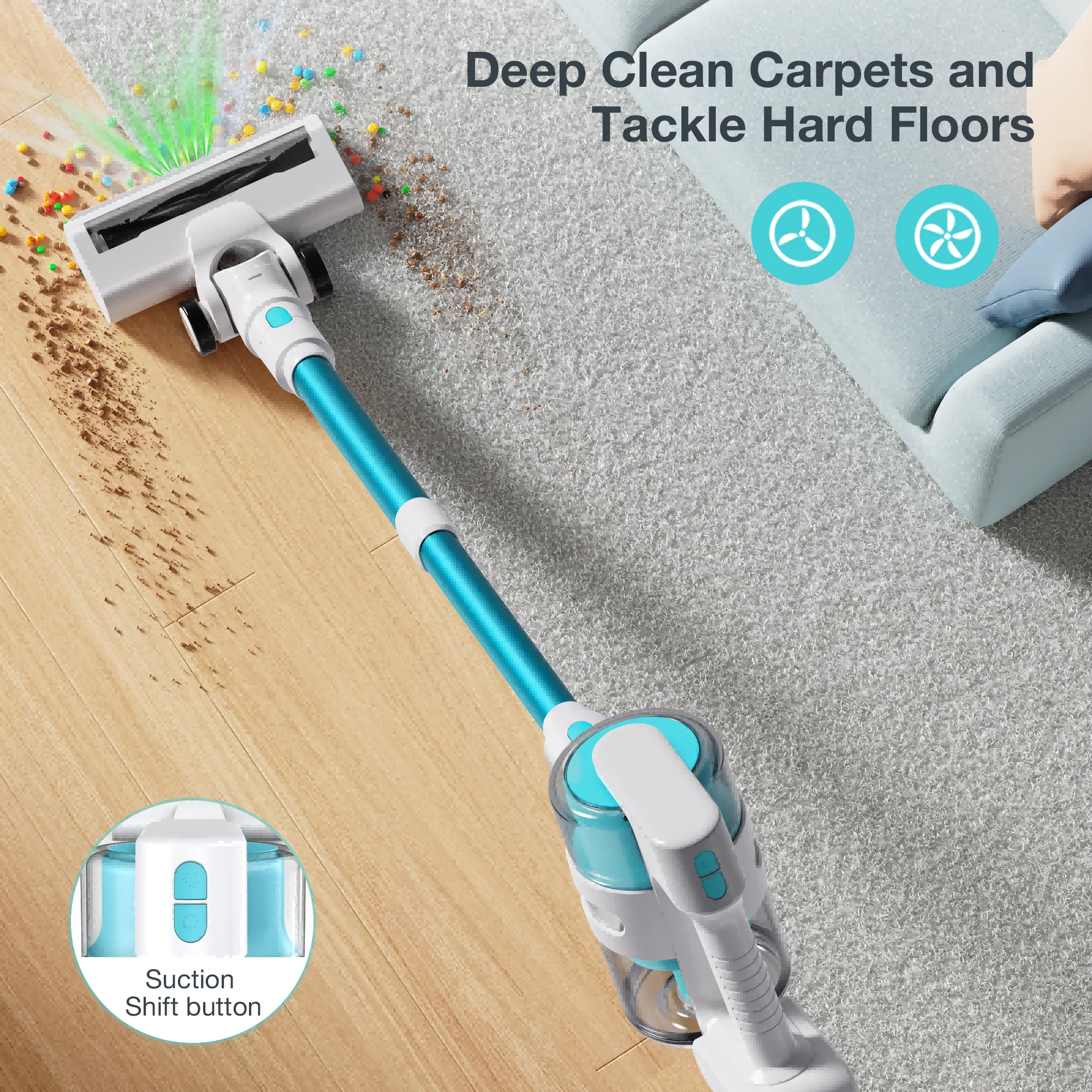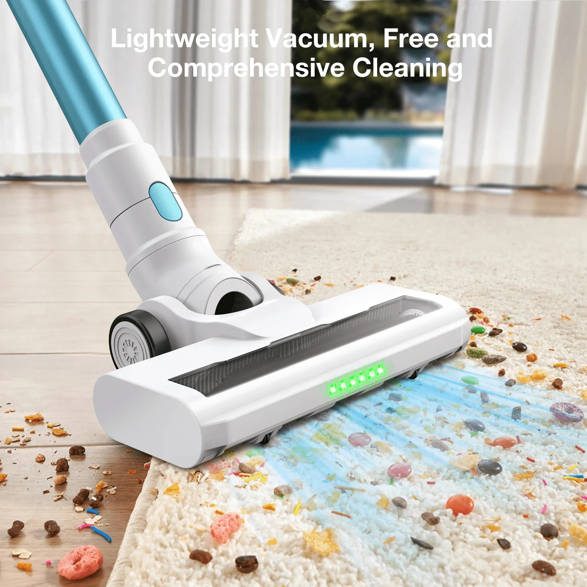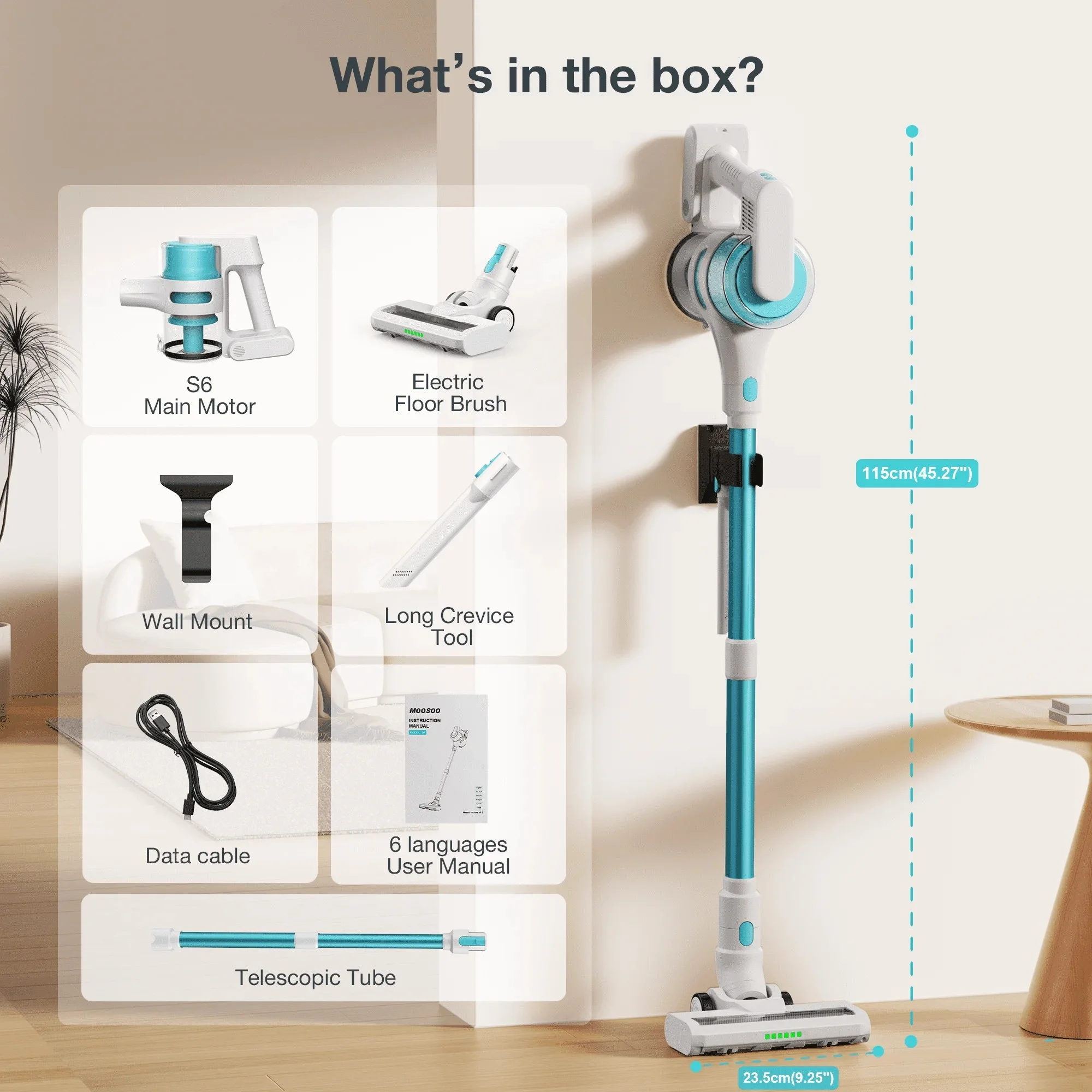Cordless Ultralight Stick Vacuum Cleaner for Hard Floors and Low-Pile Rugs Effortless Cleaning: Ideal for busy households, the MOOSOO S6 Cordless Stick Vacuum swiftly transitions from hardwood to rugs, ensuring a thorough clean quickly and easily. Ultra-Lightweight: Weighs less than 5 lbs and effortlessly converts to a hand vac in one quick step, tackling messes cord-free from floor to ceiling. Cordless Convenience: Offers up to 25 minutes of run time, ready for either a full house sweep or quick spot cleaning, delivering spotless results swiftly. Advanced Features: Features advanced HEPA filtration and LED headlights to illuminate and capture hidden dust and debris. Versatile Tools Included: Comes with a Crevice Tool, perfect for everything from quick tabletop cleanups to deep cleaning sofas. Maneuverability: Lightweight and easy to handle, it navigates tight corners and different surfaces with powerful, consistent suction. Enhanced Cleaning Experience: Includes a built-in trigger lock for extended cleaning sessions. Effective Filtration System: The 4-stage fully sealed filtration system purifies the air, capturing 99.9% of allergens, for a cleaner home environment.