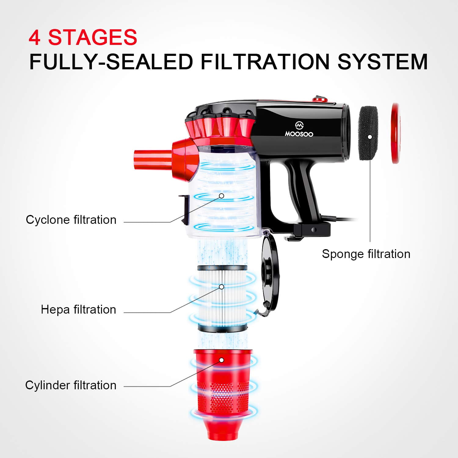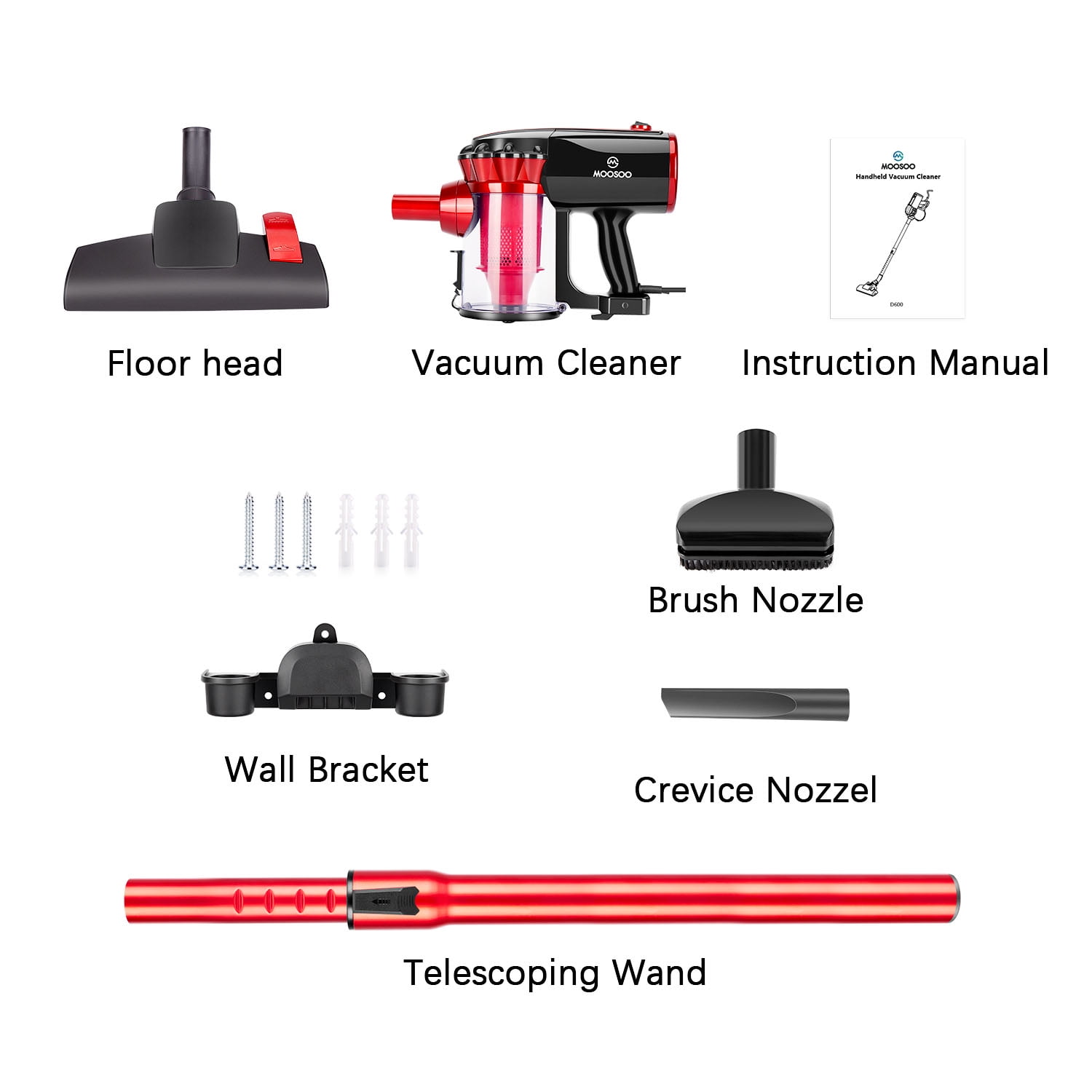 MOOSOO D600 Corded stick vacuum provides nonstop and stable high suction power for continuous cleaning. 2 Modes Selective: A Red button is designed for different cleaning requirements: button upward, good for normal floor cleaning tasks; button downward, the hard brush and soft rubber will drop down, perfect for deeper cleaning. 17Kpa Powerful Suction Perfect for marble, tile, and hardwood floors, pick up all debris, such as cat litter, dog food crumbs, and pet hair. Adjustable Tube A retractable tube allows you to freely adjust the length to meet your different needs. 18-30 inches adjustable length, easy to reach 10 feet high, such as ceilings and vents, etc. Long 23 feet power cord is perfect, it makes the suction stronger and cleans the garbage cleaner and more assured. Rotatable Brush Head – Flexible joints could free to clean the dirt under the furniture and bed and clean up dead corners. The brush head is easy to be controlled, feel free to control its direction where you want. 4 Stages Advanced Filtration System – Complete sealing design and high-density HEPA filter provide an excellent experience. HEPA and cylinder filters are washable. What you will get? -Main Motor -Rotatable Brush Head -Instruction Manual -Wall Mount Tool -Extra HEPA Filter -Cleaning Brush -Crevice Nozzle -Adjustable Extension Tube -Flexible Hose