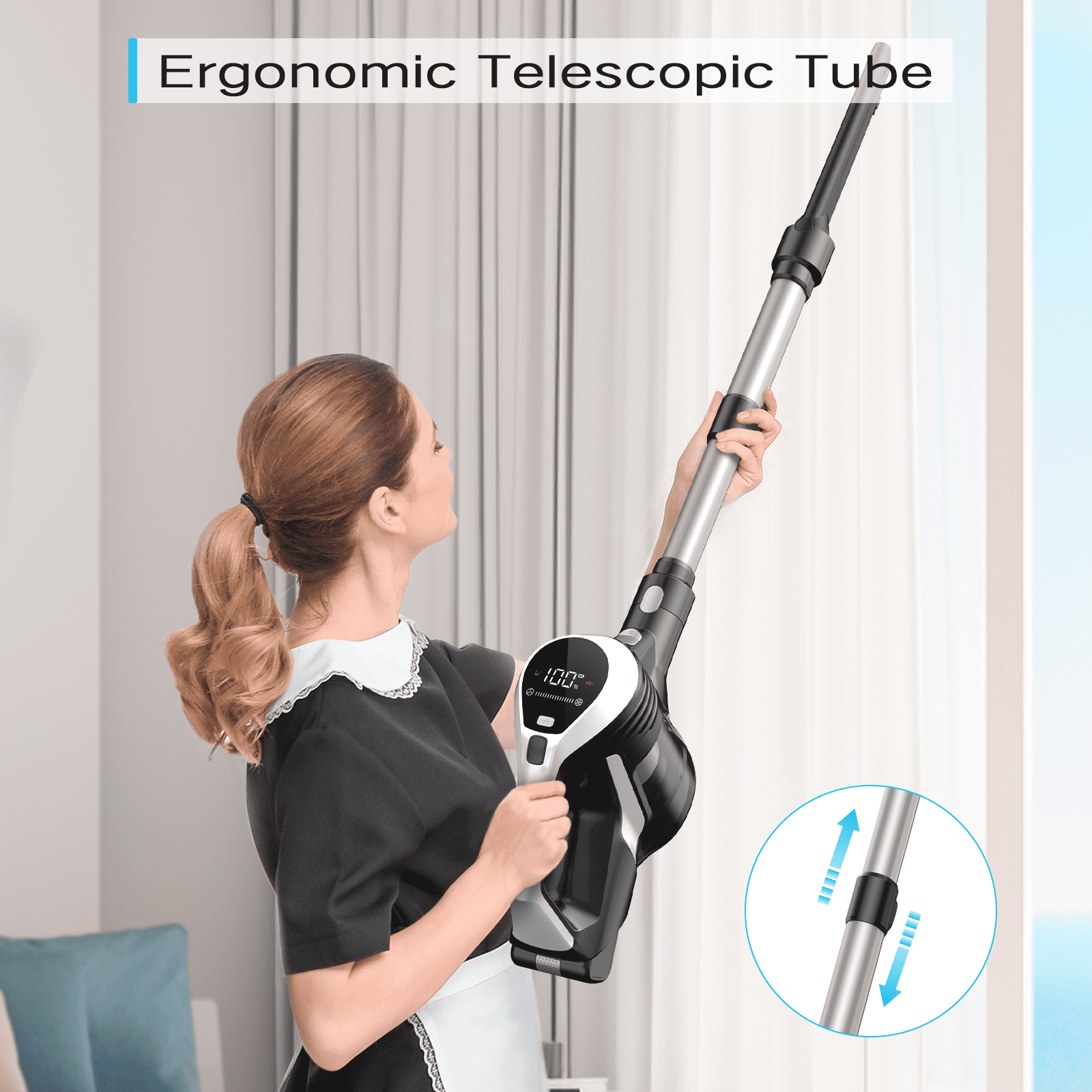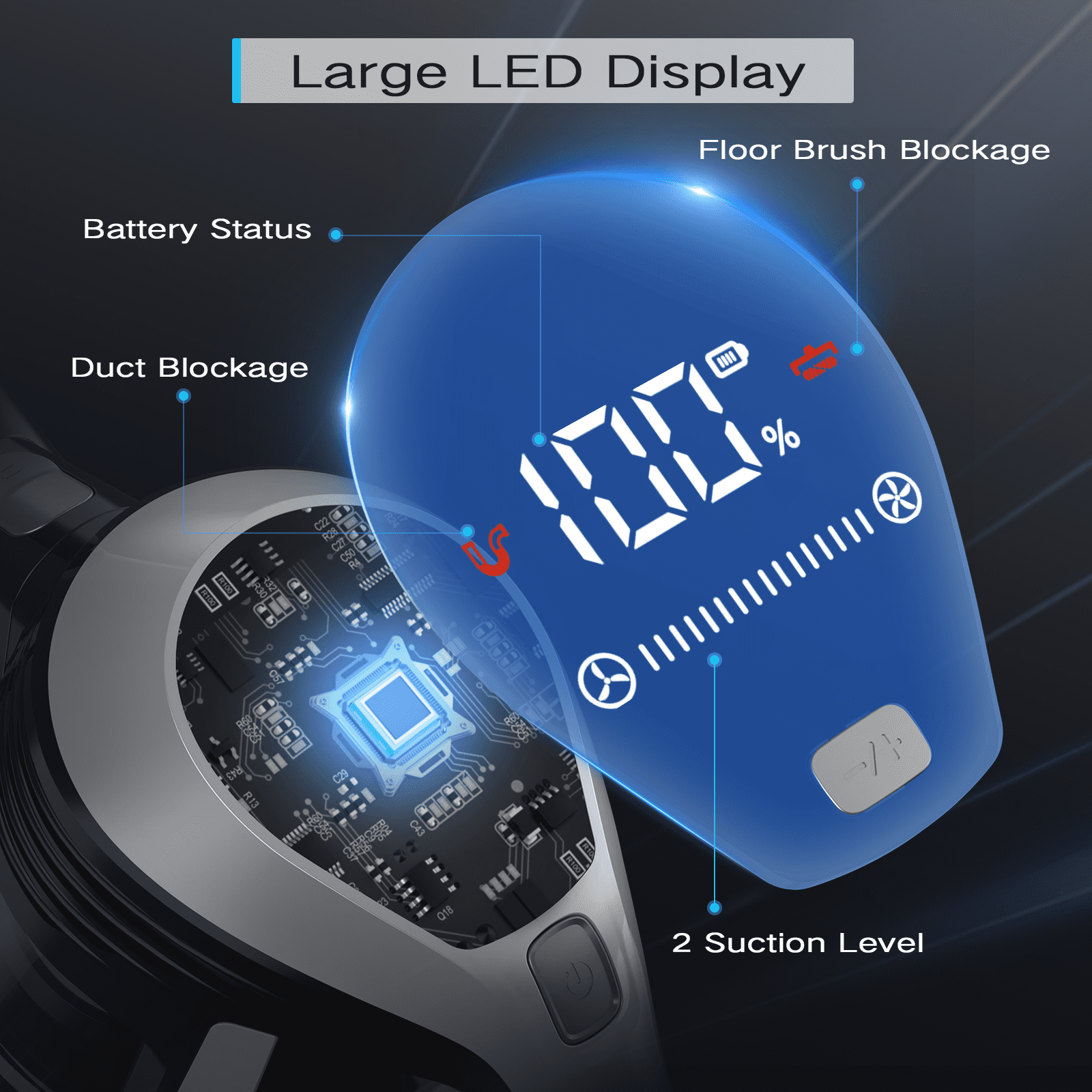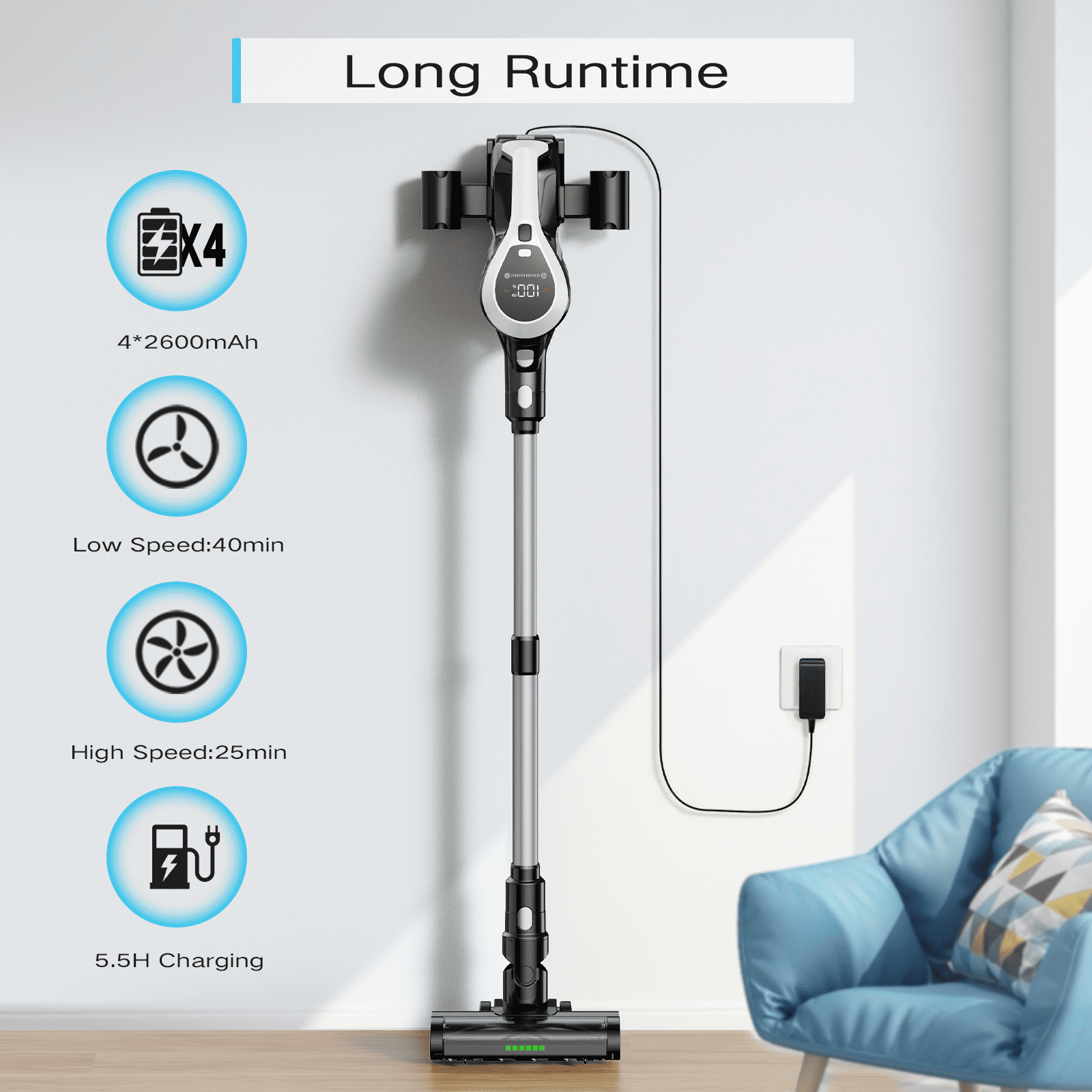 Moosoo Powerfule 25kPa Cordless Stick Vacuum Cleaner Powerful 11,000PRM brushless motor and 25Kpa suction for deep cleaning on all surfaces Large LED display shows battery percentage and suction mode for easy monitoring MultiCyclone+ Technology filters dust efficiently with 99.99% purification HEPA filtration to capture and trap dust, dander, and allergens Ergonomic stick vacuum has 2-in-1 crevice tool and 3m extendable hose reach hard-to-clean areas V-Shape LED motorized brush can illuminates in dark and prevents hair tangling 45 minutes of battery life cleans up to 1300 sq ft in one charge 800ml dustbin capacity and 1-year warranty enable worry-free cleaning