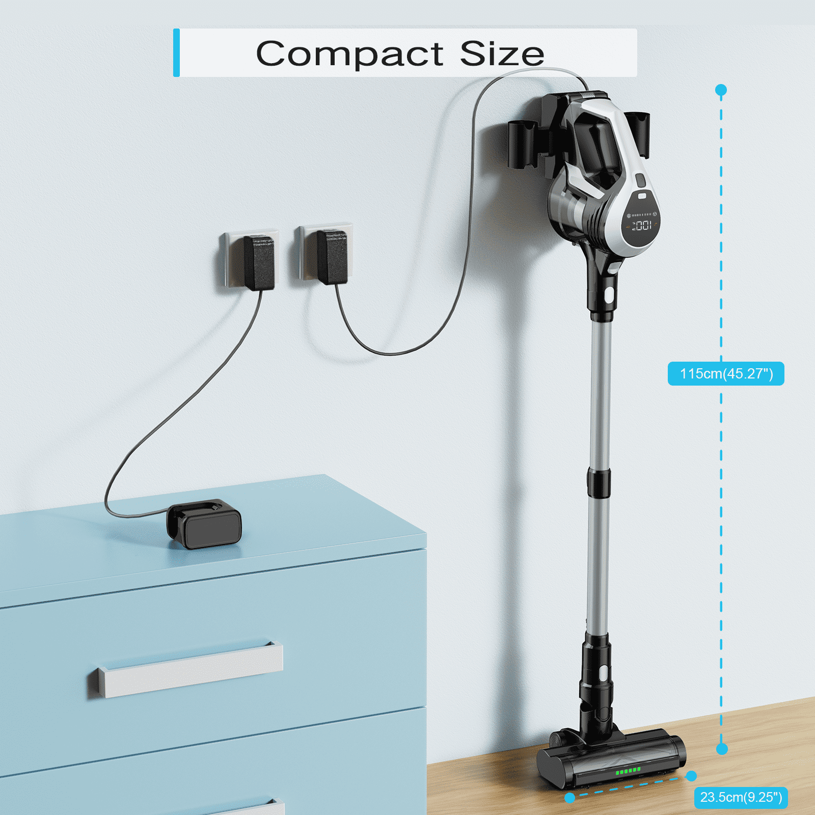 Experience Deep Cleaning: The MOOSOO cordless vacuum cleaner is equipped with an 11,000PRM brushless motor and 25Kpa suction power, ensuring efficient removal of dirt, dust, pet hair, and debris from carpets and hard floors. Stay Informed with LED Display: Large LED display on the stick vacuum cleaner allows you to easily monitor the battery power percentage and current suction mode. Additionally, a prominent red sign will alert you if the air outlet is blocked or if the floor brush gets stuck. Enjoy Dust-Free Filtered Air: The MOOSOO cordless vacuum cleaner incorporates advanced MultiCyclone+ Technology, which separates dust and gas with 99.99% efficiency. This ensures consistent and powerful suction while preventing HEPA filter clogging. V-Shape LED Motorized Brush: Illuminate even the darkest corners of your home with the V-Shape LED motorized brush of the cordless vacuum. The unique V-shaped brush prevents hair tangling, providing hassle-free cleaning without the need for constant maintenance. Long-Lasting Working Time: With a battery life of up to 45 minutes, our cordless vacuum ensures uninterrupted cleaning for spaces up to 1300 square feet in a single charge. Tailor Your Cleaning Experience: Our cordless vacuum features an ergonomic design with a 2-in-1 crevice tool, and floor brush, allowing for seamless switching between cleaning tasks. It also includes an extendable hose and wand that can reach up to 3 meters, making it effortless to clean hard-to-reach areas. TC1-MATE You will receive 1 x TC1 Vacuum Main Motor 1 x Retractable Metal Tube 1 x LED Motorized Floor Brush 1 x 2 In 1 Crevice Brush 1 x Retractable Hose 1 x Wall Mount 1 x Adapter 1 x Additional HEPA 1 x Instruction manual