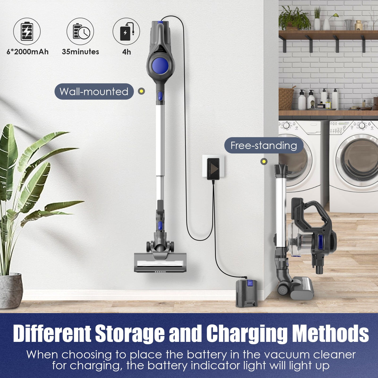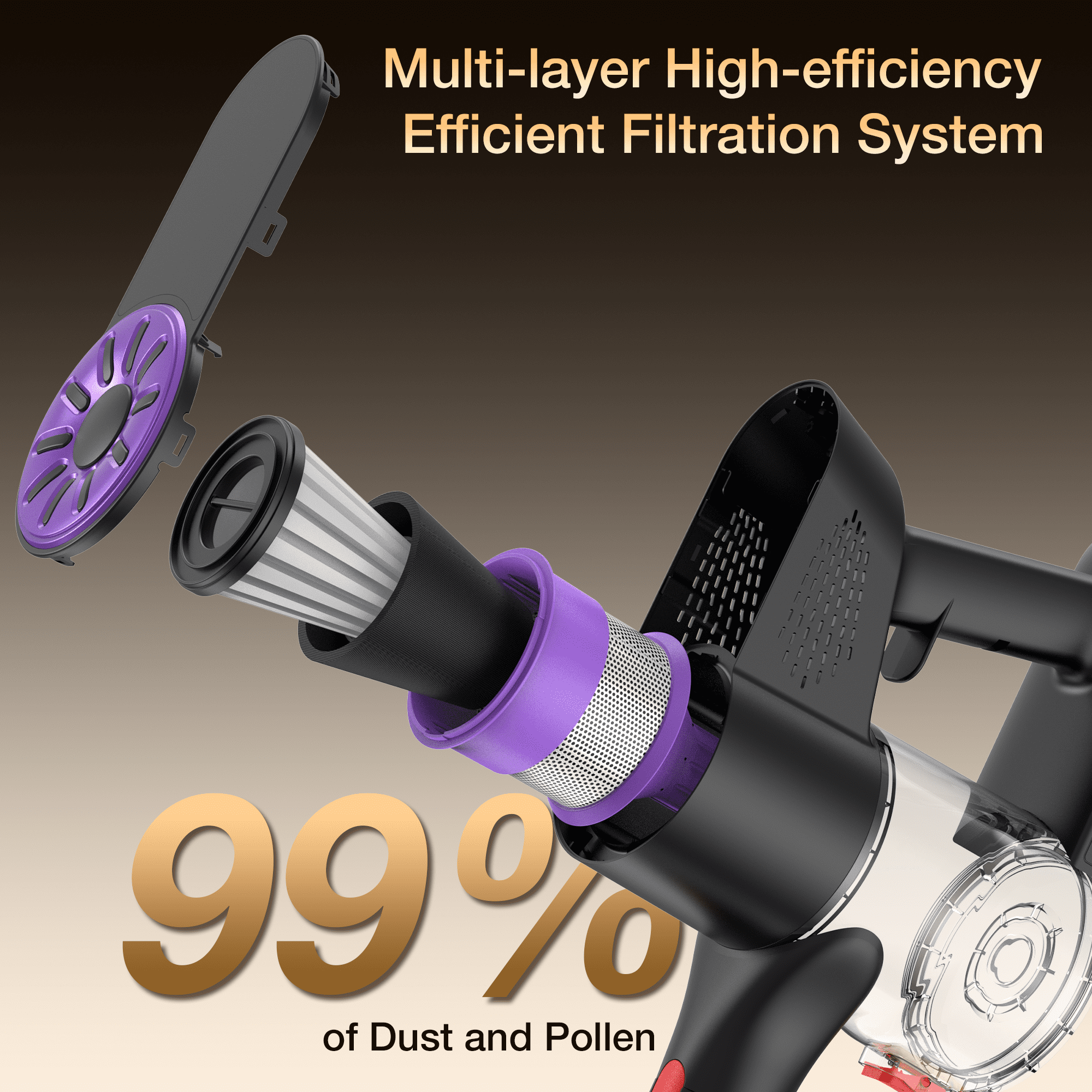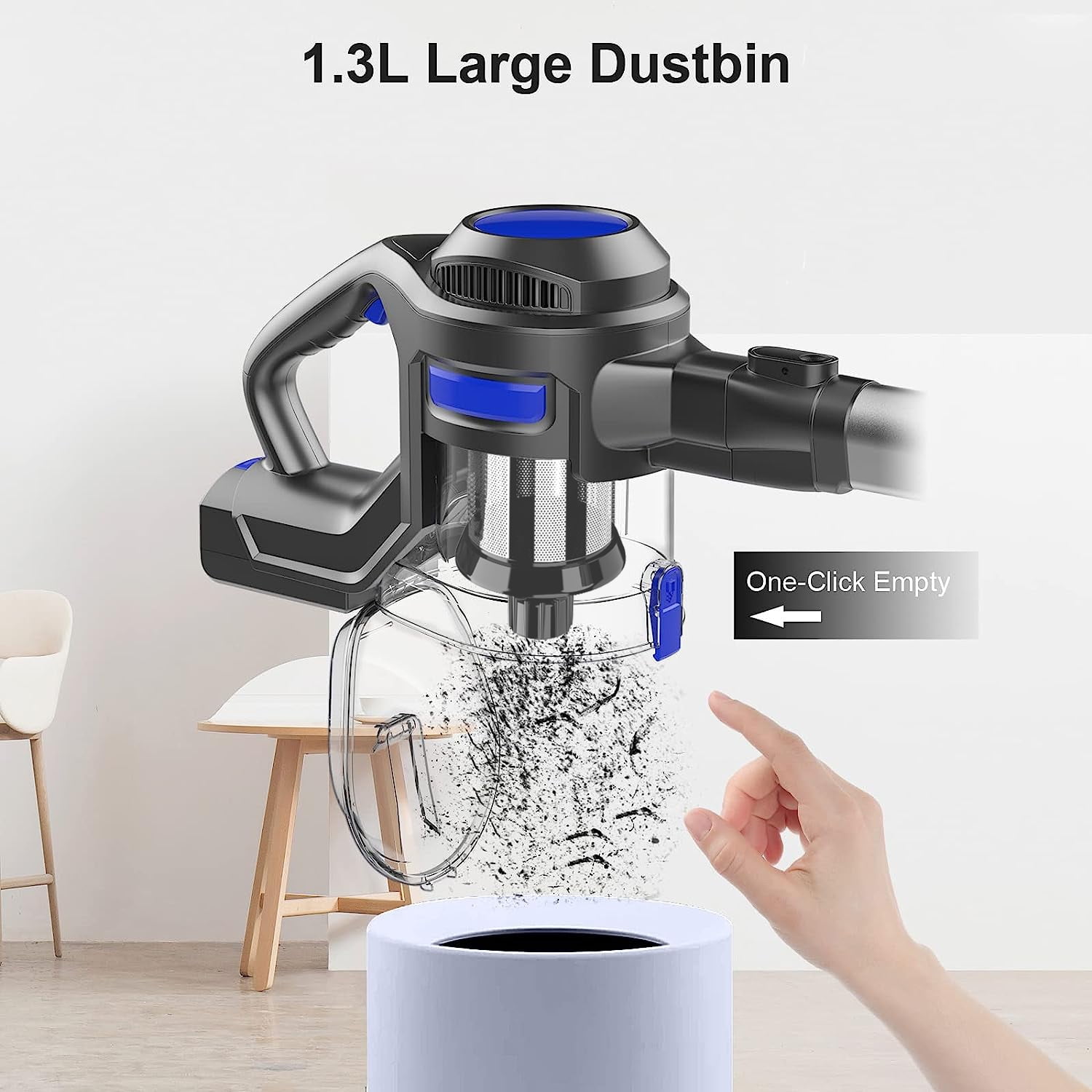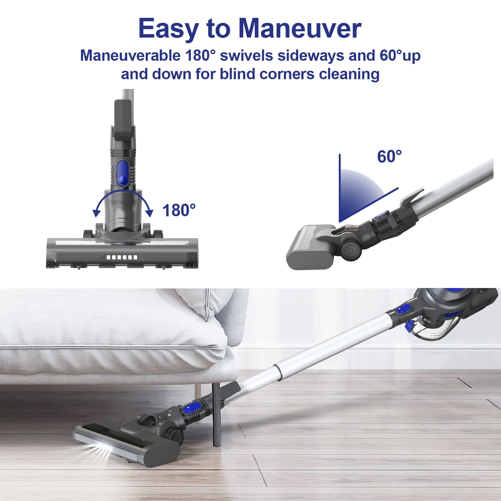 Performs Well on All Floors 1.3L Largest Dust Cup for Stick Vacuum 120 Degree Whirling Flexible Floor Head 4 Stage Cyclonic Washable Filtration System Wall Mount – Easy for Storage 4-in-1 Multi-use Design for Different Cleaning Needs LED Floor Head Track Dust Every Dark Corners