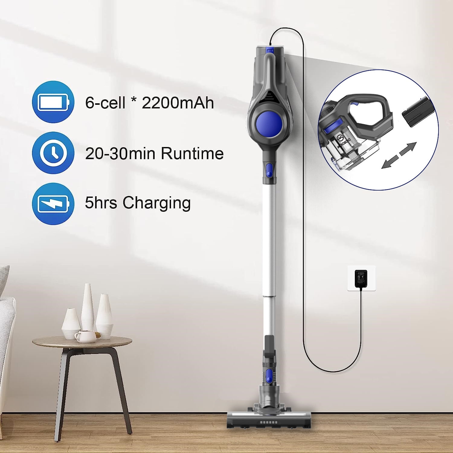 MOOSOO XL-618A stick vacuum just designed for you. 4-in-1 fuction 12Kpa suction power to speed your deserve, equipped 1.3L largest Dust Cup than any other brand vacuums, ideal for families with kids and pets. It is designed to be used for regular cleaning as efficient as possible! [Super Long-lasting Time& Powerful Suction]: outstanding 20-35mins running time ensures thorough cleaning all around the house. The updated motor provides 120-watt powerful suction to meet every cleaning demands, picking up debris and dusts, crumbs and pet hairs in minute. It performs well on all kinds of hard floors, carpet, stairs and windowsills, sofa and bed, desk and curtain, etc [High-efficiency Cyclone + Washable HEPA Filter System]: it creates a high speed rotating airflow to remove particulates from air. Plus high-density HEPA which removes up to 99.97% of microscopic dust particles as small as 0 3 microns. Rated power: 120W Max Suction: 12Kpa; Standard Suction: 8Kpa Working time: 20-35mins running Dust tank capacity: 1.3L Noise: less 70dB Net weight: 5.22lb Recommended use: Hard Floor, Thin Carpet