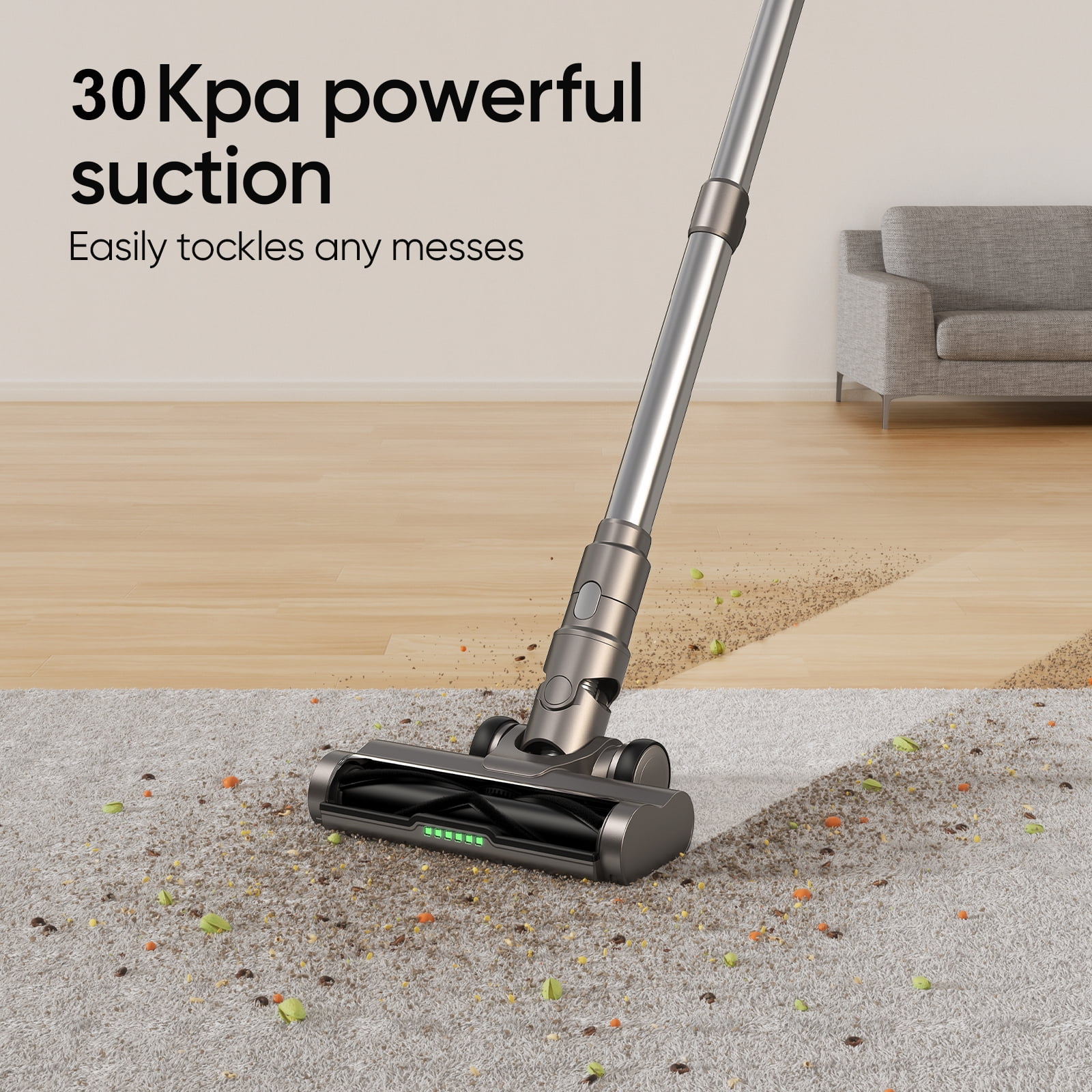 Powerful Suction: 30Kpa large suction, can prevent pipe blockage Long Run Time: 2200mah*7 ultra-large capacity battery, providing 40 minutes of ultra-long working time Large Dust Cup: 800ml large-capacity dust cup, one-click dust removal LED Display: The status of the cordless vacuum cleaner is clear and easy to operate High Efficiency Filtration: Washable HEPA, stick vacuum cleaner with 99.99% separation efficiency Built-in Flashlight & LED Floor Brush: TD1 mate cordless vacuum with built-in flashlight and green light floor brush, illuminate the dark to clean dirt V-Shaped Floor Brush: V-shaped motorized floor brush prevents hair from tangling, is suitable for family with pet. Lightweight & Portable: 3.13lbs ultralight portable cordless vacuum cleaner with adjustable rod, easy to clean. Indicator Lights: TD1-mate stick vacuum cleaner has the indicator breathing light (different colors for different suction power)