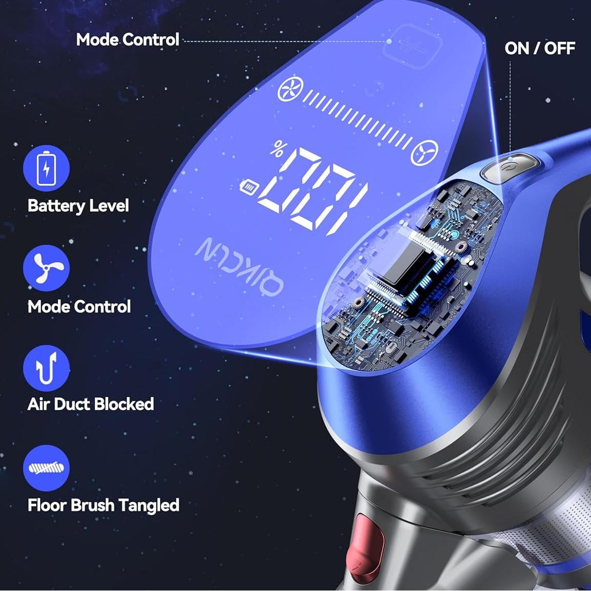 MOOSOO YC1 Cordless Stick Vacuum Cleaner Smart Digital Display – Shows real-time battery level, suction mode, and error alerts 18Kpa Powerful Suction – Easily picks up pet hair, debris, and cat litter 180°+90° Swivel Steering – Flexibly cleans under furniture and tight corners Triple LED Headlights – Illuminates hidden dust in dark areas Anti-Tangle Brush Roll – Special design minimizes pet hair wrap 6-in-1 Versatile System – Includes tools for floors, furniture, and crevices 25-Min Max Runtime – Long-lasting battery for extended cleaning Ultra-Lightweight (3.3 lbs) – Easy to carry and maneuver
