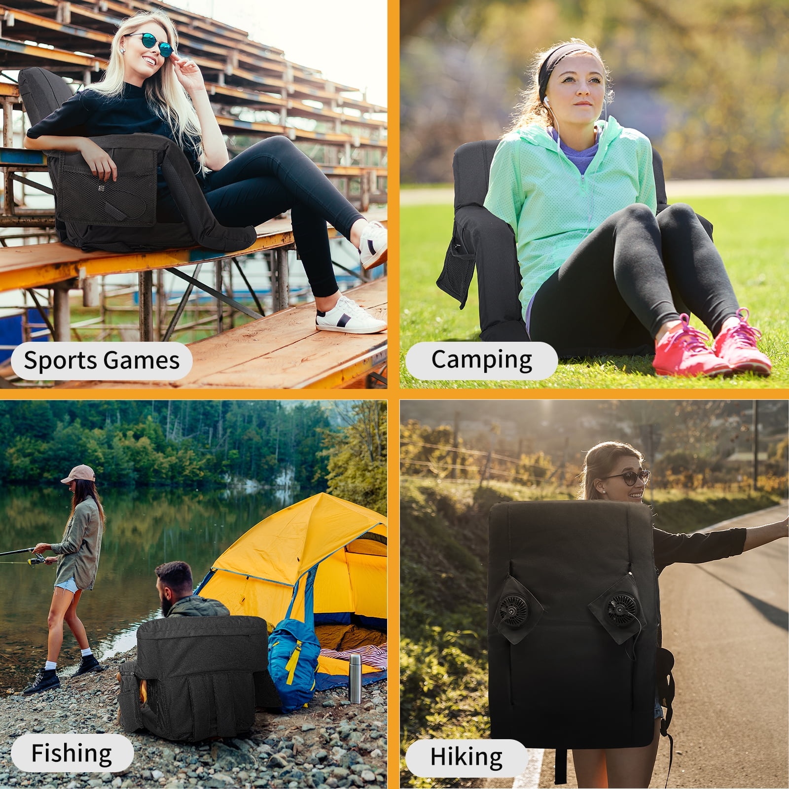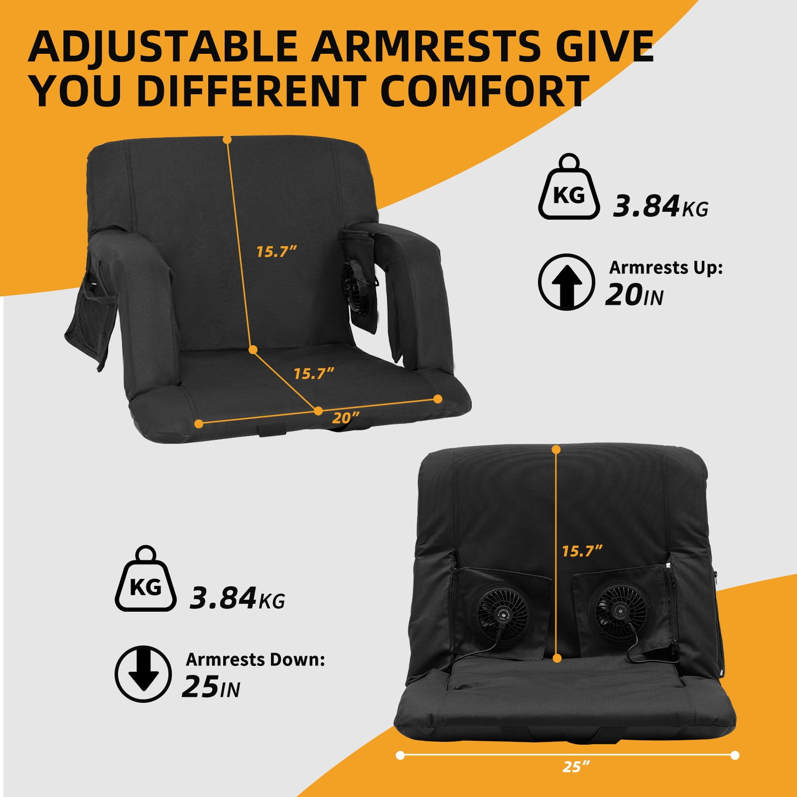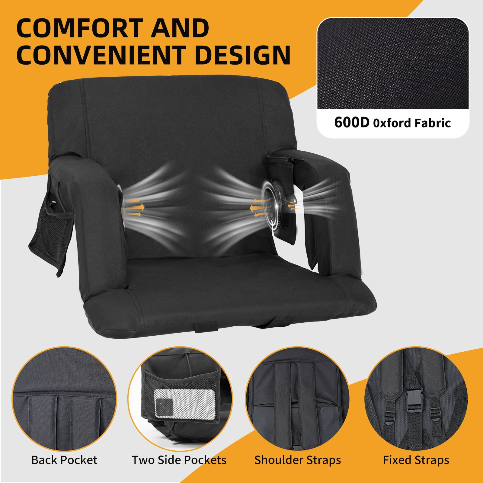 【Dual Fans Stadium Seats】:Beat the heat effortlessly with two detachable, high-speed fans offering 5 adjustable airflow levels. Whether you crave a gentle breeze or turbo-cooling, this seat delivers rapid relief even on scorching days. 【5-Position Recline System】:The ergonomic backrest effortlessly adjusts from upright seating to full 180° flat positioning, while three intermediate angles provide optimal support for different activities. The stadium seat’s innovative ventilation design works with the sweat-resistant surface to keep you cool even during intense game moments. 【Cool Seat with Smart Storage】:This ultra-portable stadium seat keeps you comfortable while storing essentials. Its lightweight, foldable design with dual shoulder straps makes transport effortless. The built-in pockets securely hold your phone, and drinks. Perfect for sports, concerts, or outdoor events—everything you need stays within reach. 【Built Tough, Stays Comfy】:Crafted from heavy-duty Oxford fabric, this seat cushion delivers lasting durability with breathable comfort. The reinforced construction reliably supports up to 350 lbs, while the quick-dry surface shrugs off spills – just wipe and go. 【Go Anywhere, Do Everything】:Your perfect companion for sports games, beach days, camping trips, and more – this cooling stadium seat adapts to parks, bleachers, tailgate parties, and even makes a thoughtful gift.