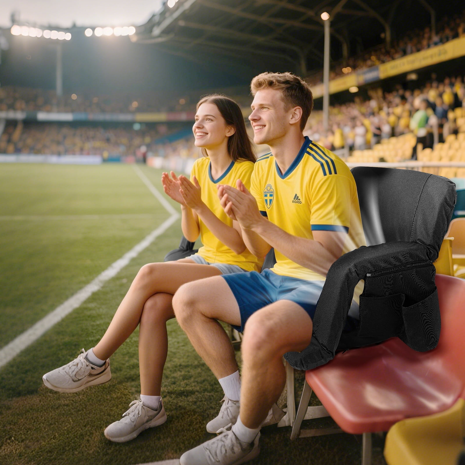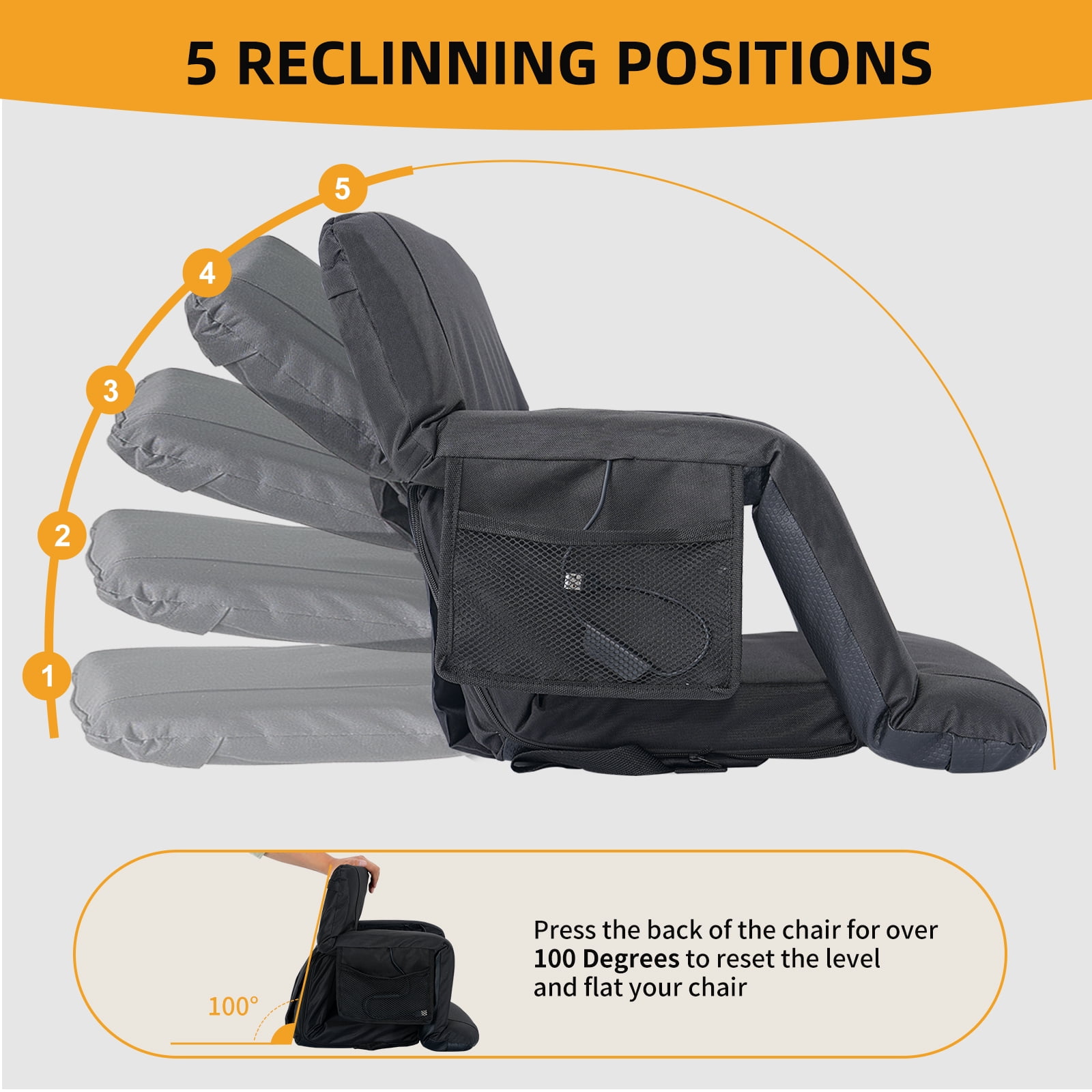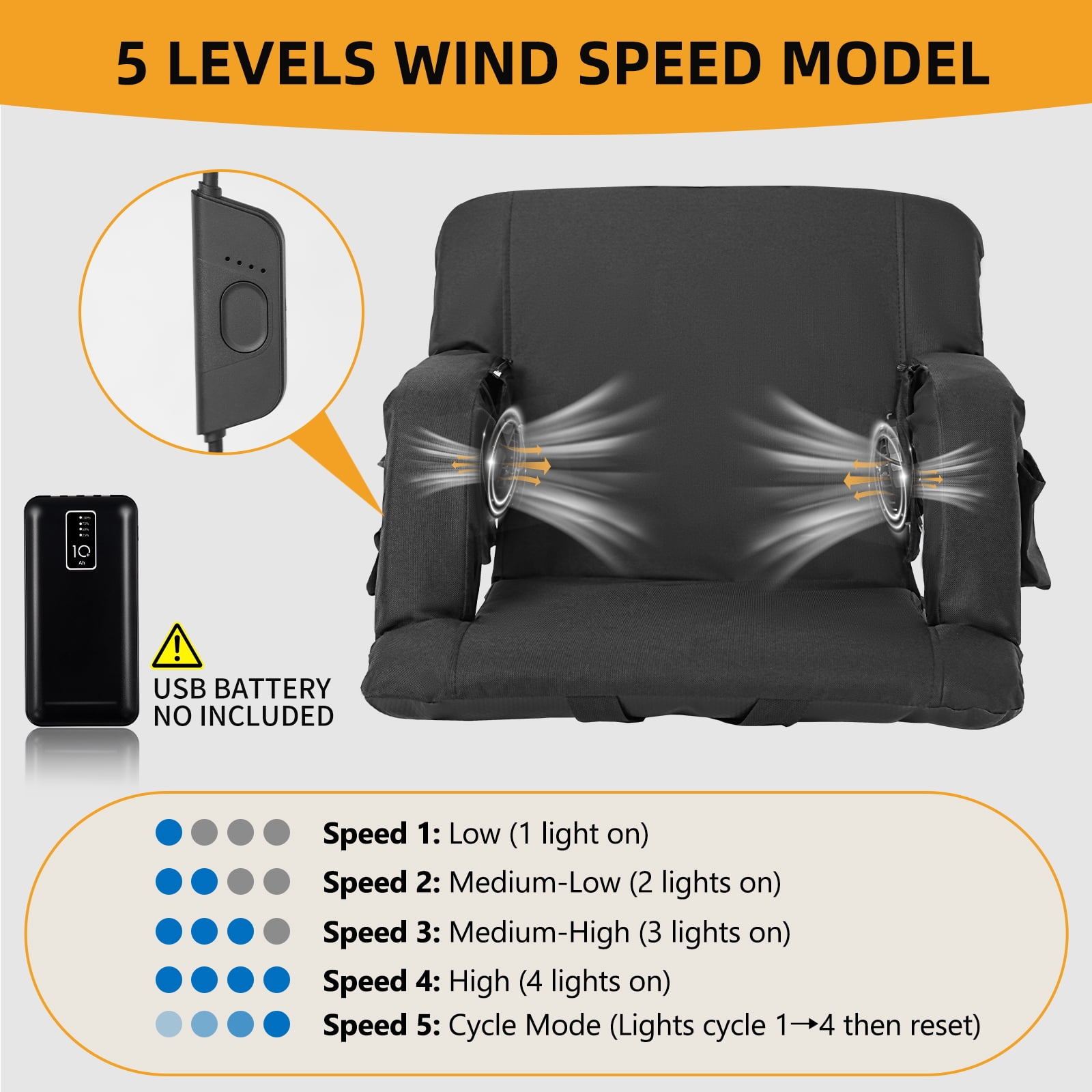 【Dual Fans Stadium Seats】:Beat the heat effortlessly with two detachable, high-speed fans offering 5 adjustable airflow levels. Whether you crave a gentle breeze or turbo-cooling, this seat delivers rapid relief even on scorching days. 【5-Position Recline System】:The ergonomic backrest effortlessly adjusts from upright seating to full 180° flat positioning, while three intermediate angles provide optimal support for different activities. The stadium seat’s innovative ventilation design works with the sweat-resistant surface to keep you cool even during intense game moments. 【Cool Seat with Smart Storage】:This ultra-portable stadium seat keeps you comfortable while storing essentials. Its lightweight, foldable design with dual shoulder straps makes transport effortless. The built-in pockets securely hold your phone, and drinks. Perfect for sports, concerts, or outdoor events—everything you need stays within reach. 【Built Tough, Stays Comfy】:Crafted from heavy-duty Oxford fabric, this seat cushion delivers lasting durability with breathable comfort. The reinforced construction reliably supports up to 350 lbs, while the quick-dry surface shrugs off spills – just wipe and go. 【Go Anywhere, Do Everything】:Your perfect companion for sports games, beach days, camping trips, and more – this cooling stadium seat adapts to parks, bleachers, tailgate parties, and even makes a thoughtful gift.
