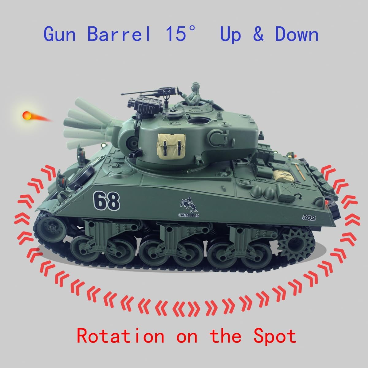 Sherman M4A3 RC Tank Car Toy, 15 Channels, 1/20 Scale. Simulates muzzle retraction, barrel recoil, firing sound effects, LED lights. The remote-controlled tank fires BB bullets with a range of up to 9 inches. 2.4Ghz high-frequency remote control, powerful motor and track to overcome a variety of terrain. The turret of the remote-controlled tank rotates 180 degrees, and the barrel moves up and down 15 degrees. NOTE: Charge for 5-7 hours and use for 15-20 minutes.Use under adult supervision. Pairing Method: Turn on the remote control tank first, then turn on the remote control.
