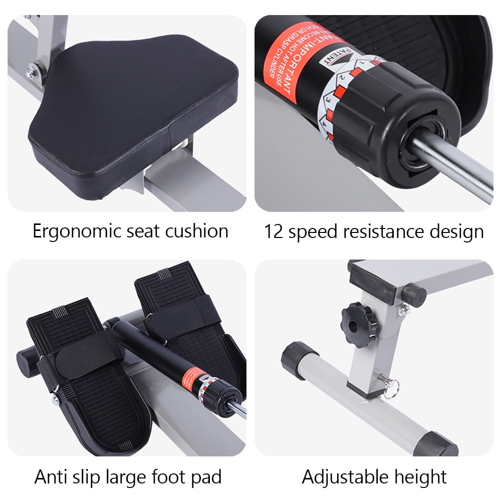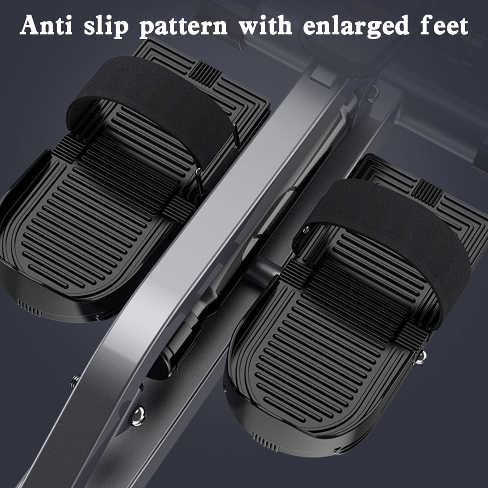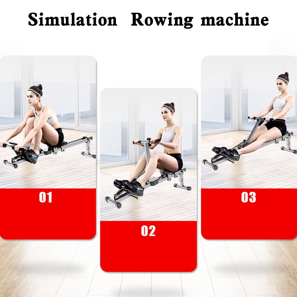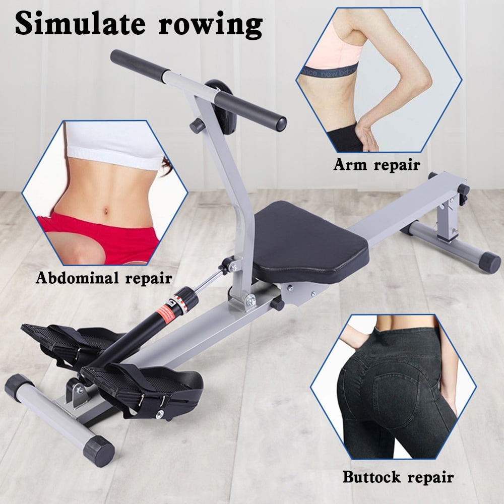 Product details This Rowing Machine provides all the benefits of a rowing workout in the comfort of your own home. With a smooth glide seat you can adjust the intensity of your fitness routine to your exact specifications and needs. This rowing machine has a heavy-duty commercial grade steel frame with a simple design to provide an even rowing experience for both arms and your entire body. It has foot straps to fit your athletic ability and comfort level with pivoting foot plates for added comfort. This is an ideal machine for low-impact exercise when at home. Its compact design makes it easy to store when not in use. adjustable Hydraulic cylinder resistance system Targets multiple muscle groups simultaneously: arms, back, abs, glutes, and legs. Large anti-slip foot plates with adjustable straps for secure footing. Ergonomically padded seat with cushioned non-slip grip handlebars offers comfort and support. LCD Computer displays time, count, total count, calories burned, and scan. Max user weight: 260 lbs(120kg). Features The LCD monitor displays your time, count, total count, calories, and scan., The fully cushioned handle allows for a wider range of motion, giving you a more intense upper body workout with multiple levels of adjustable tension., Textured non-slip foot pedals and foot straps will help maintain footing during the most demanding and vigorous workouts!, Extra padding and cushion ensures proper blood flow in the glutes for prolonged and vigorous workouts., Fluid inside the hydraulic piston provides smooth and challenging resistance.Different resistance levels allow for easy adjustability., Adjust the height of each foot leveler to create a balanced rowing experience, even on uneven floors. Specifications: Material: Iron, Plastic, PU Color: Black/Gray Weight Capacity: 250 lbs(120KG) Resistance Mechanism: Hydraulic Department: Unisex Item Dimensions LxWxH:as picture