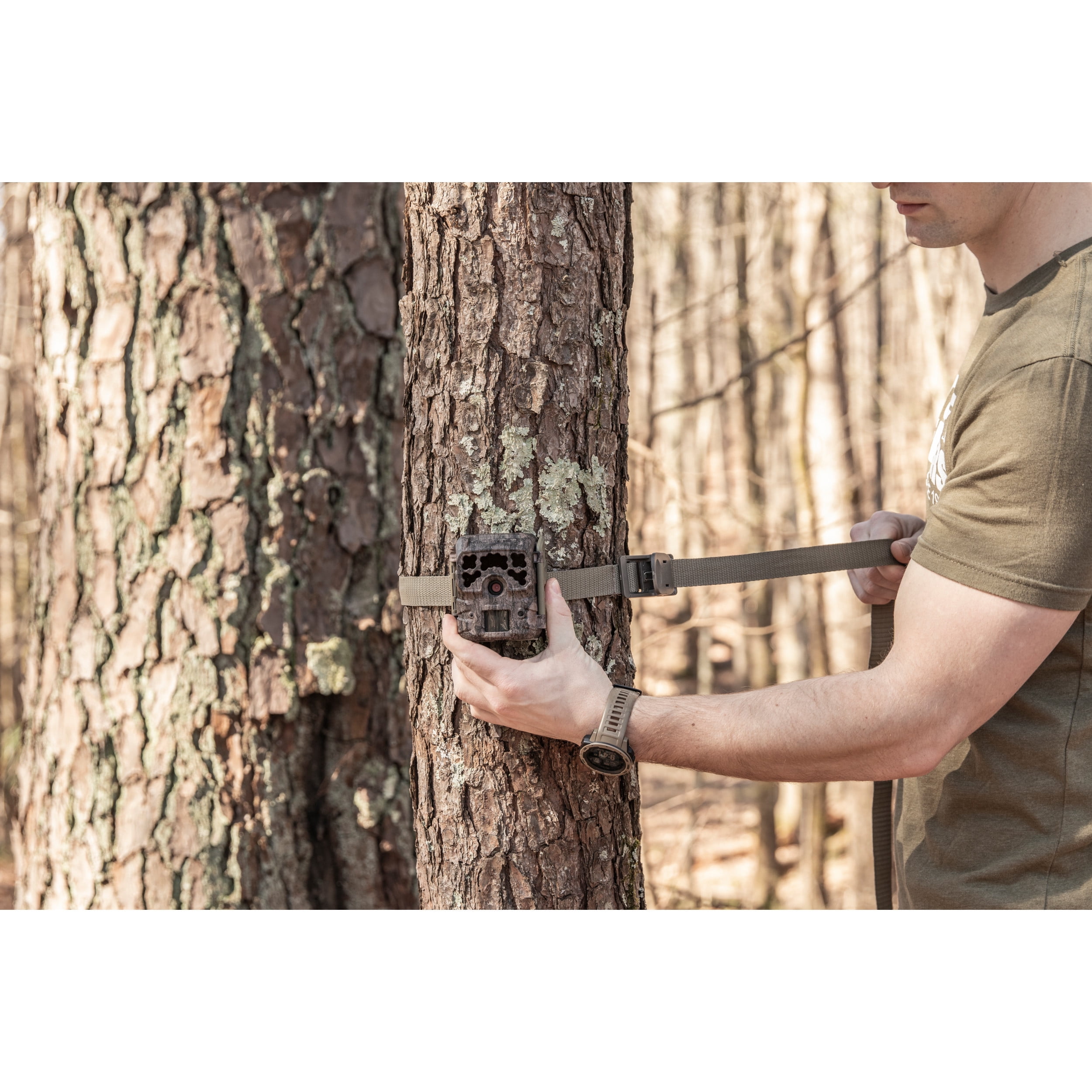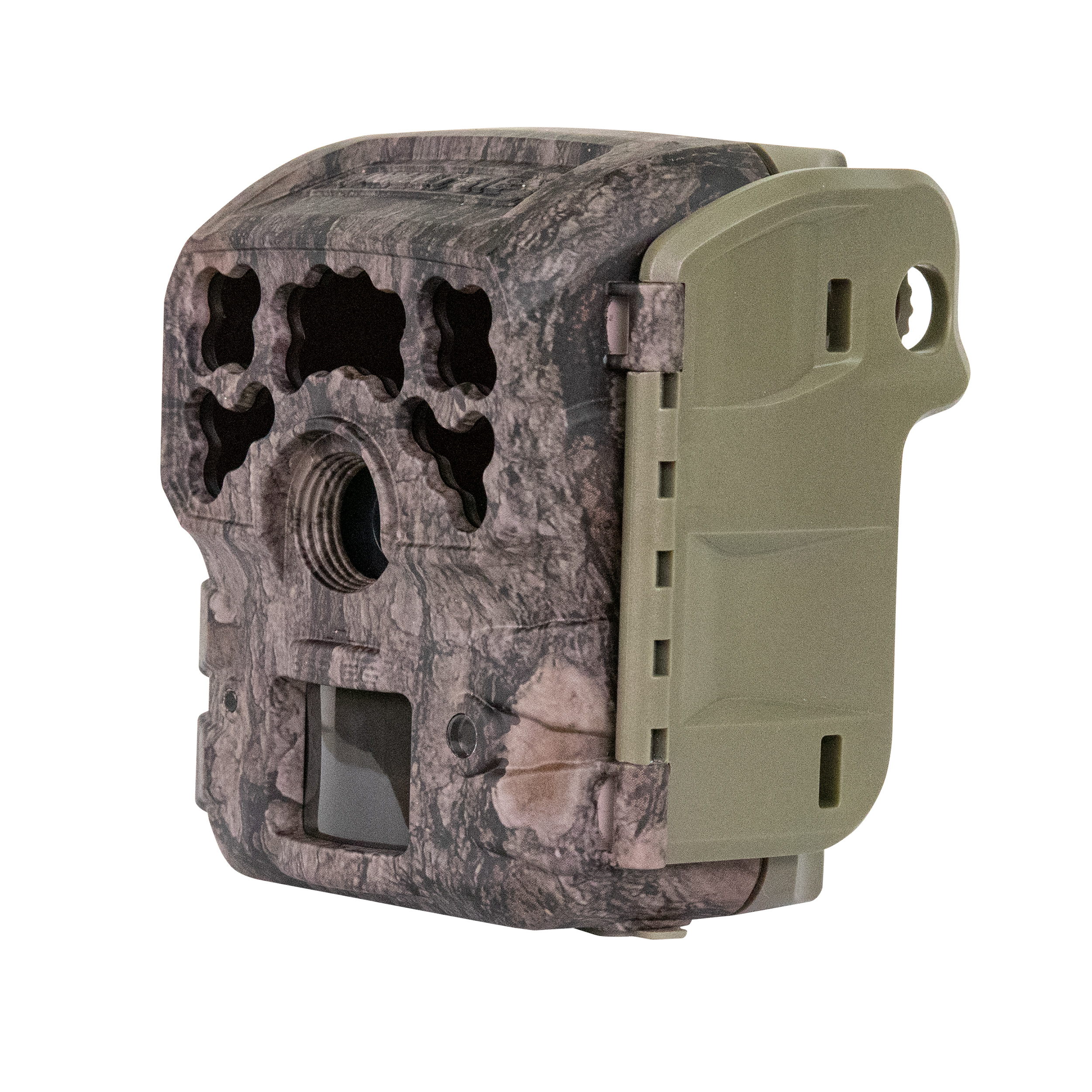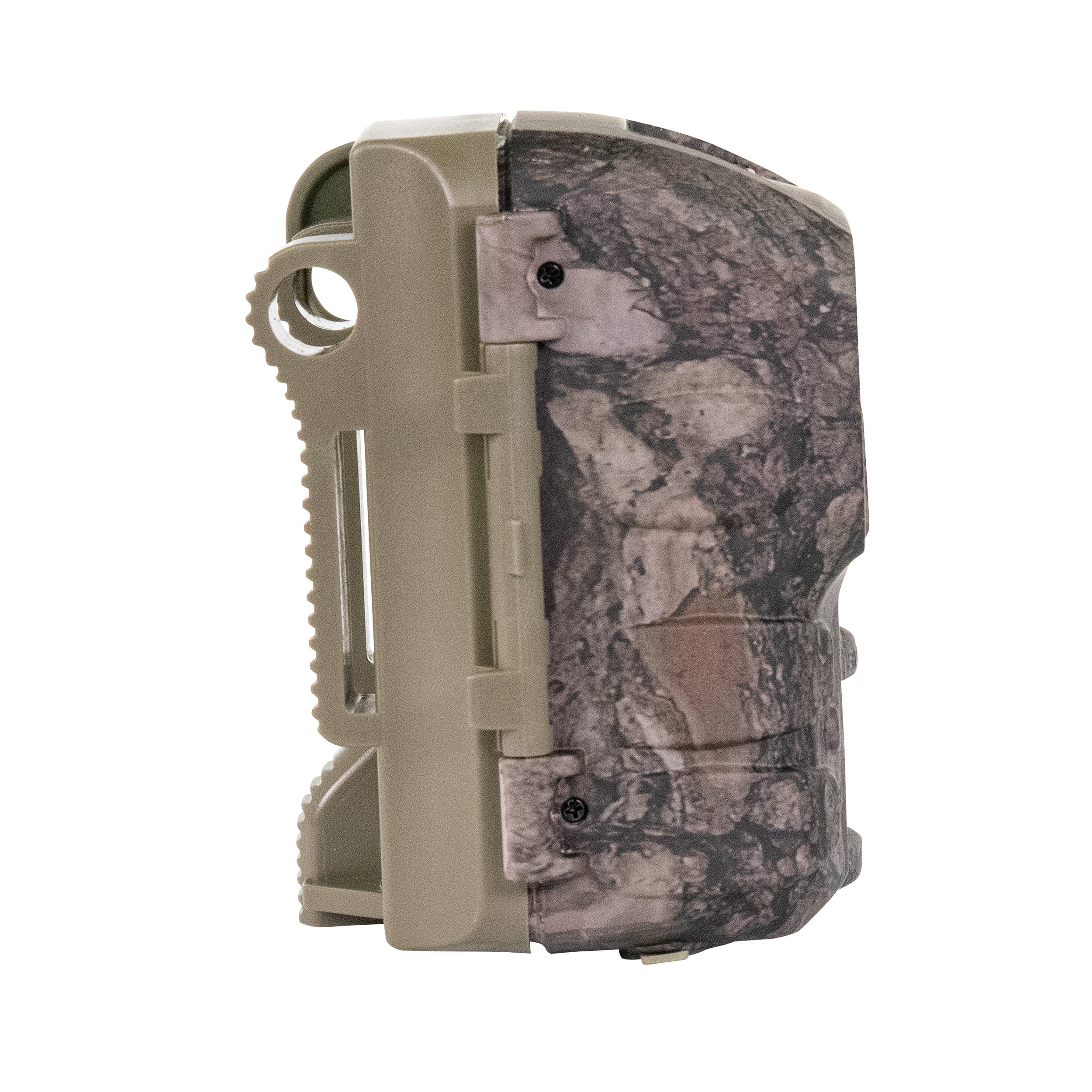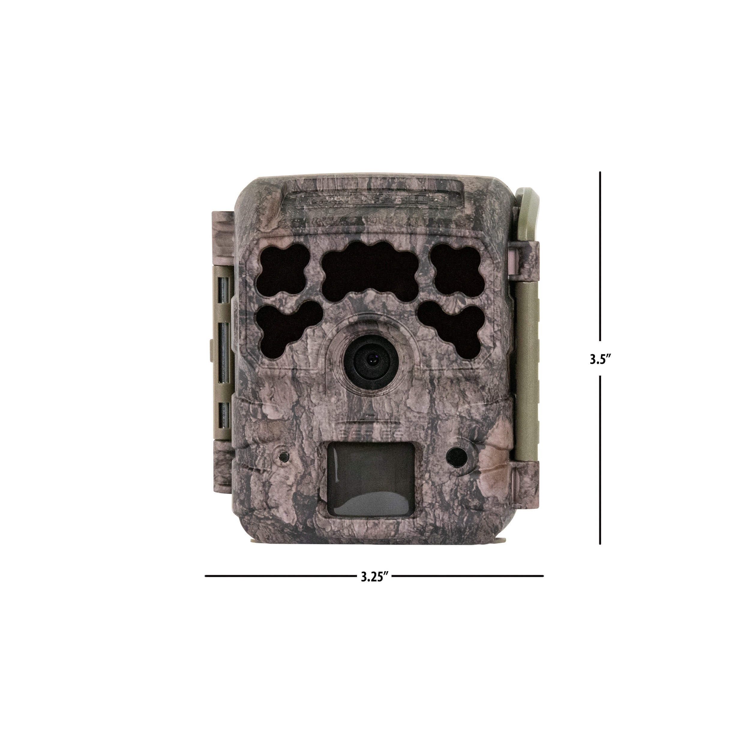 Megapixels: 42MP HD Video: 1280×720 (no audio) Dimensions of Camera: 3.25” W x 3.5” L x 2.625” D Trigger Speed: 0.4 sec. Detection Range: 70 ft. Flash Range: 80 ft. Type of Flash: Invisible infrared flash technology Battery Life: Up to 13,000 images Batteries: 4 x AA (included) Capture Mode Options: 1 photo at low resolution, 1 photo at high resolution, 3 photos at low resolution, 3 photos at high resolution, OR video SD Memory Card: Up to 32 GB (sold separately) Warranty: Up to 2 years Camo Pattern/Decoration: Pine Bark Performance specs will vary depending on user settings and environmental conditions