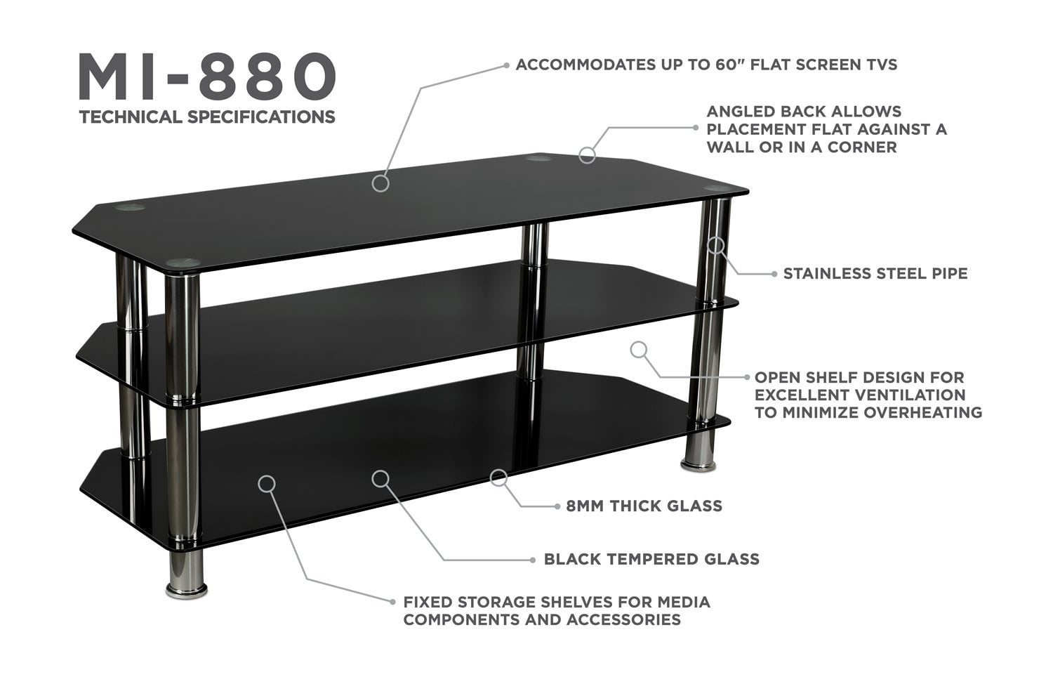 Mount-it! glass TV stand for flat screen televisions Mount-it! MI-880 TV glass stand will bring your living room to the next level. This contemporary entertainment center provides ample space to keep your entertainment system components. This TV stand measures 45 inches wide by 17.75 inches deep and can be used with all modern TVs with screen sizes of up to 60 inches. Designed with 8mm thick premium tempered glass as the main material for safety. The shelves can easily carry the weight of most flat-panel TVs on the market with up to 60 inches in screen size. The shelf holds a capacity of 143 lbs. top shelf and 77 lbs. middle and lower shelf. The ample depth and width of the two additional bottom shelves provide open space for cable boxes, DVD players, AV receivers, streaming devices, and gaming consoles. The angled backsides allow this glass console to be placed in corners and the TV can be pushed as close as possible to the wall to create more distance to viewers in a small room. All necessary instructions and hardware included.