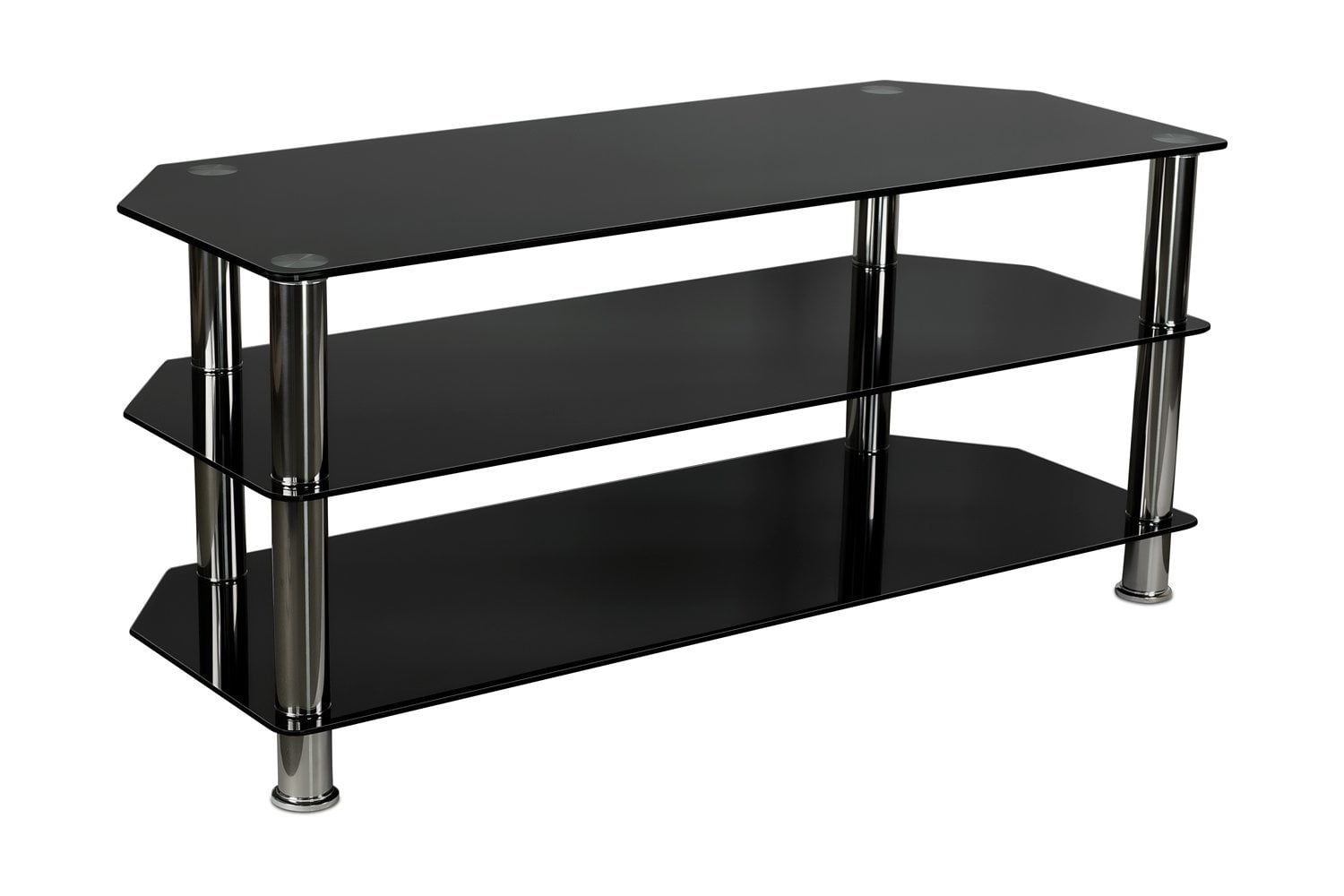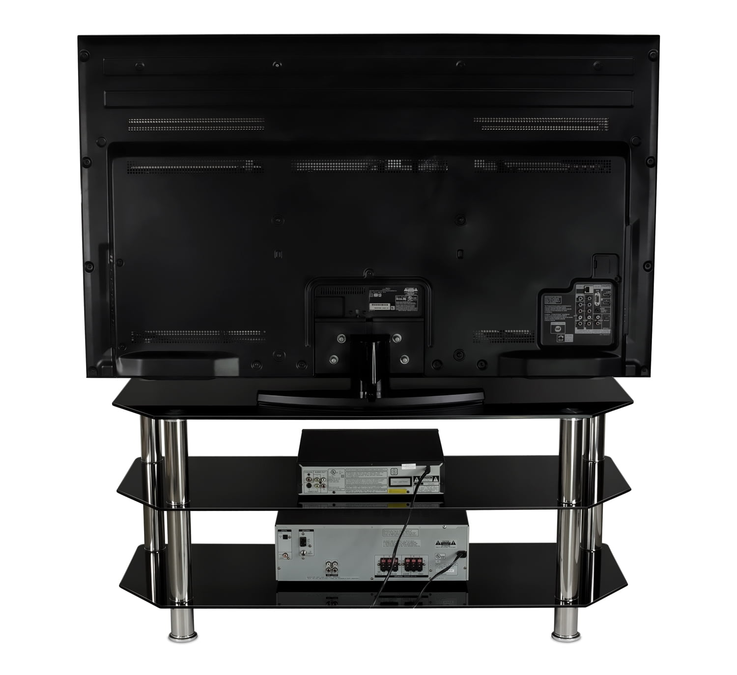 UNIVERSAL ENTERTAINMENT CENTER – Fits all TVs between 40″ and 60″ in screen size. TEMPERED GLASS TV CONSOLE – 8 mm thick black tempered glass with 143 lbs. (top shelf) carrying capacity securely supports your TV and AV components such as cable boxes, DVD players, streaming devices, gaming devices, and receivers. CORNER TV MEDIA STAND – Angled sides make it perfect to place the TV stand in a corner. Open shelf design allows easy access for installation and excellent ventilation to prevent overheating. BLACK TV STANDS – Black tempered glass and shiny chrome legs for a modern and contemporary look. EASY ASSEMBLY – No tools are required for assembly. Set up in minutes by one person. Assembled dimensions: 45″ W x 20″ H x 17.75″ D.