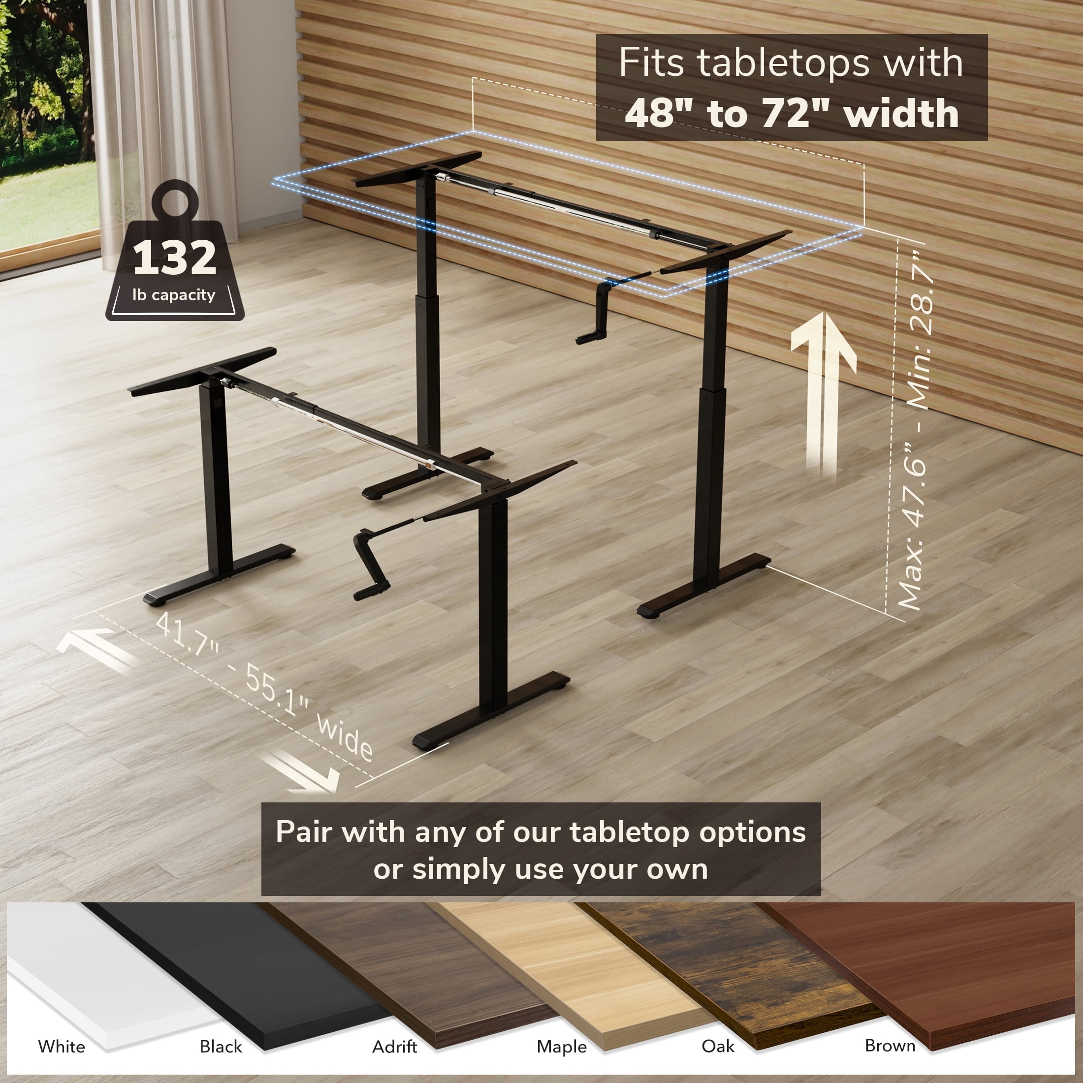 MI-7931 can support up to 132 lbs. and the width can be adjusted from 44″ to 64″ to support most available tabletops Recommended tabletop size is between 45″ and 86″ wide and 27″ to 40″ deep, and 1″ or greater thickness (tabletop not included) Easy to use crank system adjusts the height of the desk between sitting and standing positions and makes this frame affordable and maintenance free Two segment telescoping legs adjust the height of the desk between 30″ and 48″ Excellent ergonomic desk solution for anyone who wants to work healthier on a budget Material: Steel and plastic Height range: 30″ to 48″ Width range: 44″ to 64″ Weight Capacity: 132 lbs Recommended tabletop size: 45″ to 86″ inch wide, 27″ to 40″ and 1″ thick or greater
