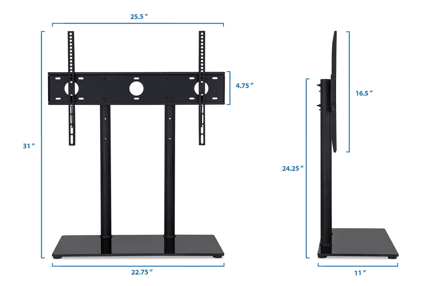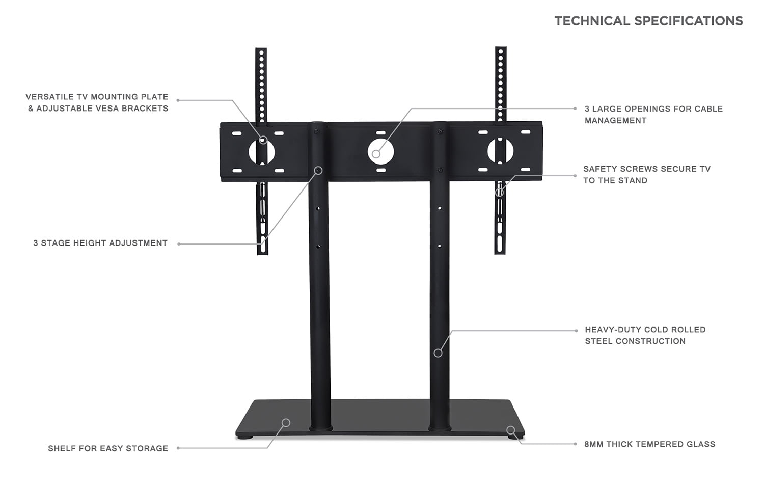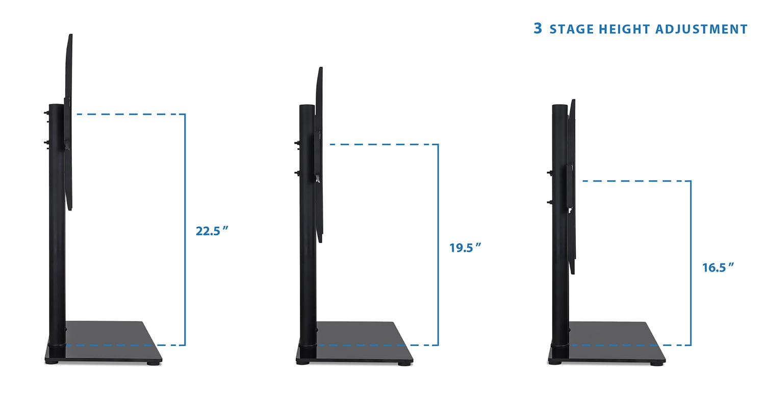 MI-846 is compatible with TVs up to 60″ Elevate your TV and open up space on your entertainment stand High-strength steel columns can hold large TVs weighing up to 88 lbs. 3 stage height adjustments allow you to set your TV at the perfect height Compatibility: VESA patterns up to 600mm x 400mm and screens up to 60″ Weight capacity: 88 lbs. Height settings: 3 presets – 16.5″, 19.5″, 22.5″ Shelf dimensions: 24″ (W) x 11″ (D) Materials: Black tempered glass, steel
